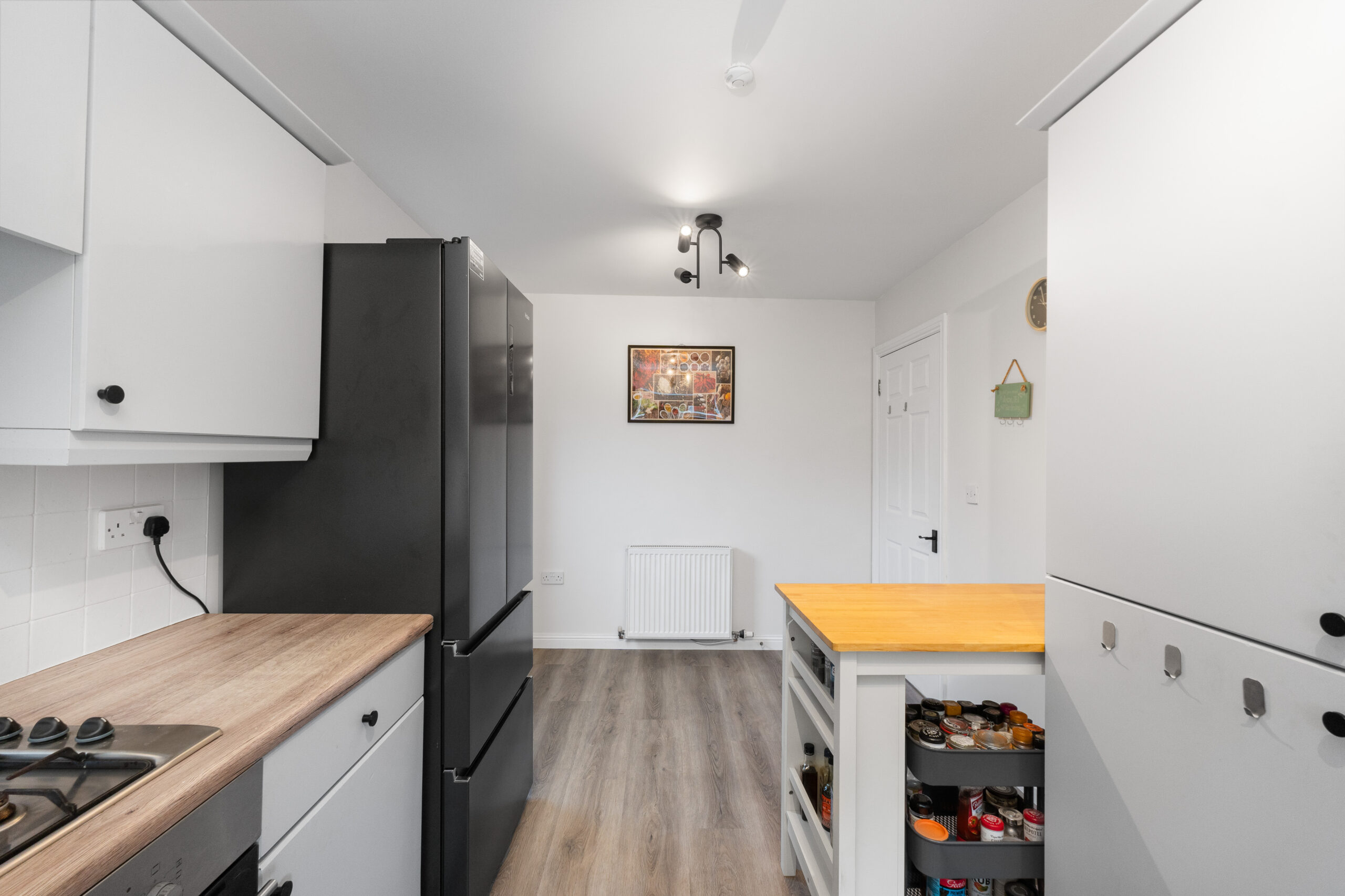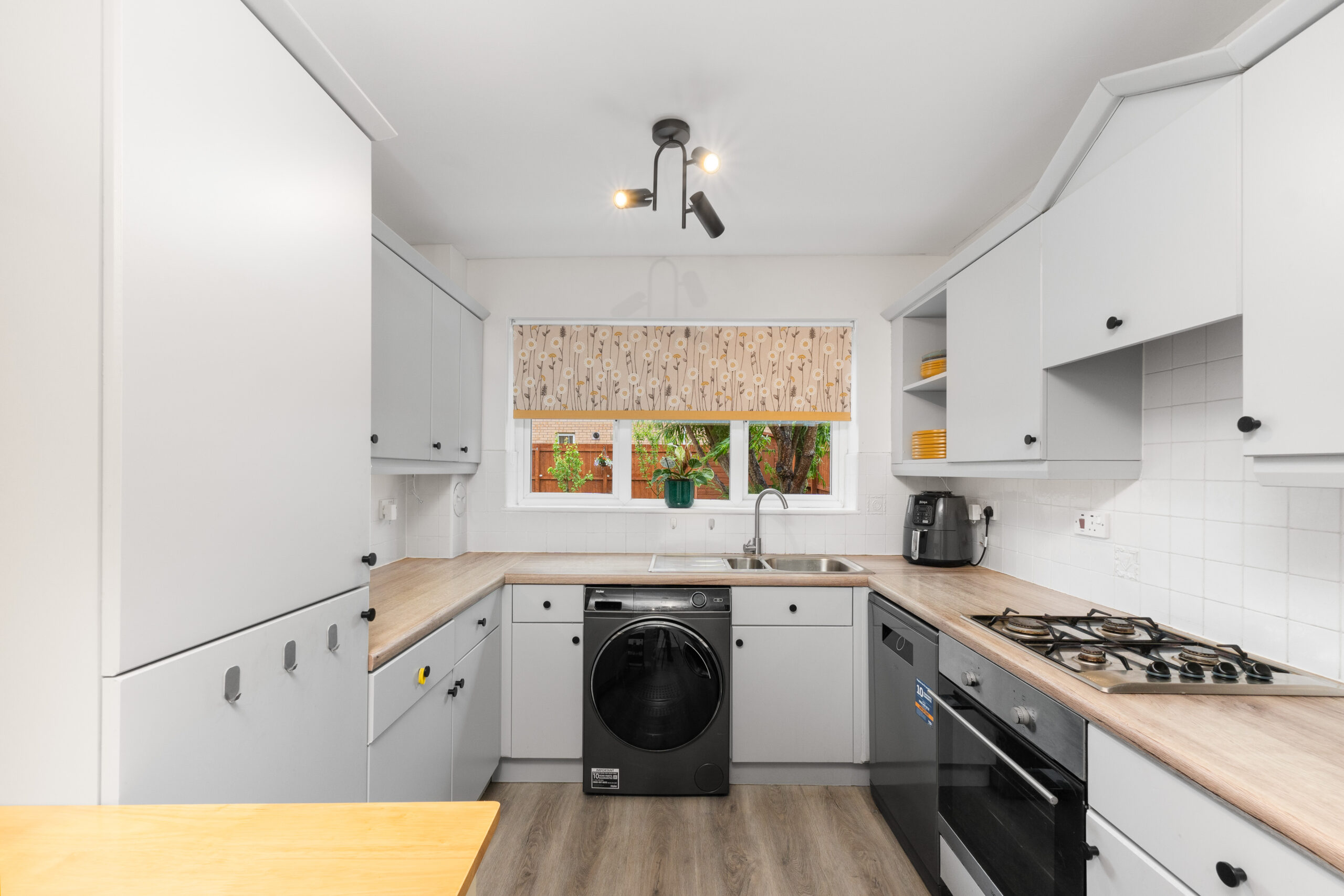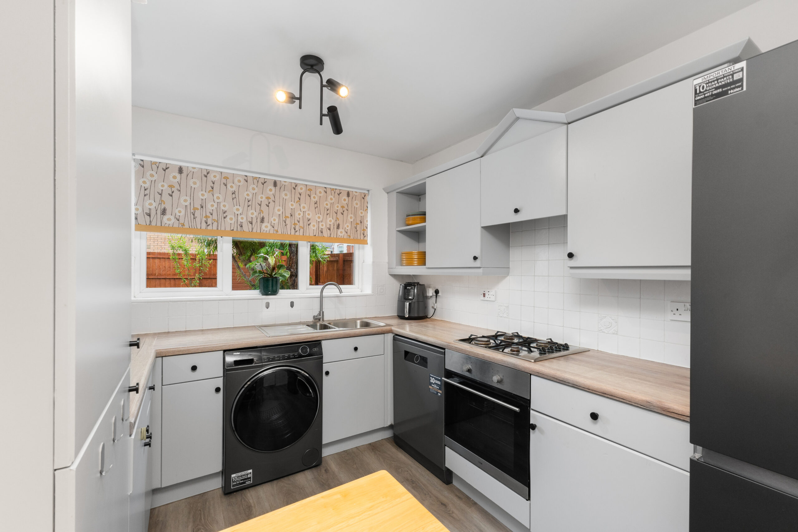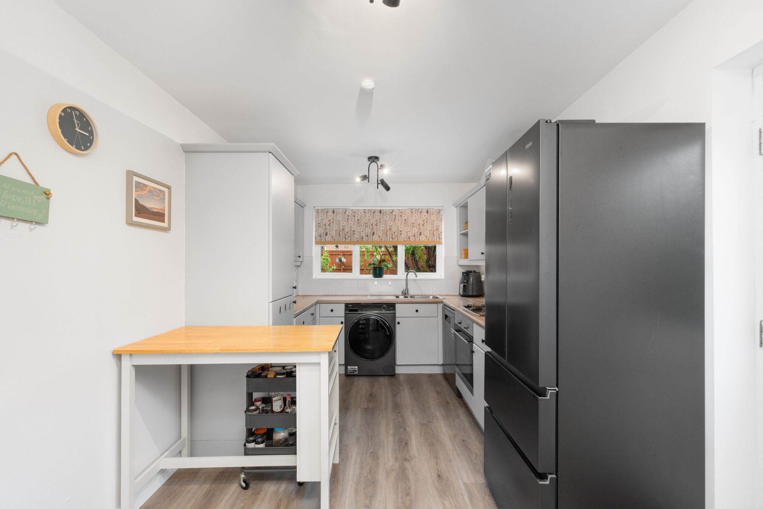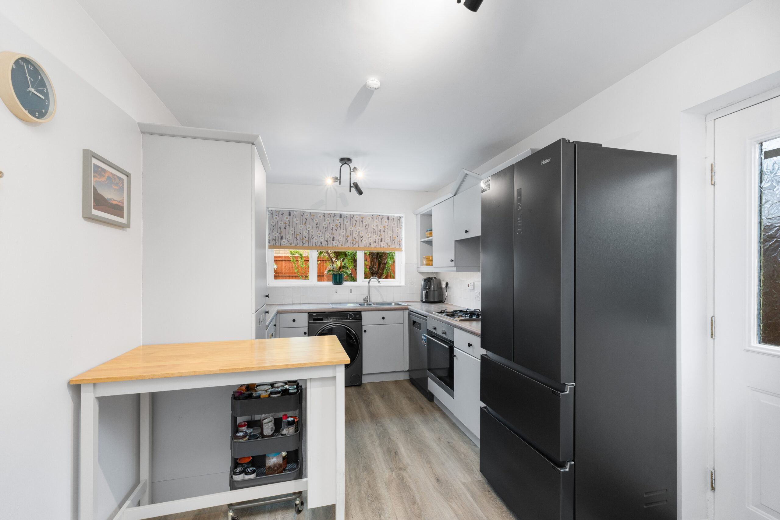 The kitchen is fitted with a range of base and wall units, complemented by quality worktops and tiled splashbacks. Integrated appliances include an oven and gas hob, with further space provided for a free-standing dishwasher, washing machine, and fridge/freezer. A door from the kitchen provides convenient access to the side of the property.