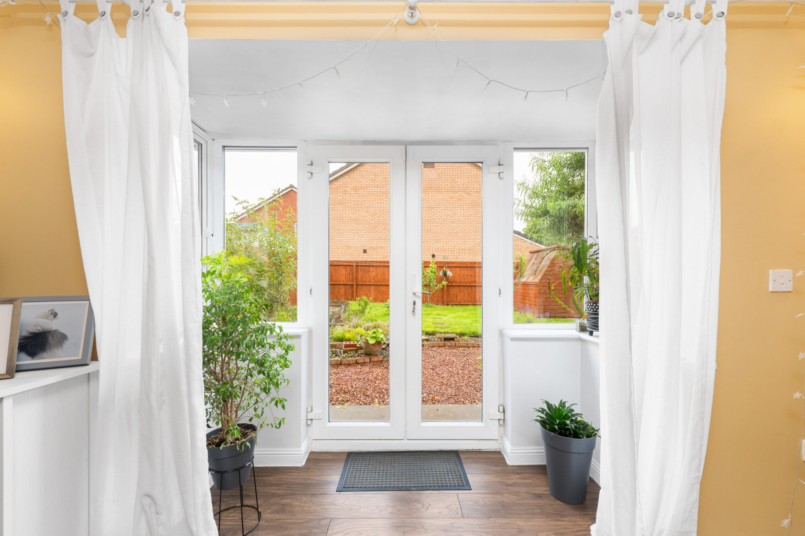 Extras: Floor coverings, blinds, curtains, potting shed, integrated oven, hob, free-standing dishwasher and metal white table and two chairs in the garden.