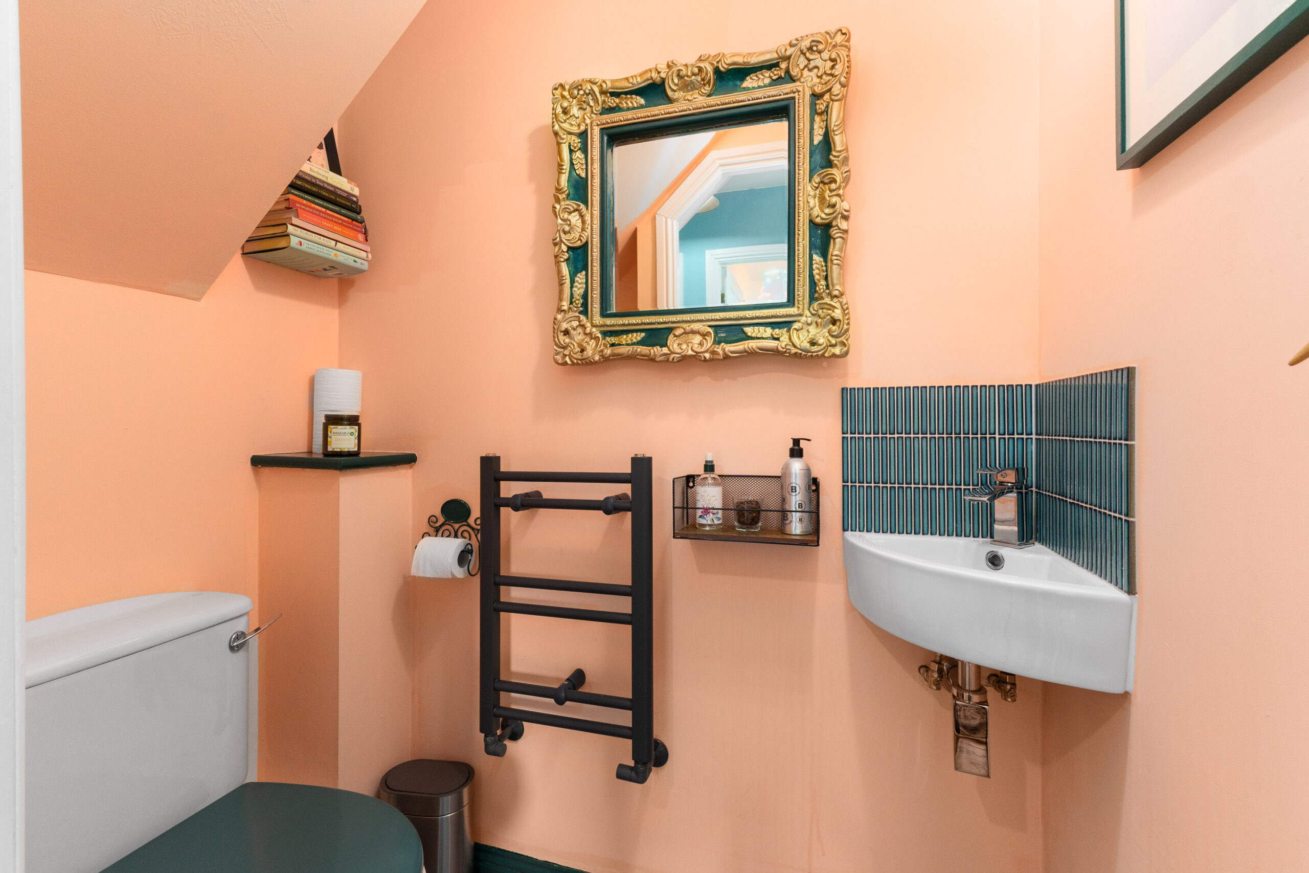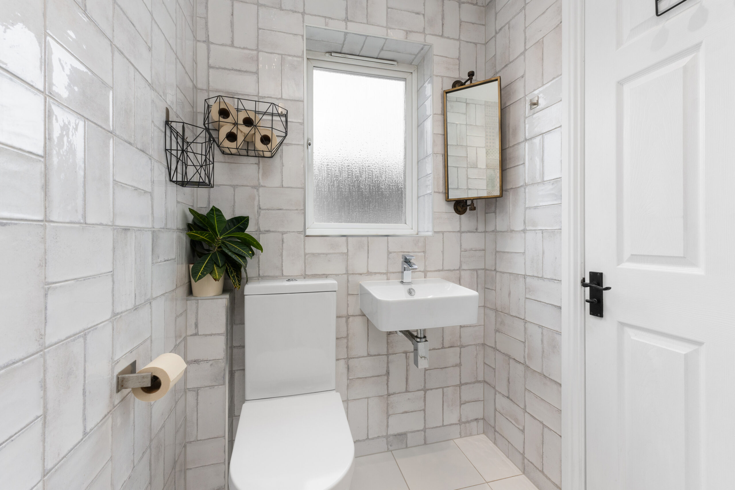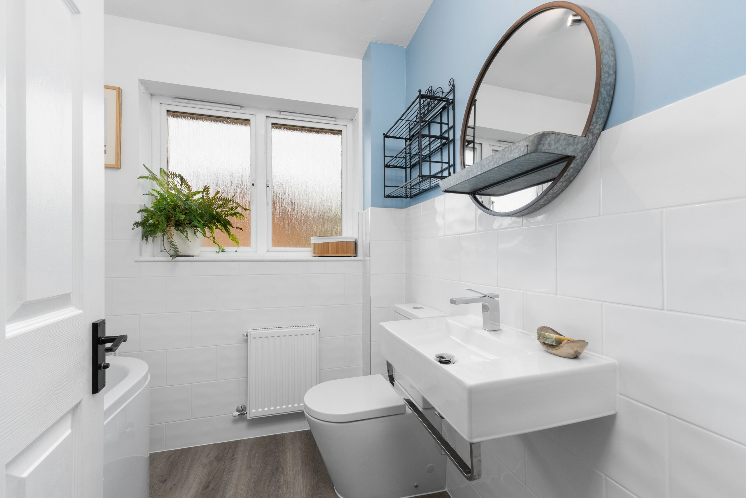 Also on the ground floor is a stylish cloakroom, featuring a white WC and wash hand basin, enhanced by a contemporary black heated towel rail.