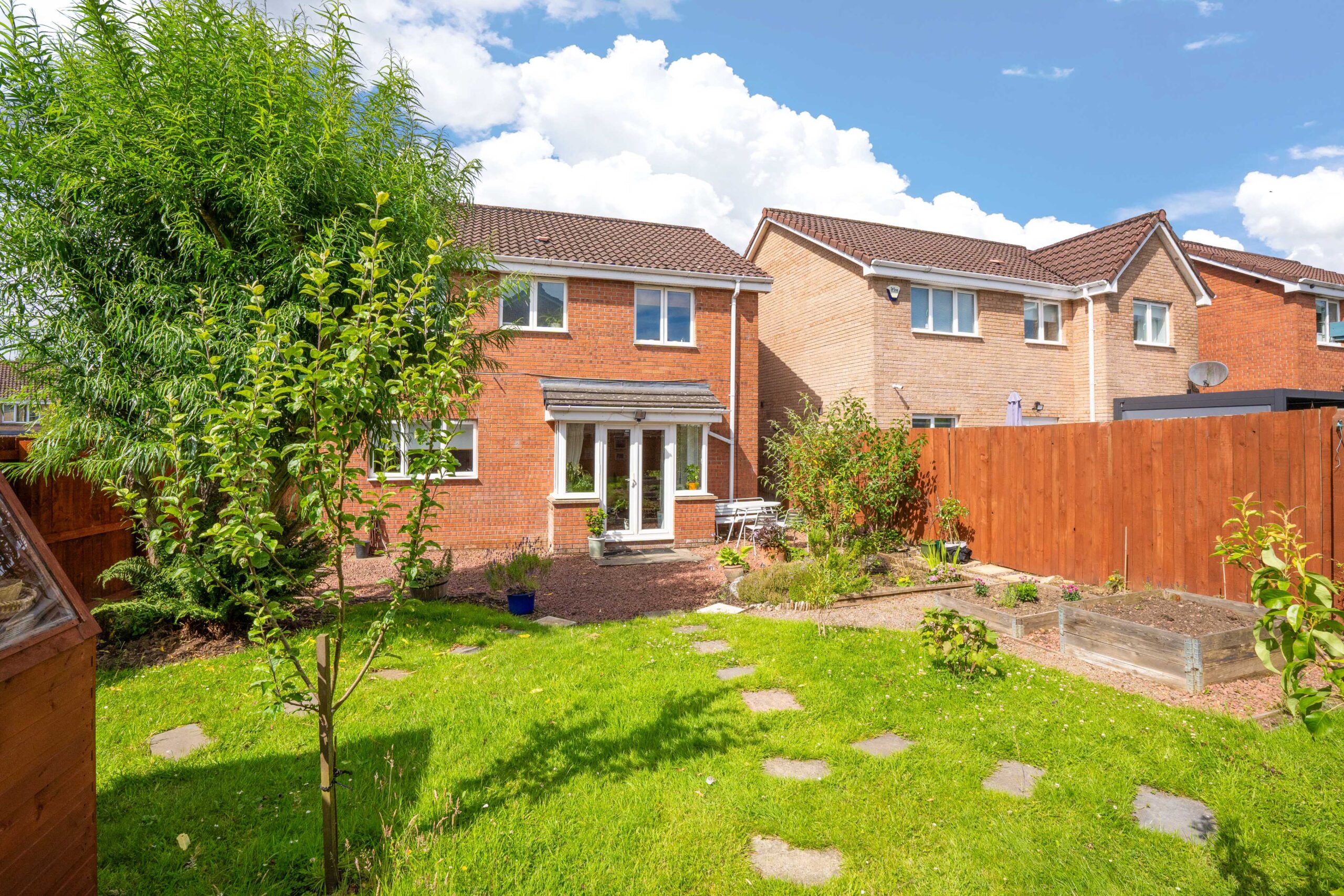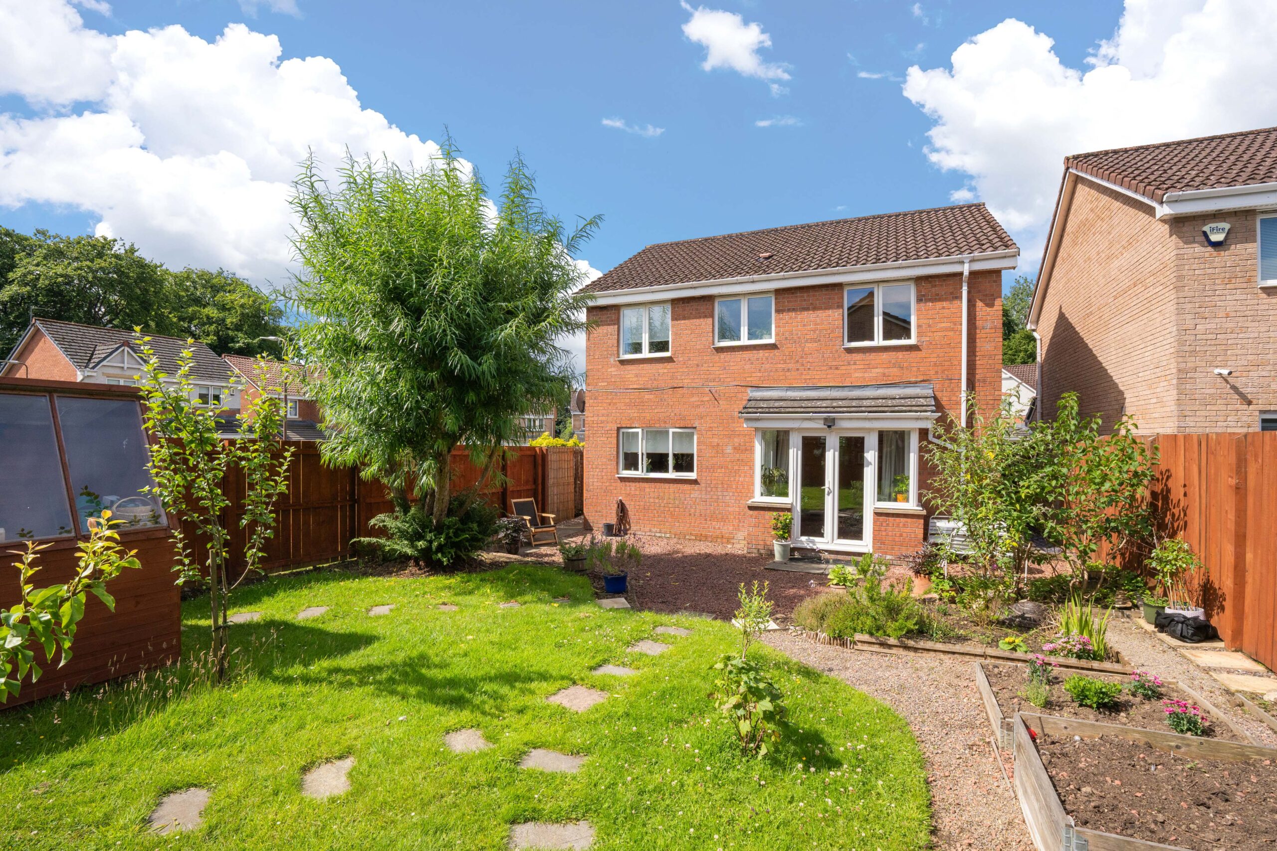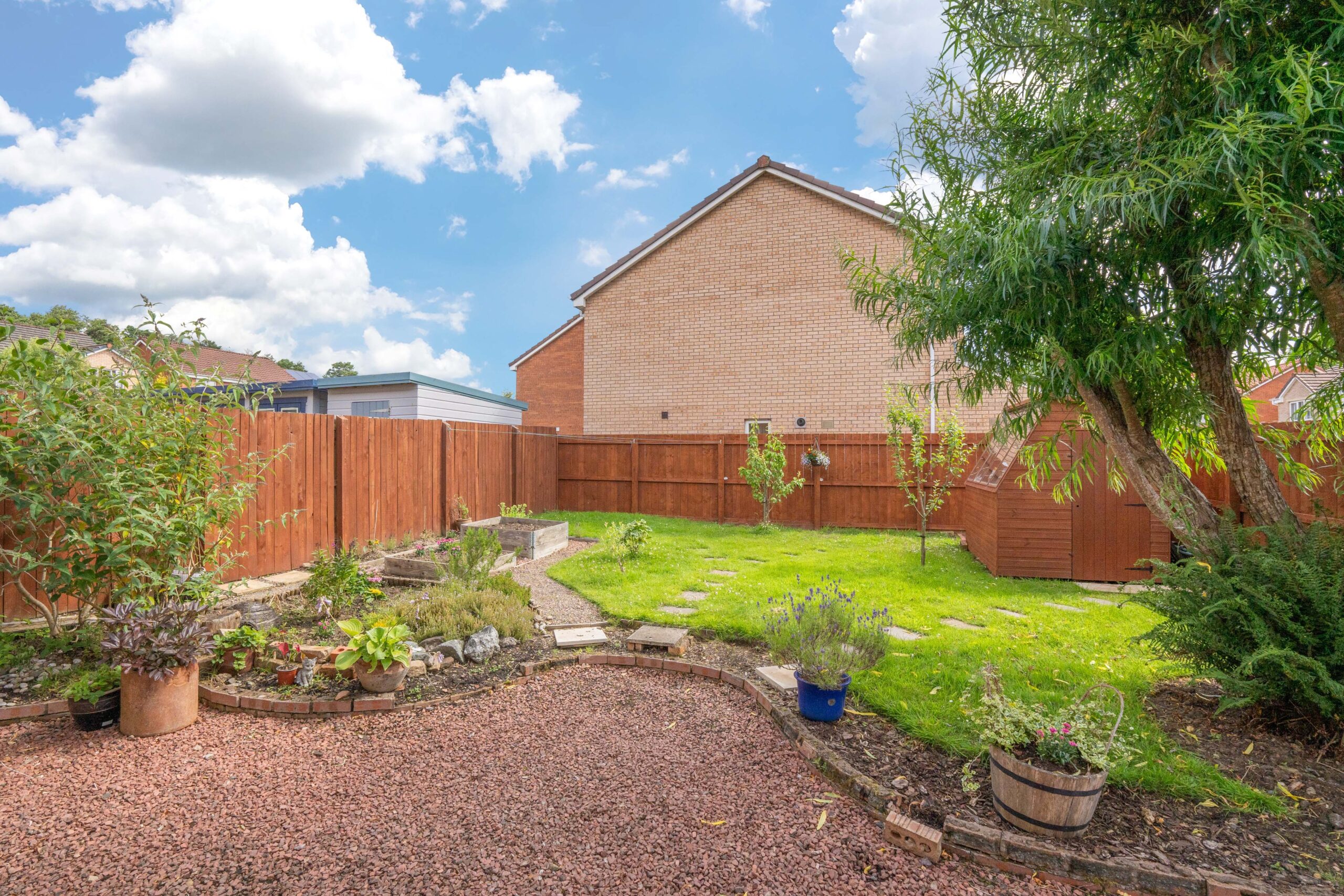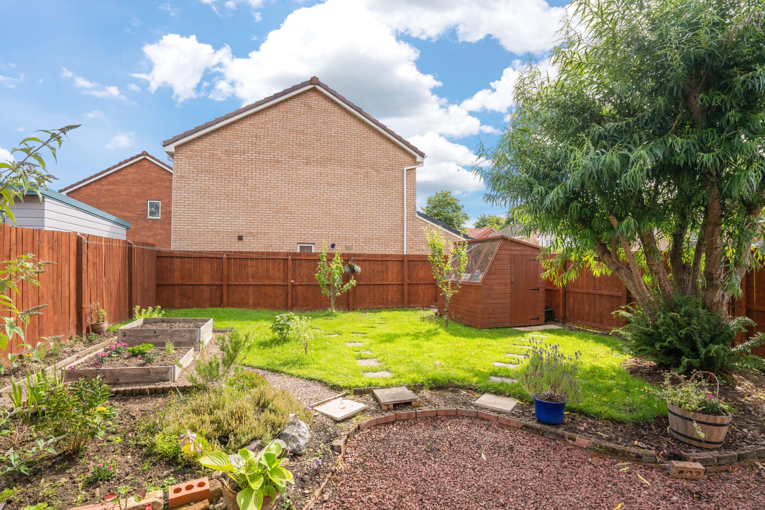 The rear garden is a real haven for garden lovers and those who enjoy outdoor living. Laid to lawn and decorative chips, it includes a potting shed, raised planting beds, and a beautiful mix of established trees and shrubs. A mature willow tree adds a magical focal point, making this garden both practical and peaceful-ideal for children, entertaining, or simply enjoying nature.