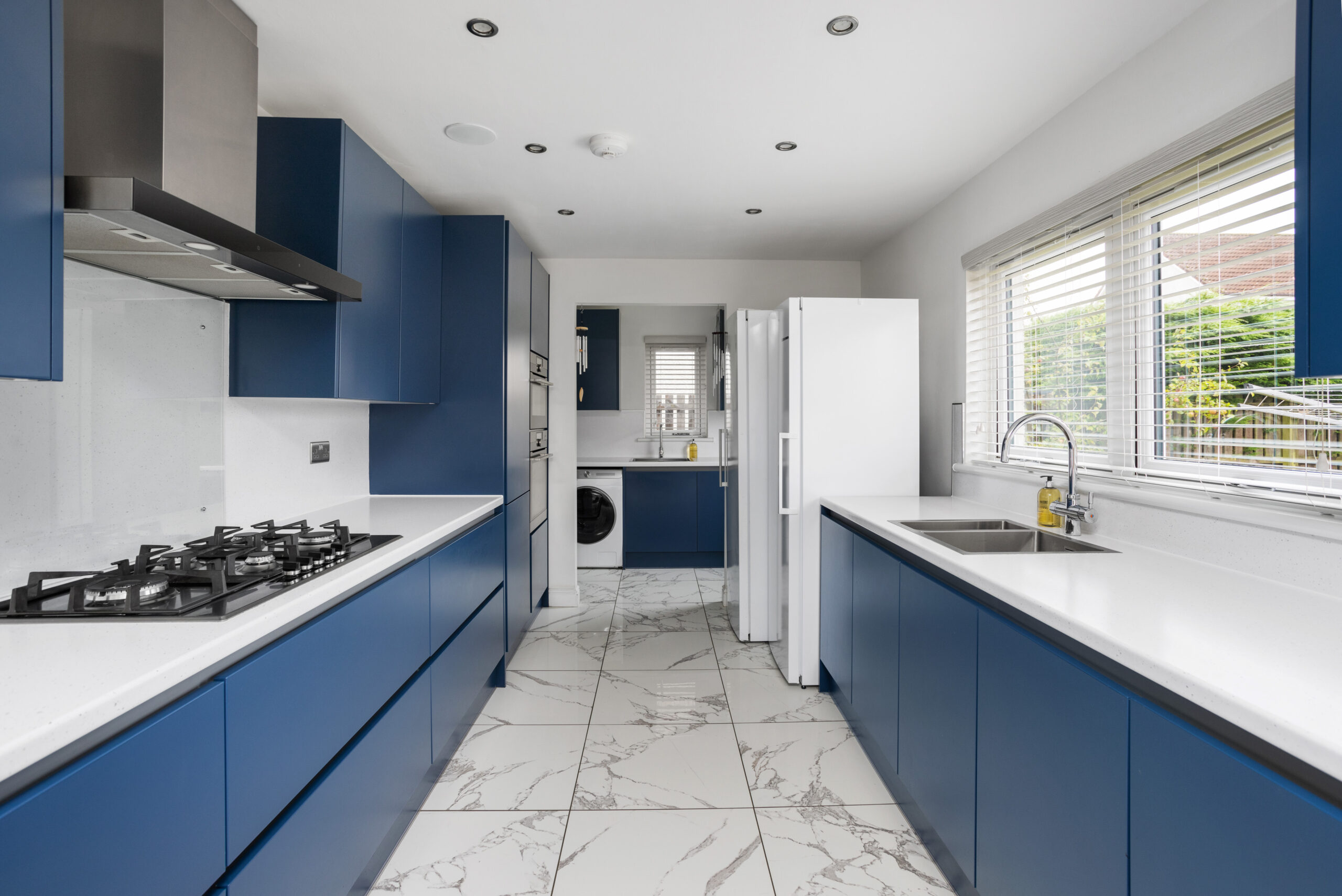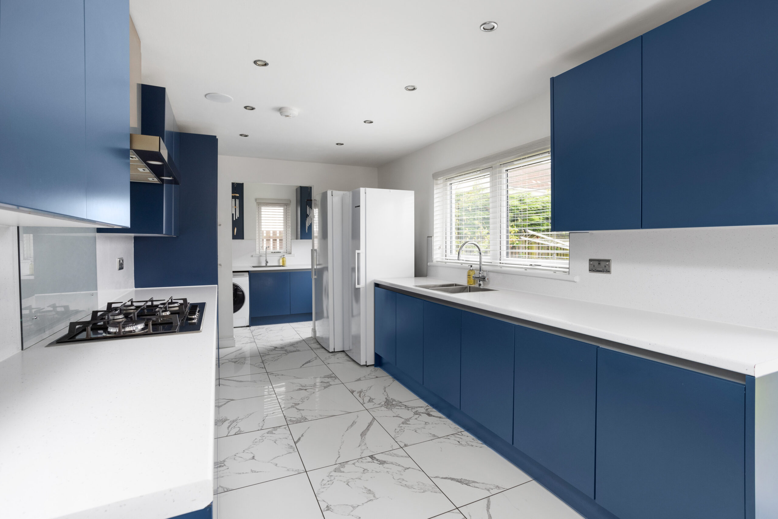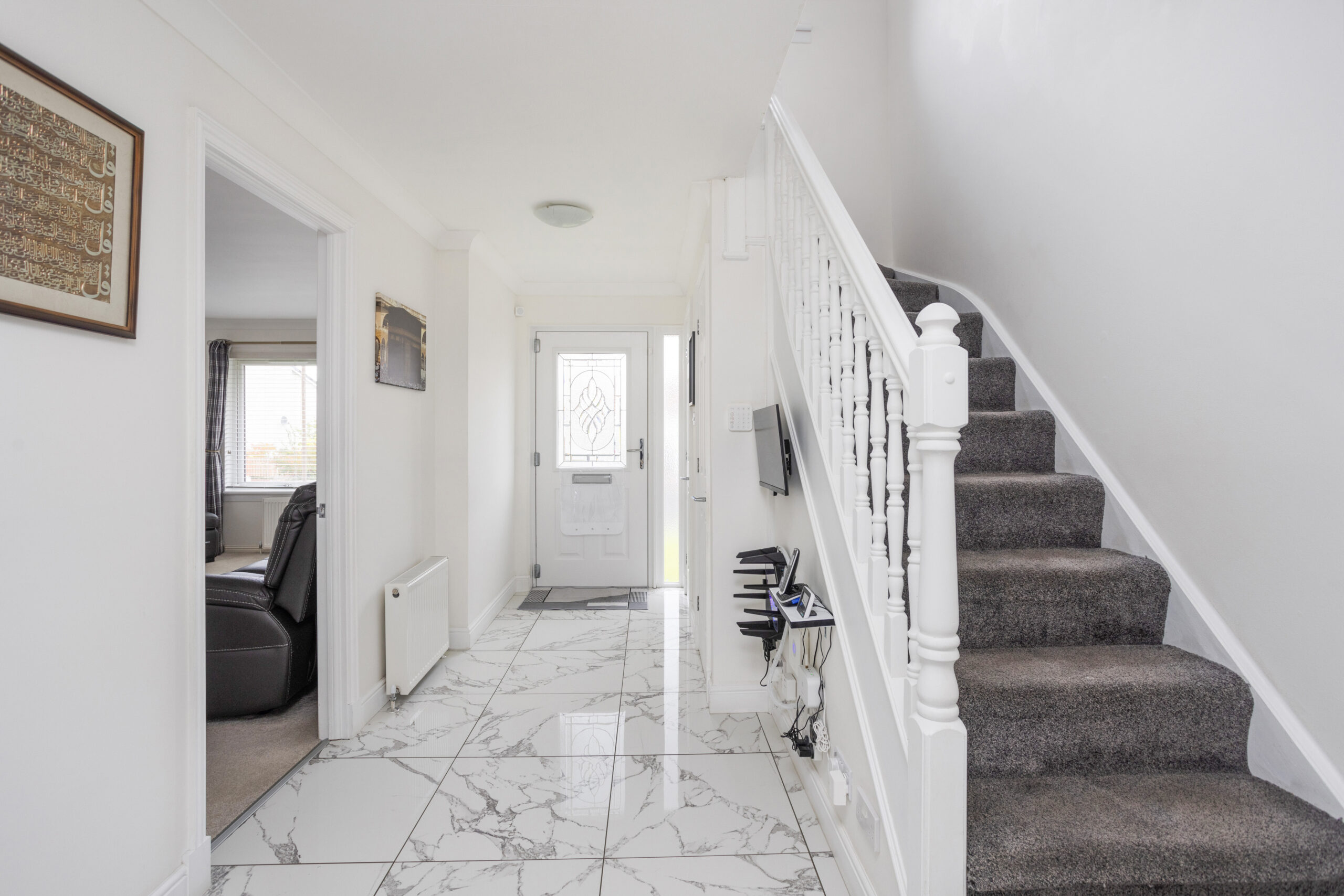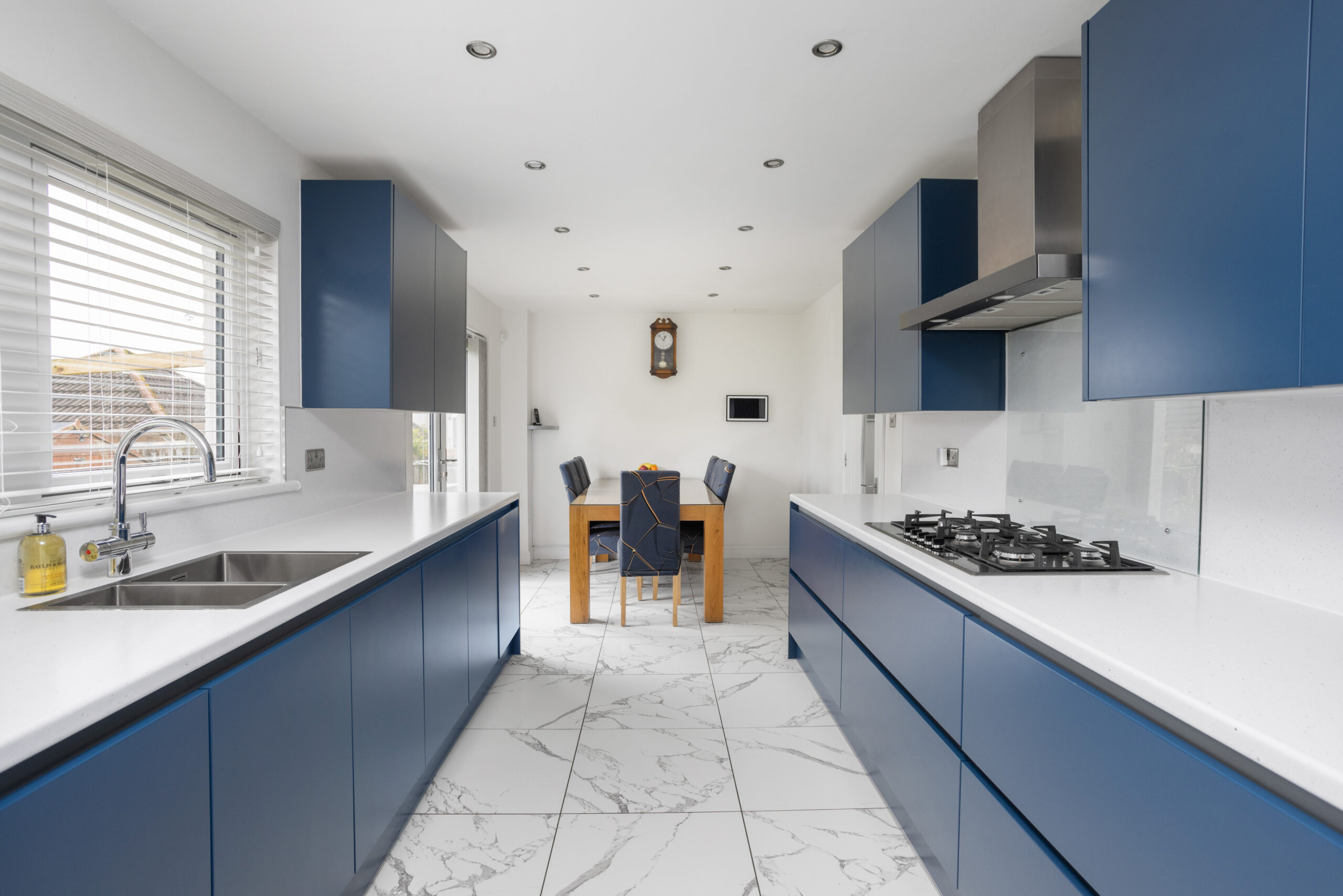 From the moment you arrive, the house exudes kerb appeal. A neatly manicured front garden and a double driveway create an inviting first impression, while the welcoming entrance hallway, with its gleaming porcelain tiles and warm wooden banister, offers a sophisticated introduction to the home's elegant interiors. Step into the bright and expansive lounge, where a stylish gas fireplace serves as the room's cosy focal point. The space is flooded with natural light, creating a relaxing atmosphere perfect for family gatherings or quiet evenings in. Adjacent to the lounge, the heart of the home, the contemporary kitchen/diner awaits. This family-friendly hub is equipped with striking blue cabinetry and a suite of integrated modern appliances, including an oven, combi oven/microwave, five-burner gas hob and space for a free-standing full-sized fridge and freezer. The sleek porcelain tiles from the hallway flow seamlessly into the kitchen, emphasizing the continuity and openness of the ground floor. French doors open onto a beautifully maintained rear garden, where a lush lawn, two garden sheds, and a paved patio offer the perfect setting for outdoor entertaining or a peaceful retreat. The garden is fully enclosed, providing a safe space for children to play and ample room for relaxation.
