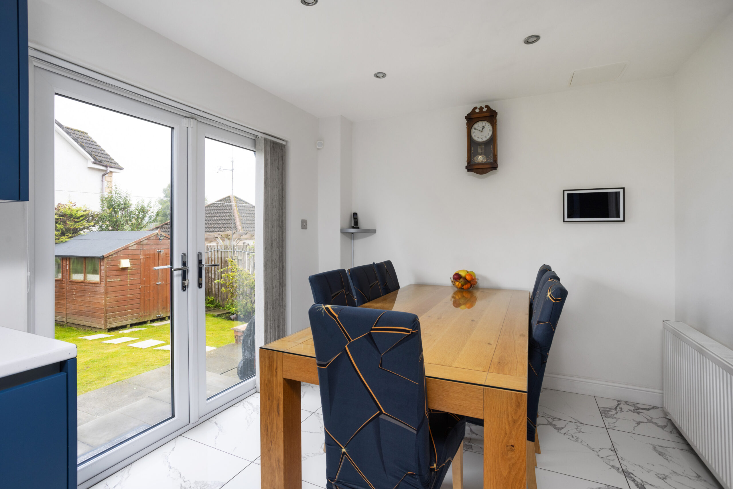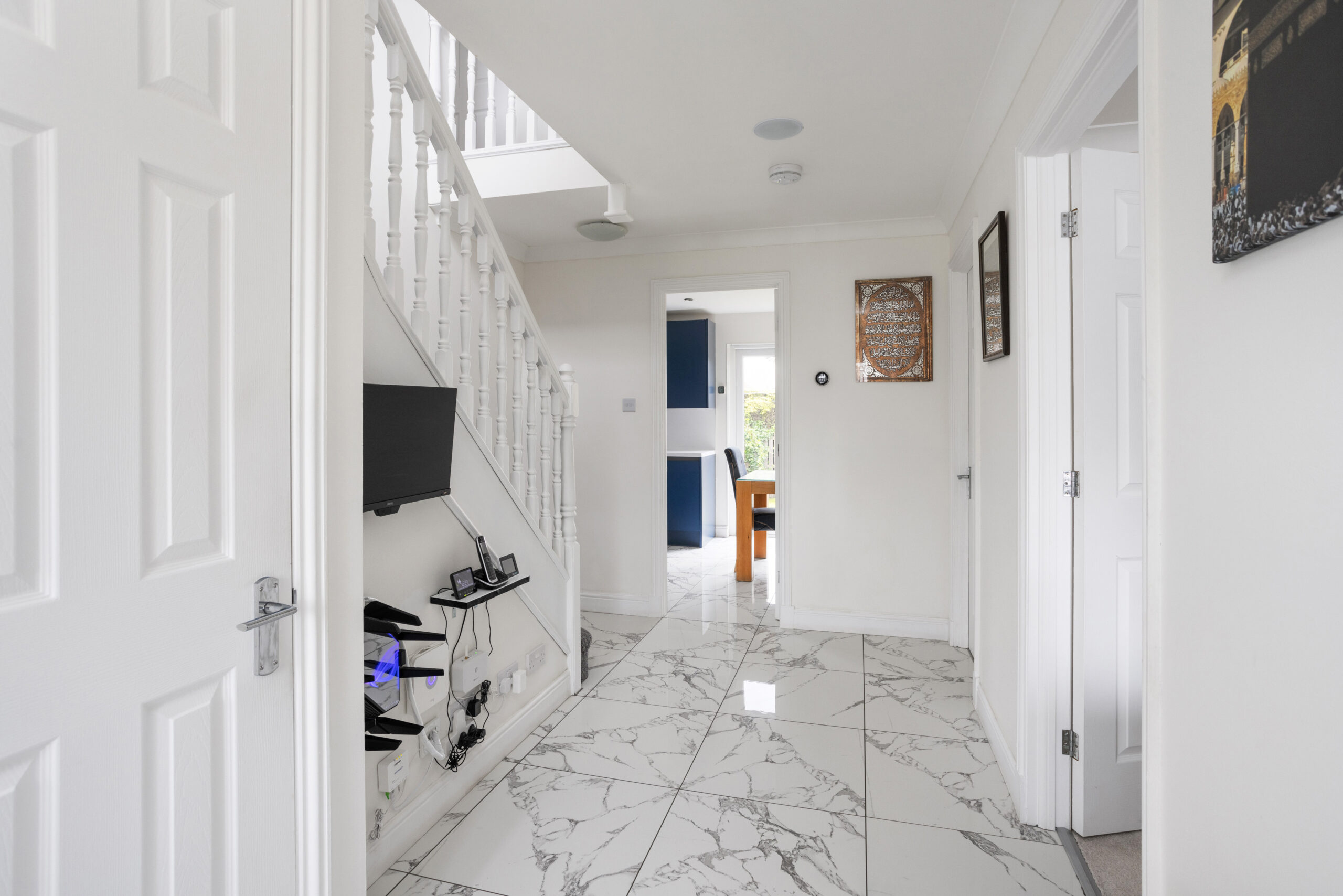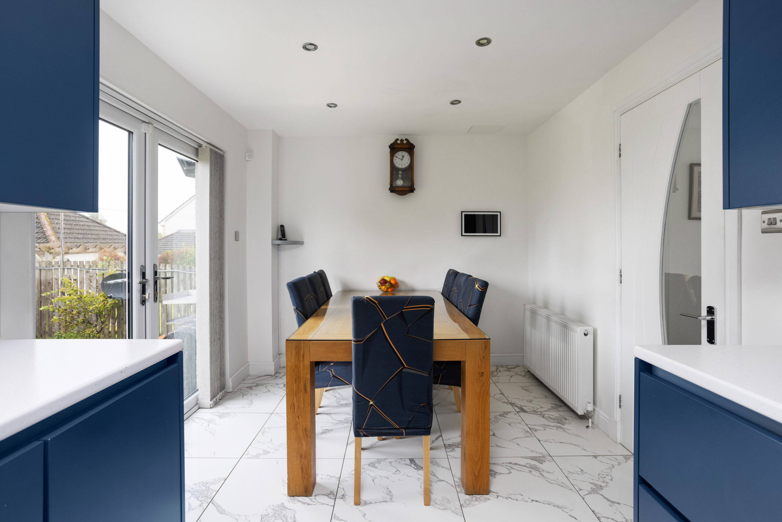 From the moment you arrive, the house exudes kerb appeal. A neatly manicured front garden and a double driveway create an inviting first impression, while the welcoming entrance hallway, with its gleaming porcelain tiles and warm wooden banister, offers a sophisticated introduction to the home's elegant interiors. Step into the bright and expansive lounge, where a stylish gas fireplace serves as the room's cosy focal point. The space is flooded with natural light, creating a relaxing atmosphere perfect for family gatherings or quiet evenings in. Adjacent to the lounge, the heart of the home, the contemporary kitchen/diner awaits. This family-friendly hub is equipped with striking blue cabinetry and a suite of integrated modern appliances, including an oven, combi oven/microwave, five-burner gas hob and space for a free-standing full-sized fridge and freezer. The sleek porcelain tiles from the hallway flow seamlessly into the kitchen, emphasizing the continuity and openness of the ground floor. French doors open onto a beautifully maintained rear garden, where a lush lawn, two garden sheds, and a paved patio offer the perfect setting for outdoor entertaining or a peaceful retreat. The garden is fully enclosed, providing a safe space for children to play and ample room for relaxation.