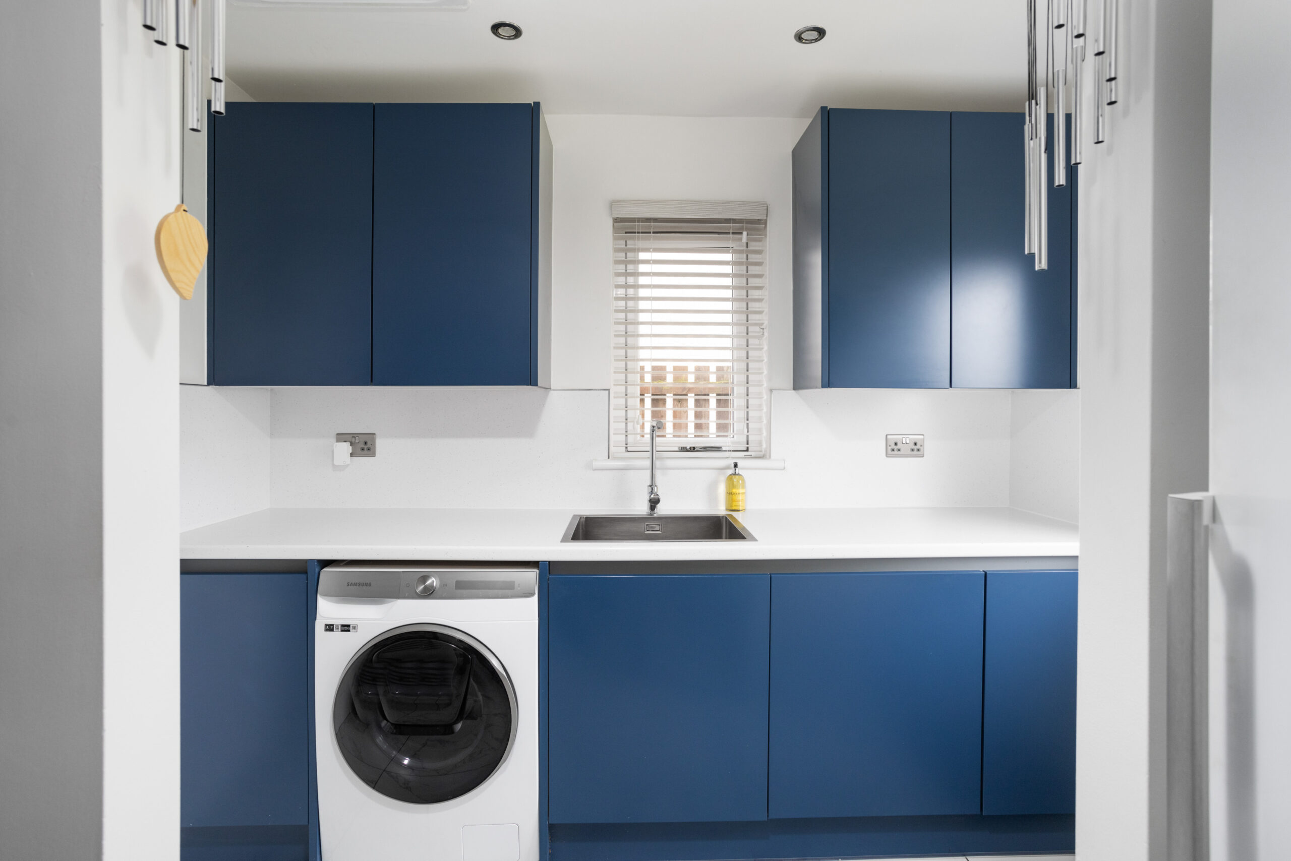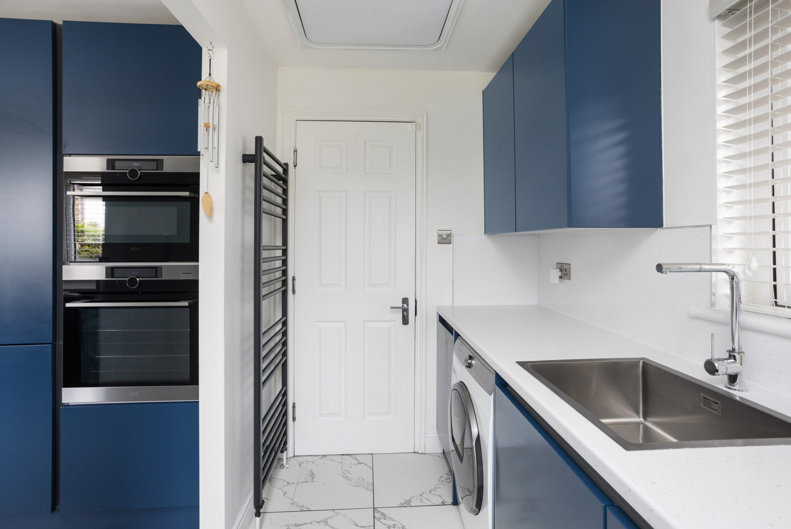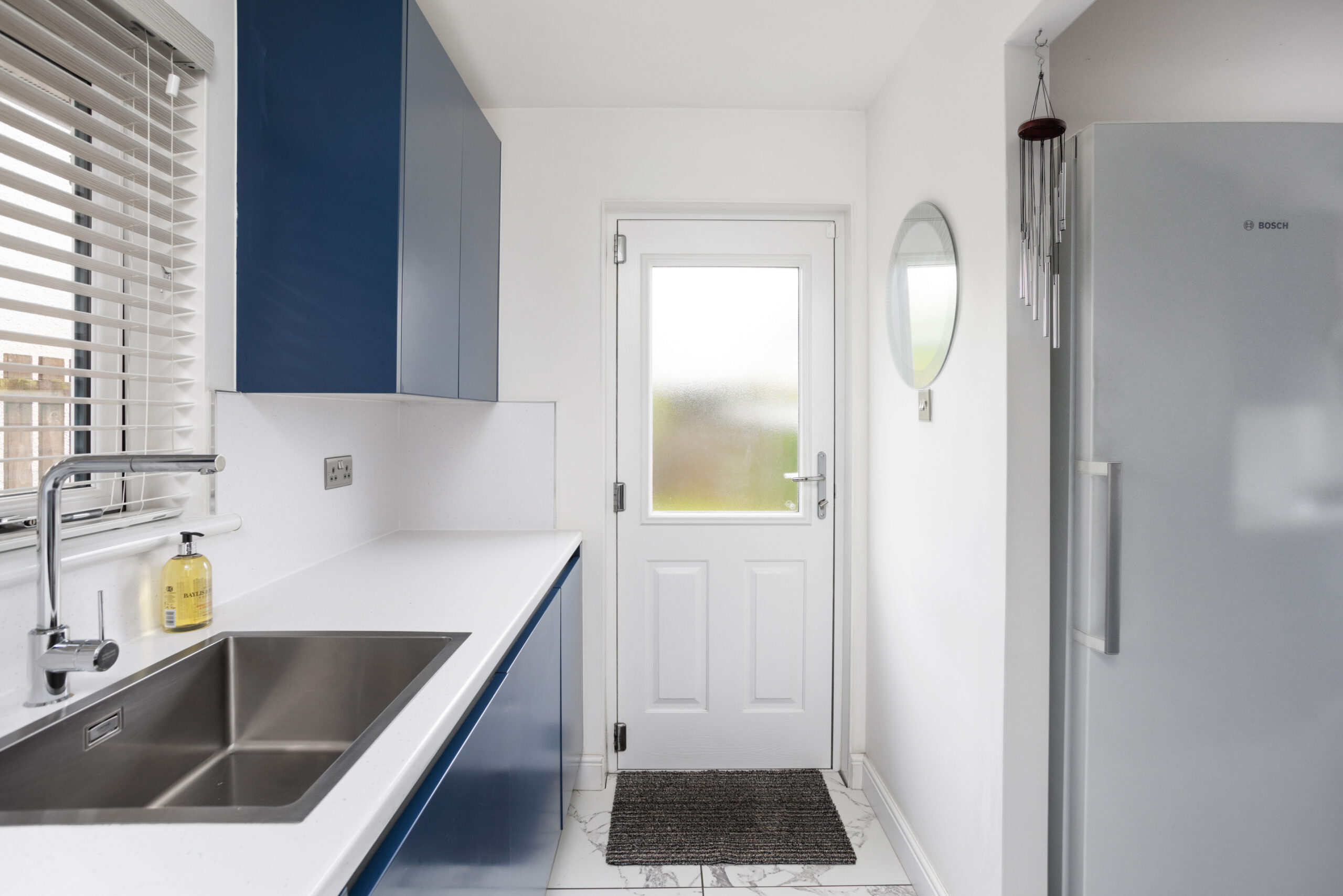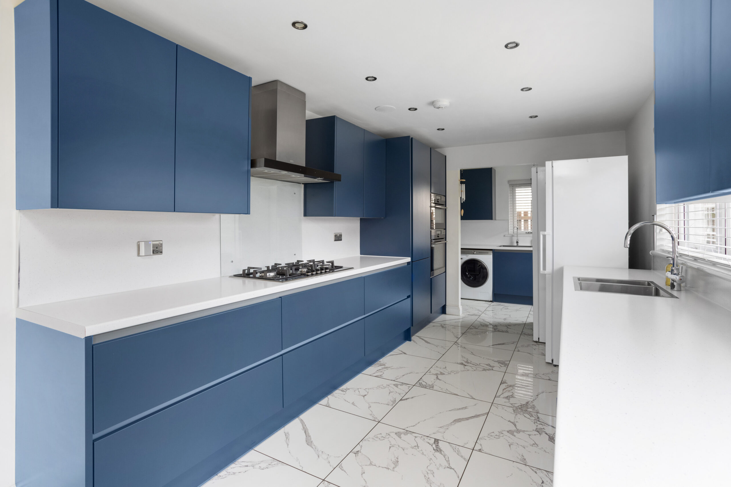 From the moment you arrive, the house exudes kerb appeal. A neatly manicured front garden and a double driveway create an inviting first impression, while the welcoming entrance hallway, with its gleaming porcelain tiles and warm wooden banister, offers a sophisticated introduction to the home's elegant interiors. Step into the bright and expansive lounge, where a stylish gas fireplace serves as the room's cosy focal point. The space is flooded with natural light, creating a relaxing atmosphere perfect for family gatherings or quiet evenings in. Adjacent to the lounge, the heart of the home, the contemporary kitchen/diner awaits. This family-friendly hub is equipped with striking blue cabinetry and a suite of integrated modern appliances, including an oven, combi oven/microwave, five-burner gas hob and space for a free-standing full-sized fridge and freezer. The sleek porcelain tiles from the hallway flow seamlessly into the kitchen, emphasizing the continuity and openness of the ground floor. French doors open onto a beautifully maintained rear garden, where a lush lawn, two garden sheds, and a paved patio offer the perfect setting for outdoor entertaining or a peaceful retreat. The garden is fully enclosed, providing a safe space for children to play and ample room for relaxation.