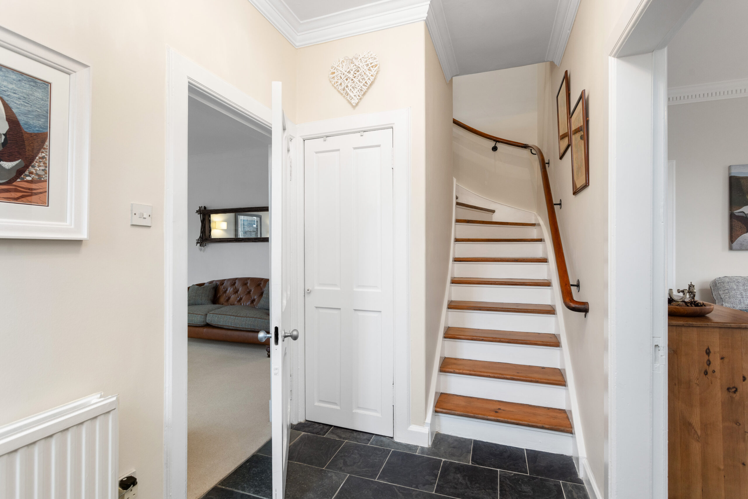 Steeped in character and rich with history, 9 Ecclesmachan Road is a remarkable Victorian semi-detached stone built residence dating back to 1893. Once serving the community as the local police station it briefly became the Conscription office during the first world war, the property has since evolved into an extraordinary family home. Its story, charm and soul are evident from the moment you arrive, with timeless period features seamlessly paired with thoughtful contemporary upgrades. This is a home that balances old-world elegance with modern comfort to a truly captivating effect. Behind its pretty red front door lies a home that has been meticulously cared for and beautifully presented. The hallway, laid with attractive slate tiles, sets the tone for the blend of heritage and modern style found throughout. From here, doors open to the lounge and ground-floor bedroom, while a handy storage cupboard and a striking wood and glass staircase immediately catch the eye, guiding you gracefully to the upper level.
