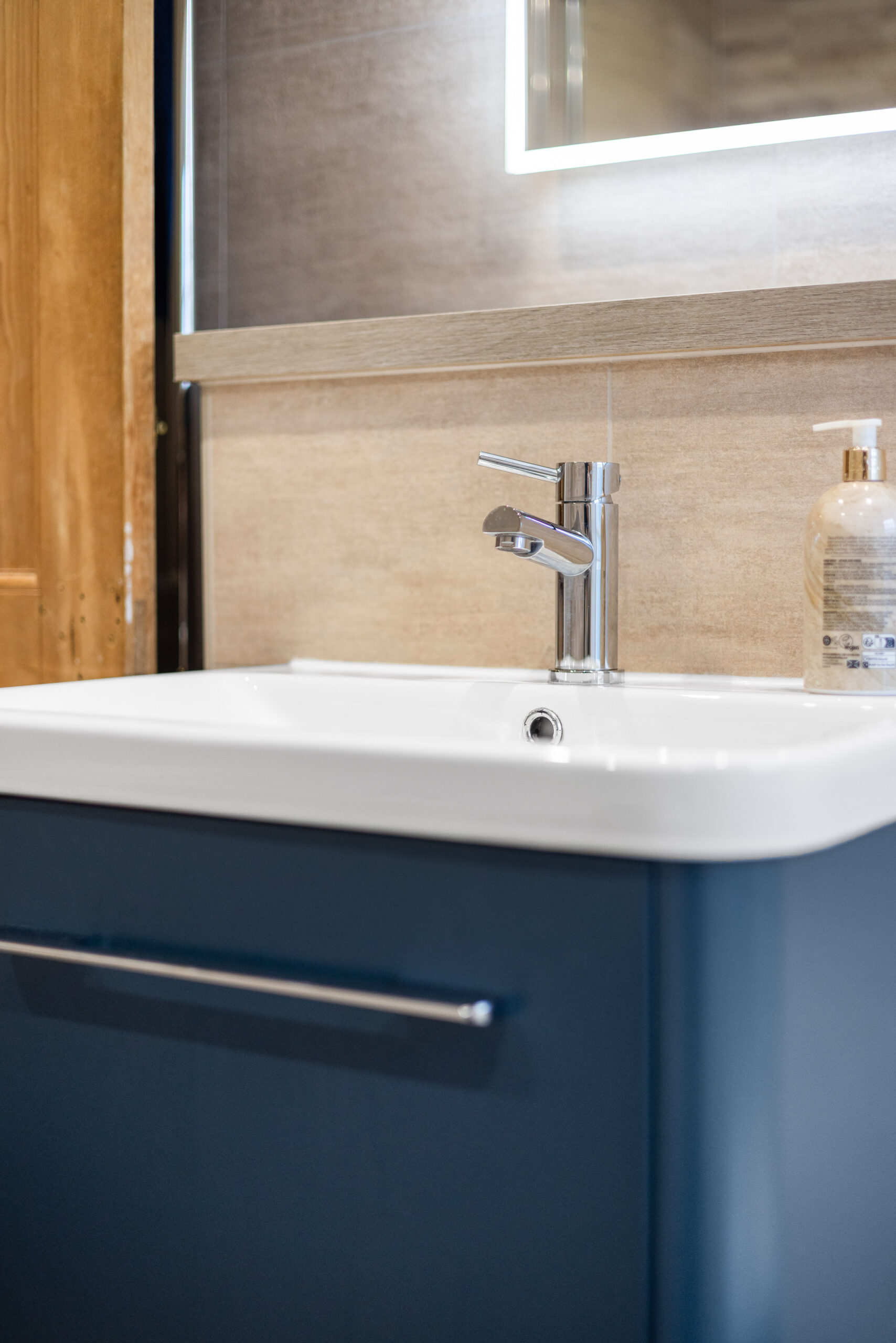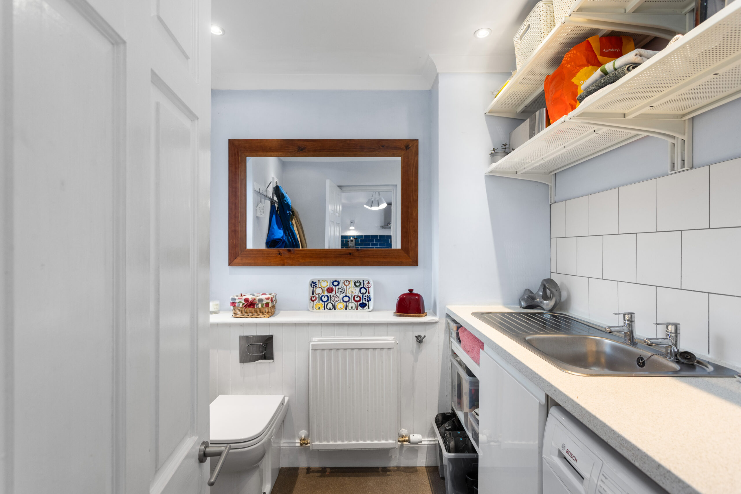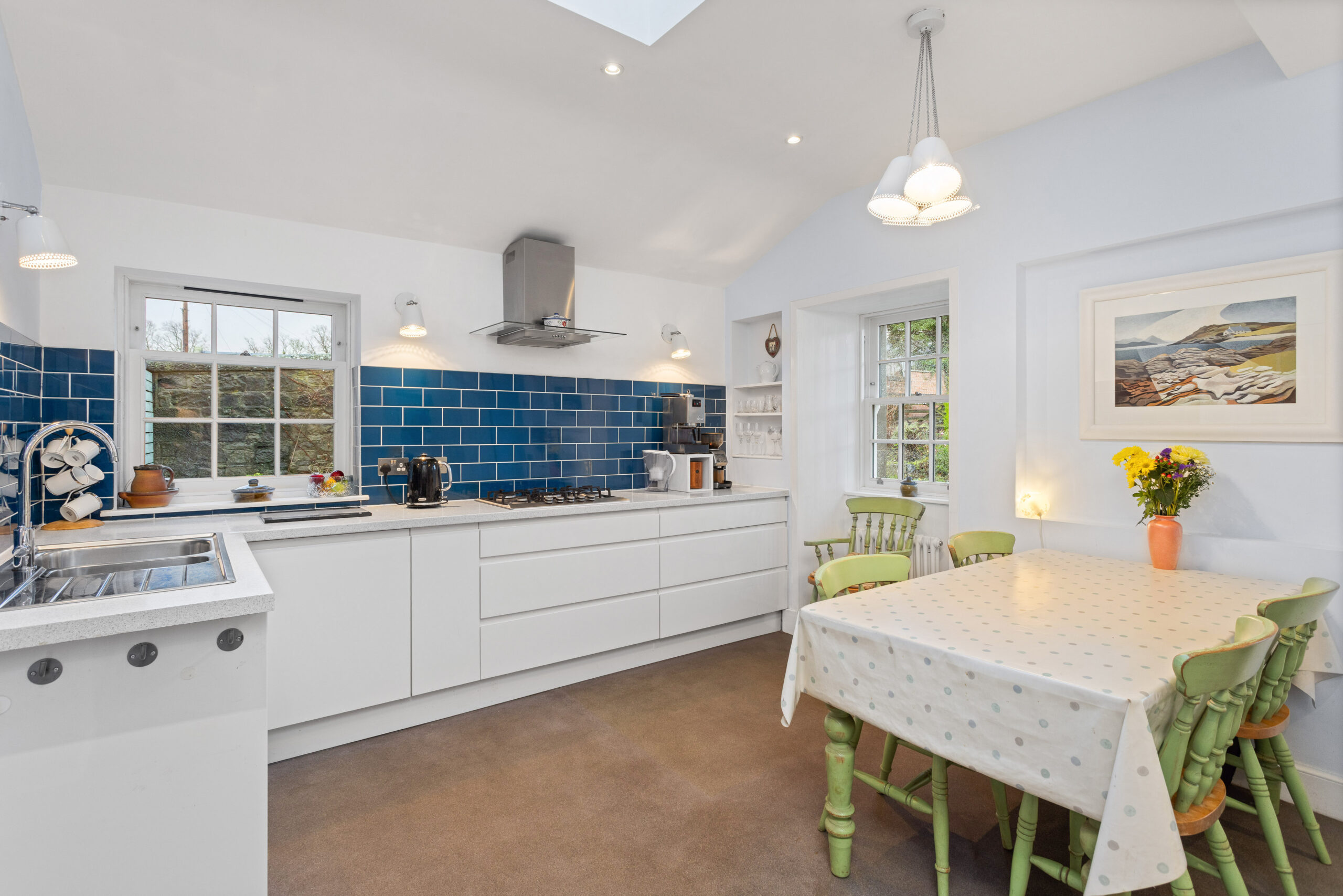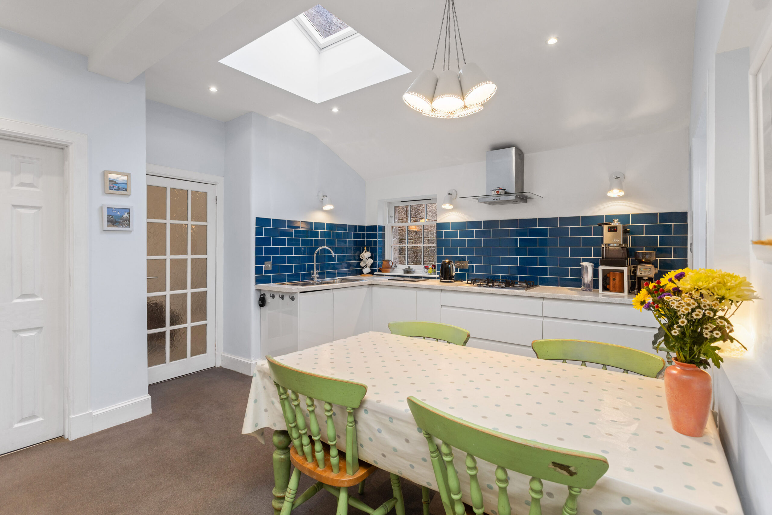 The kitchen is a delightful blend of modern design and cosy character, offering ample space for a dining table and chairs. High-gloss white cabinetry is paired with bold blue tiles for a stylish contrast, while integrated appliances include an oven, microwave, 5-burner gas hob, fridge/freezer and a cleverly designed integrated bin store. A wonderful skylight floods the room with natural light, complemented by a column radiator and spotlights for a polished finish. A door leads directly onto the garden patio, perfect for relaxing in the evening, and from the kitchen, you also gain access to both the utility/pantry and the separate utility/cloakroom. The utility/pantry provides invaluable storage space and houses the boiler, while the cloakroom offers a white WC, sink and plumbing for a washing machine and space for a tumble dryer-thoughtfully designed for day-to-day convenience.
