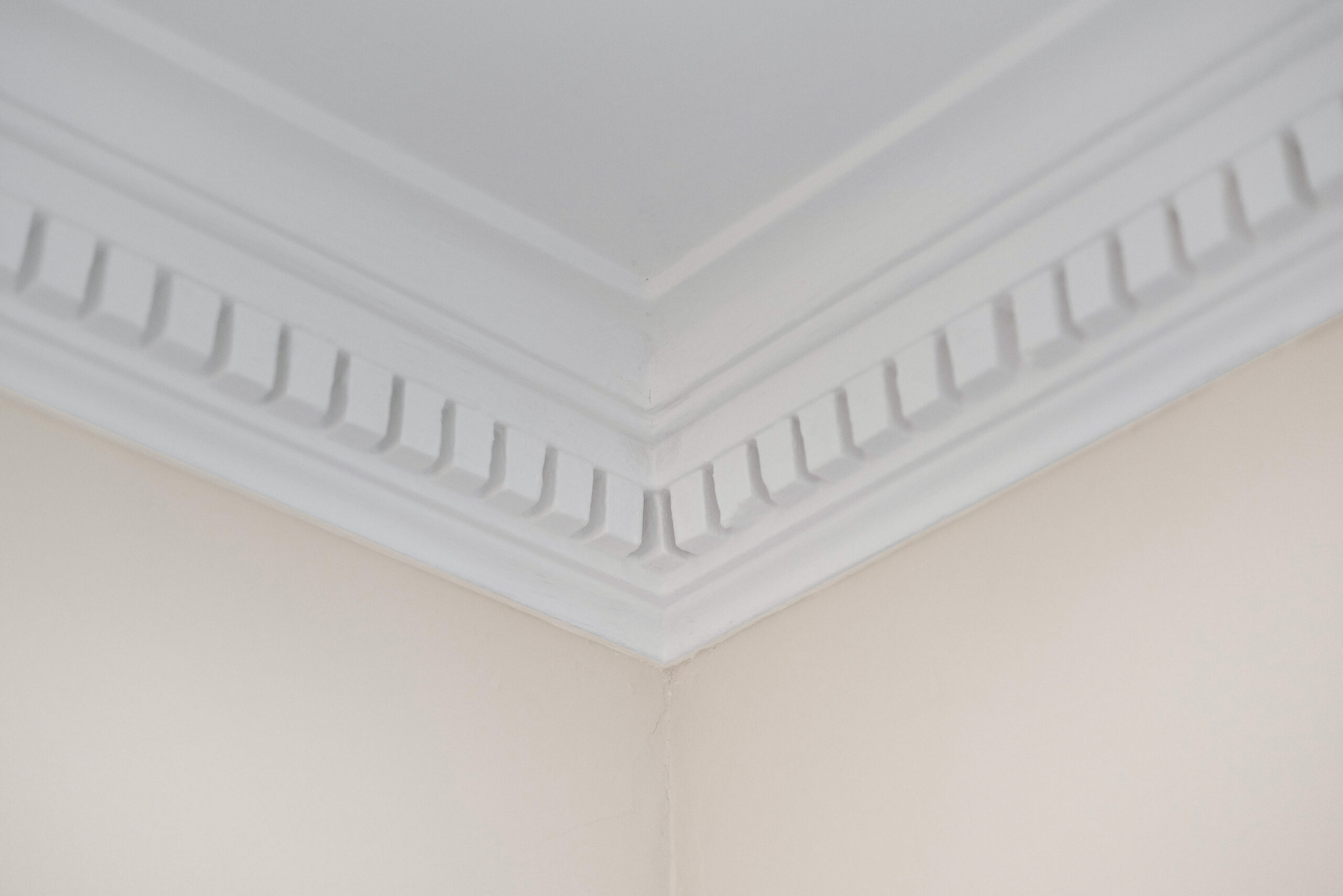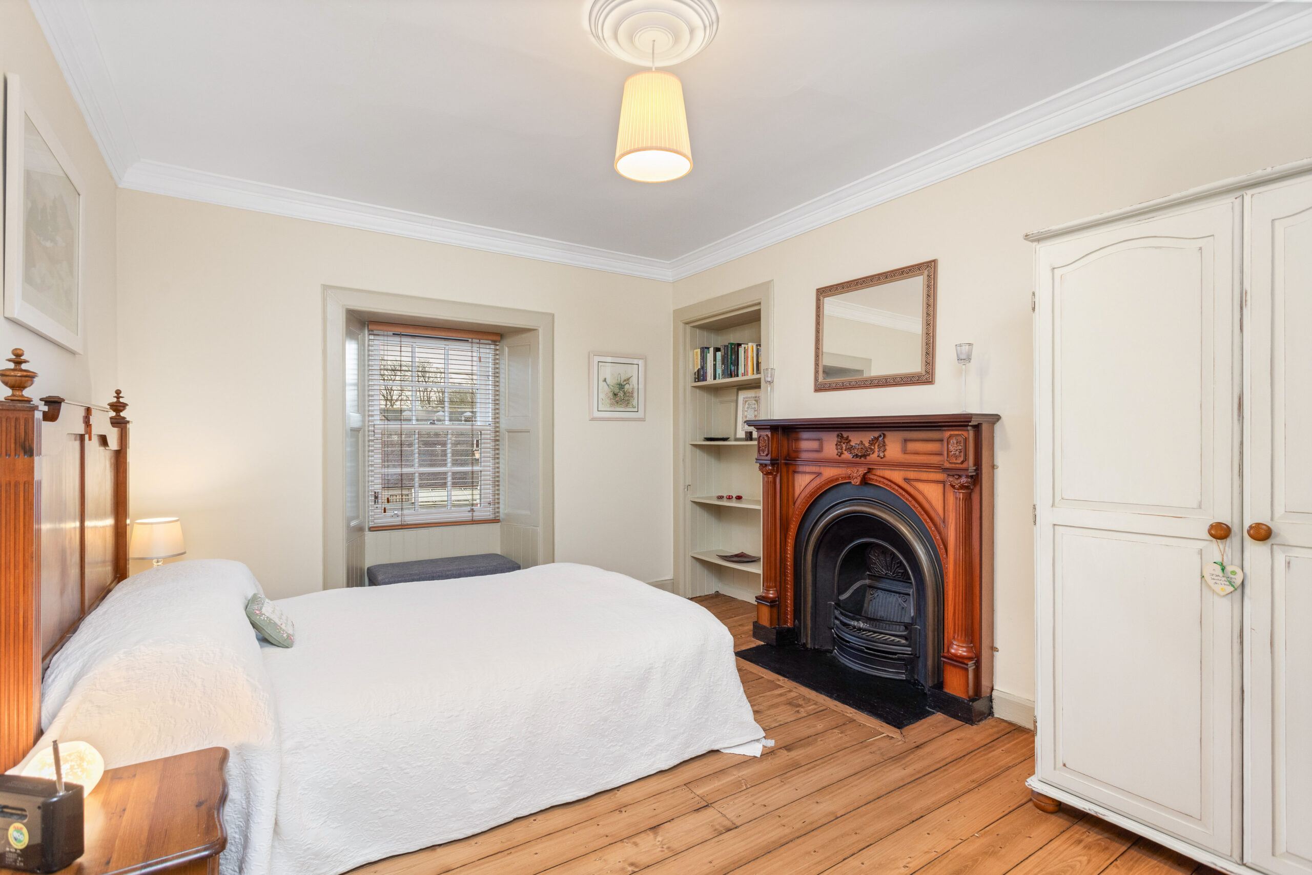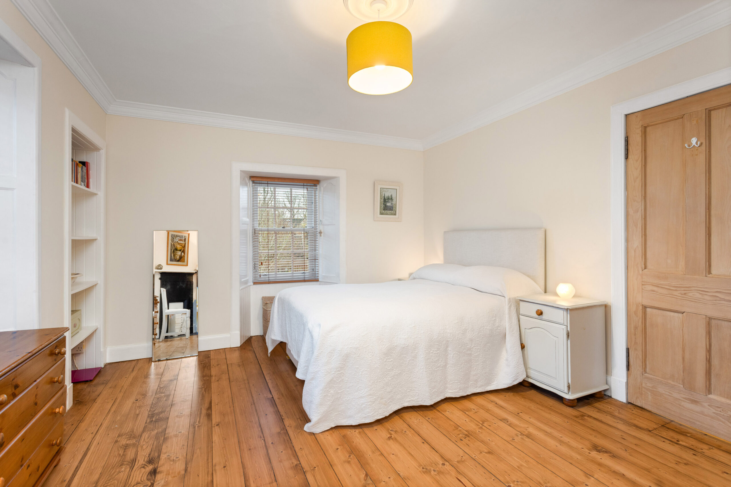 Bedroom three is located on the ground floor and is an incredibly versatile space. Whether used as a comfortable double bedroom, a playroom, an office or a second sitting room, its neutral decor, high ceiling, cornicing and lovely window shutters create a calm and flexible environment.