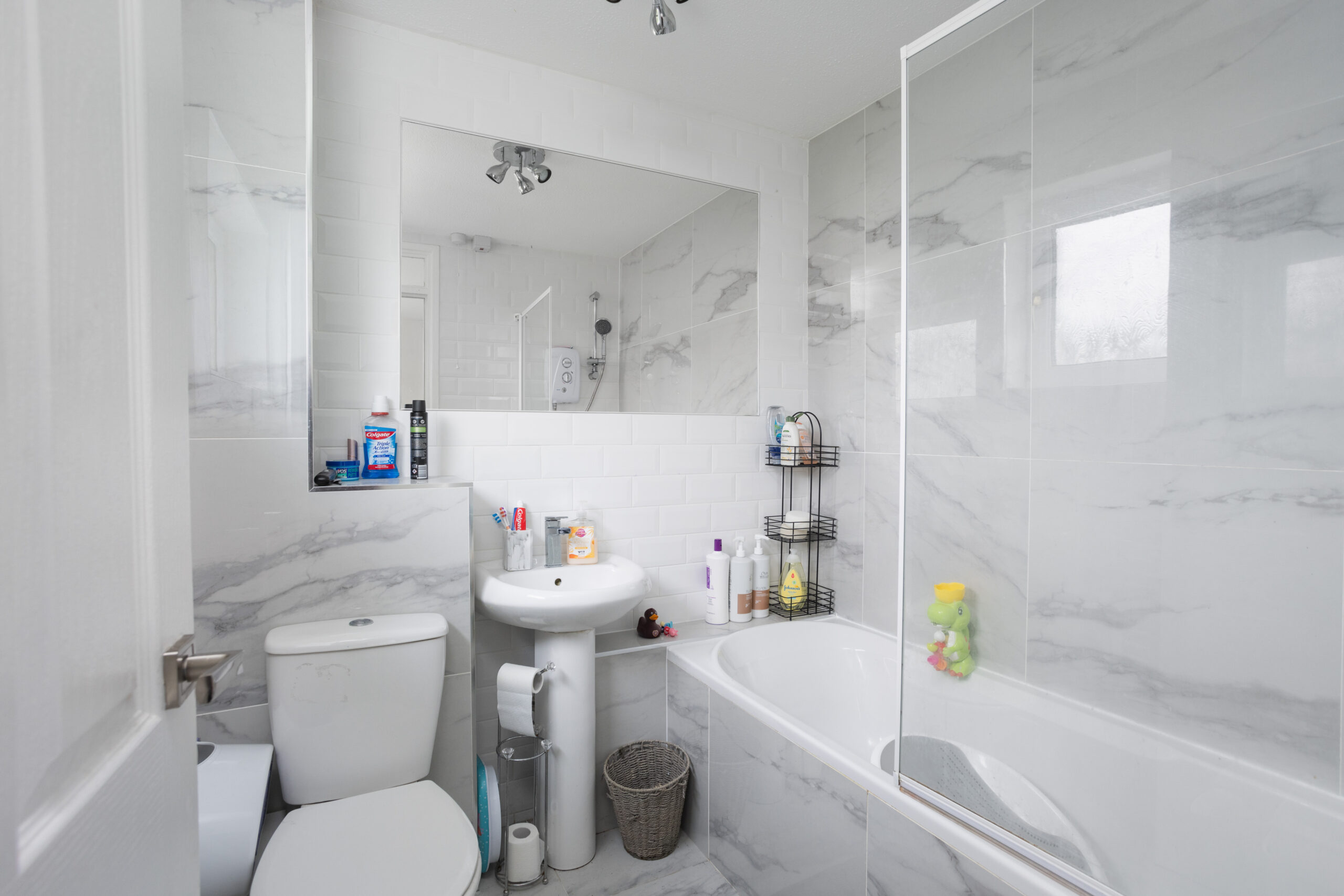 The family bathroom exudes contemporary elegance, equipped with a white three-piece suite, including an over-bath shower, adorned with stylish marble effect and metro tiling, and accentuated by a large bespoke mirror.