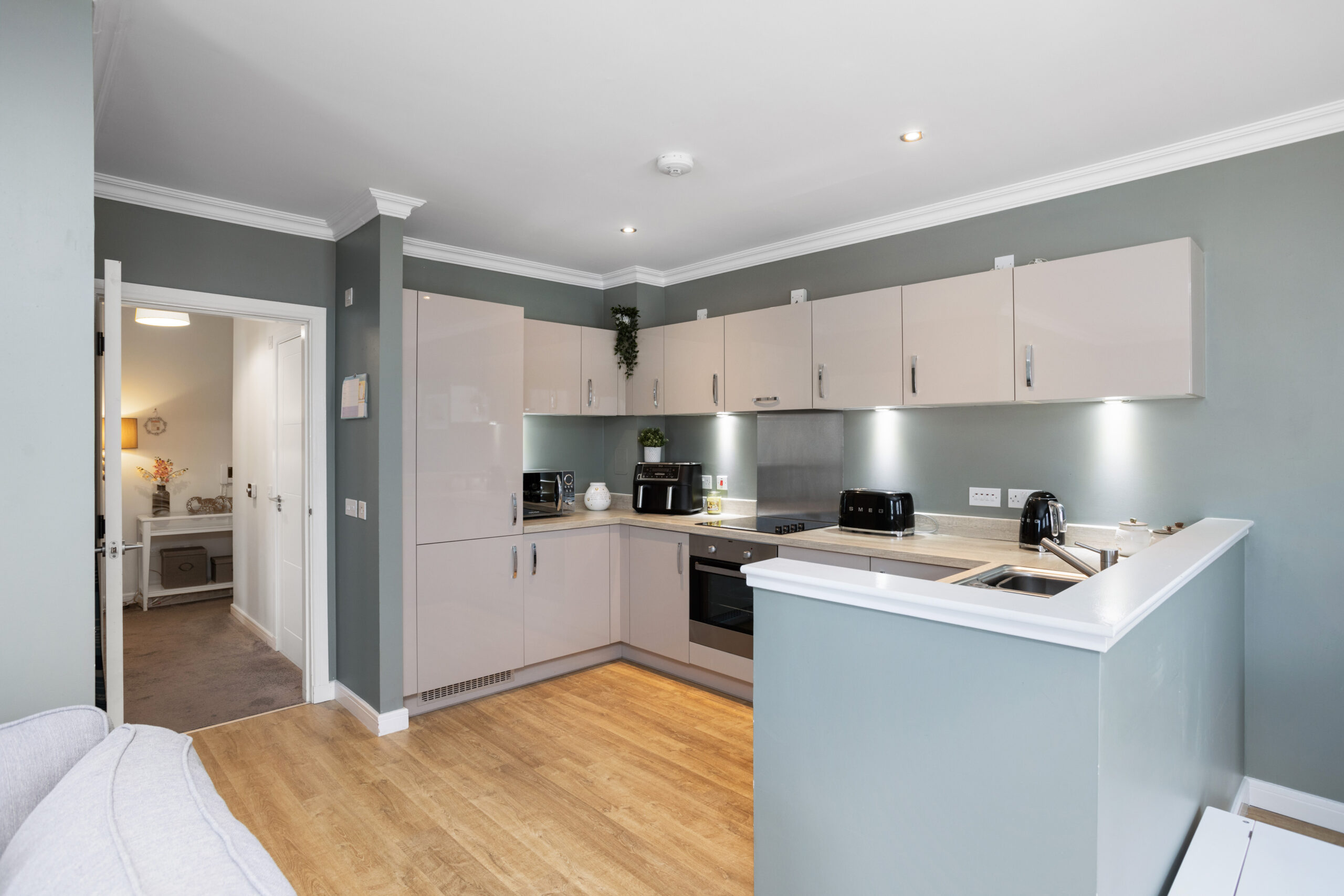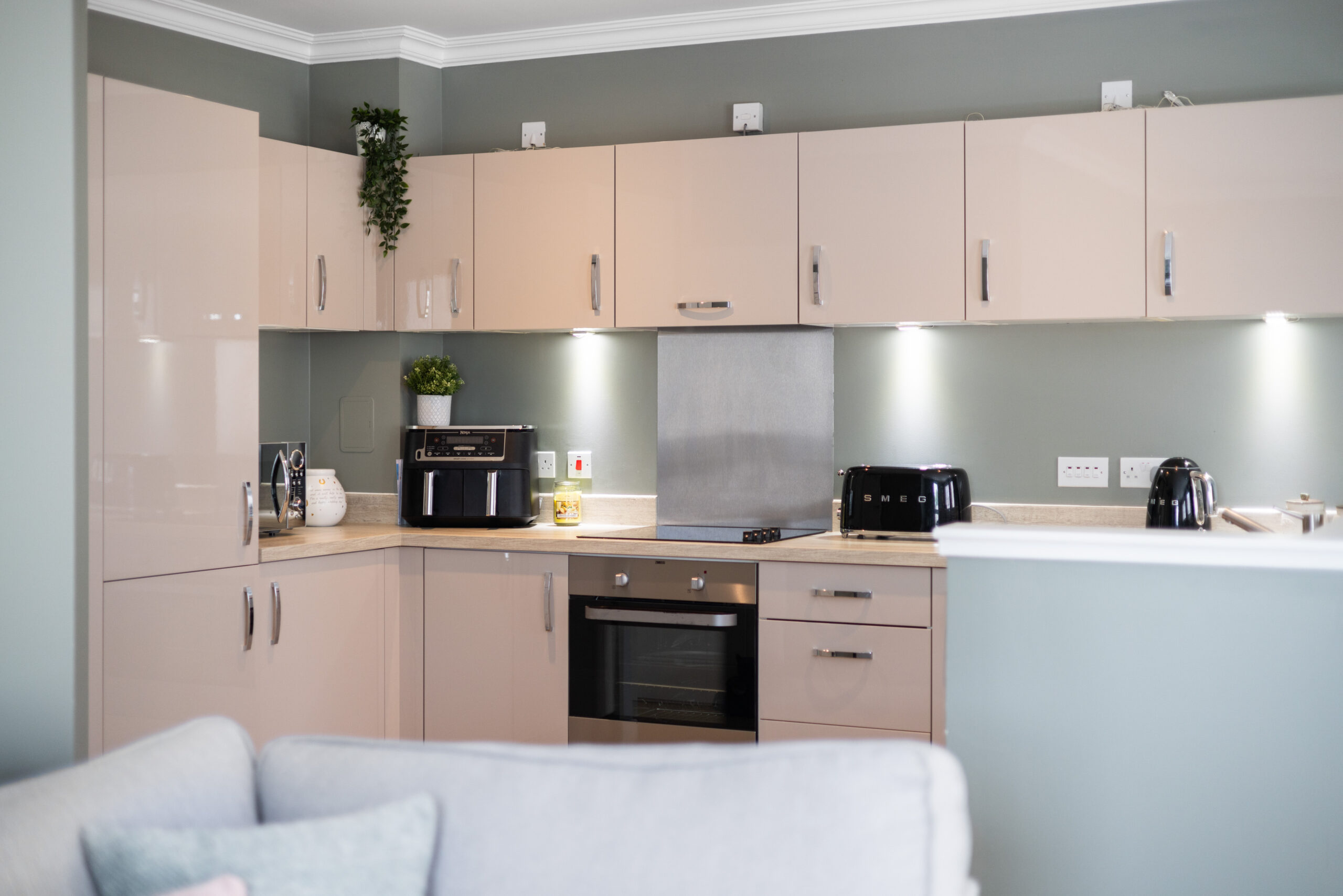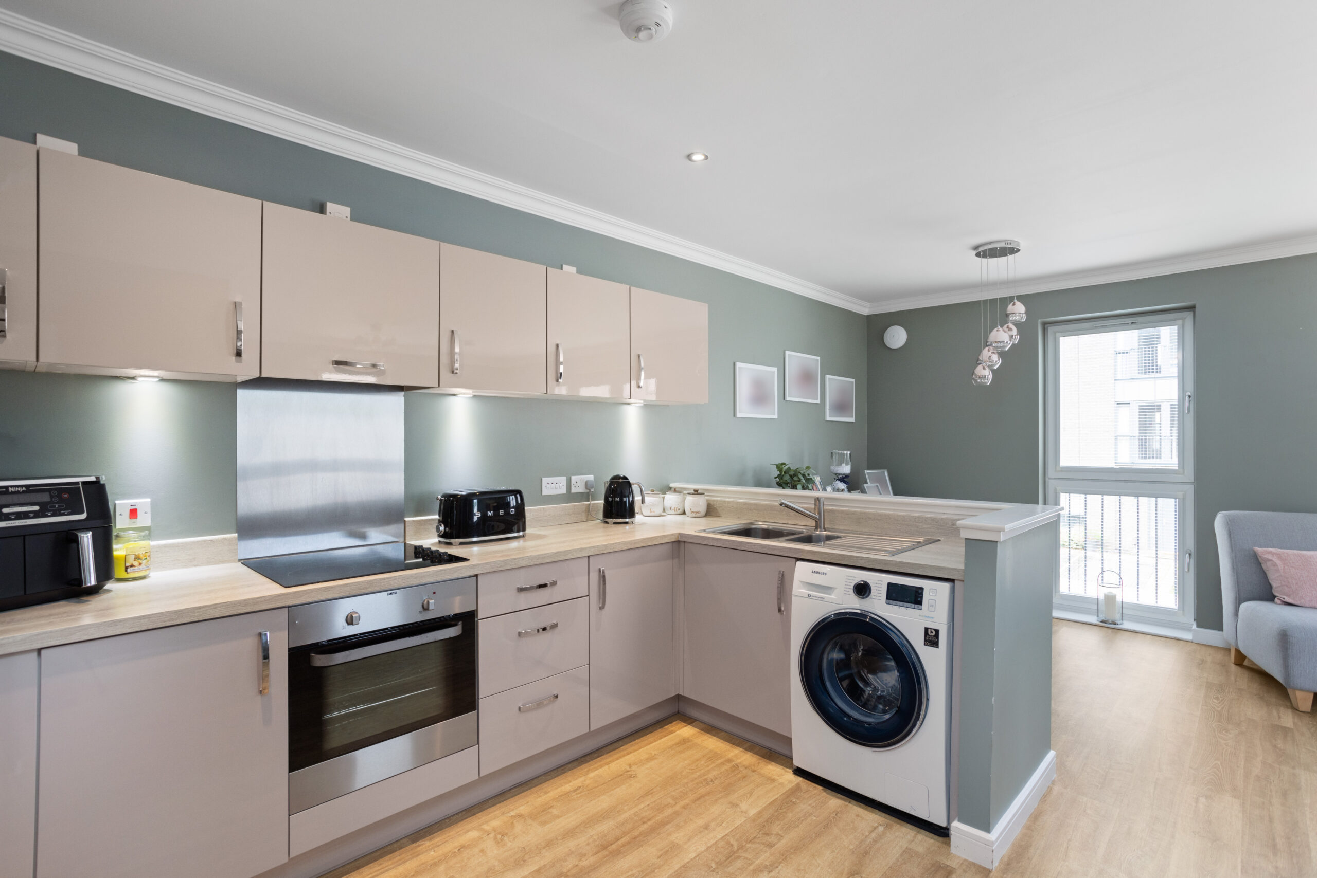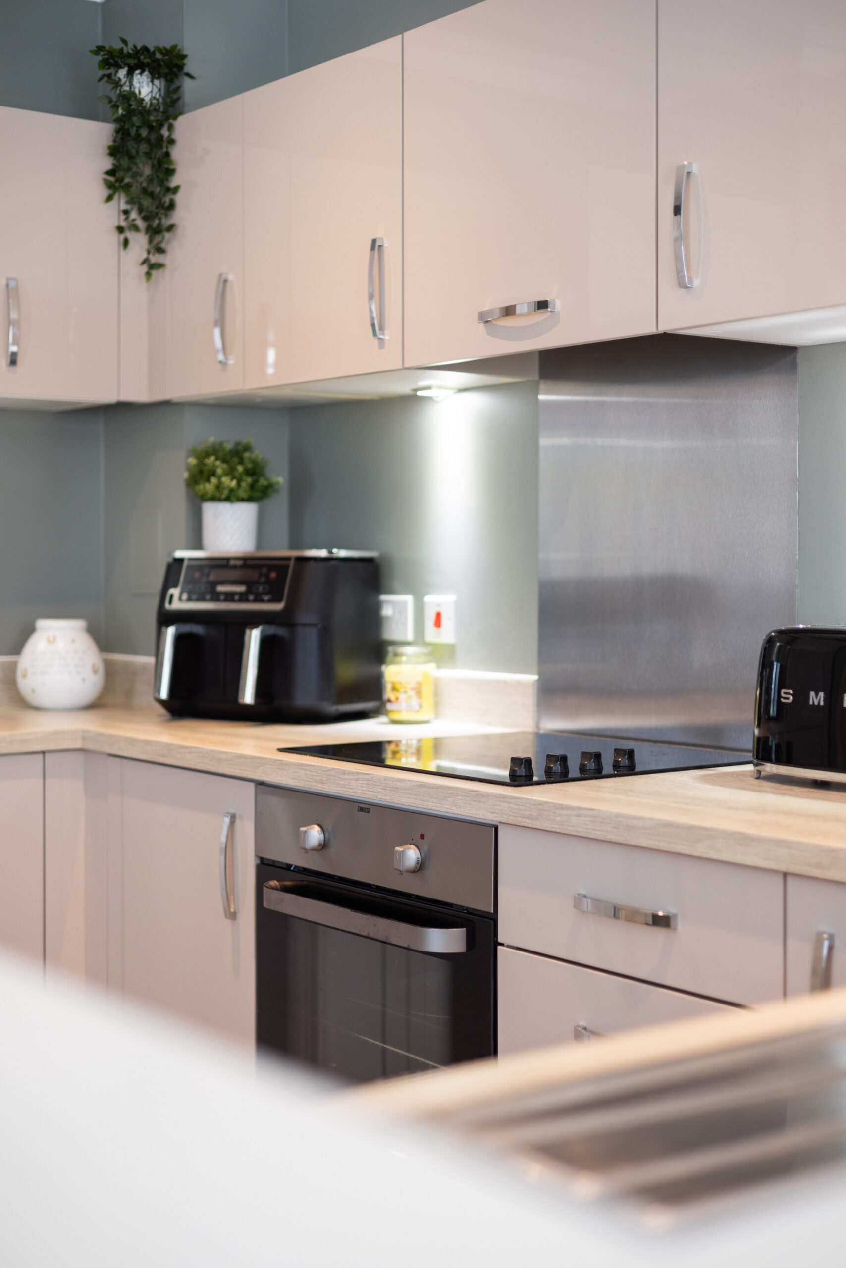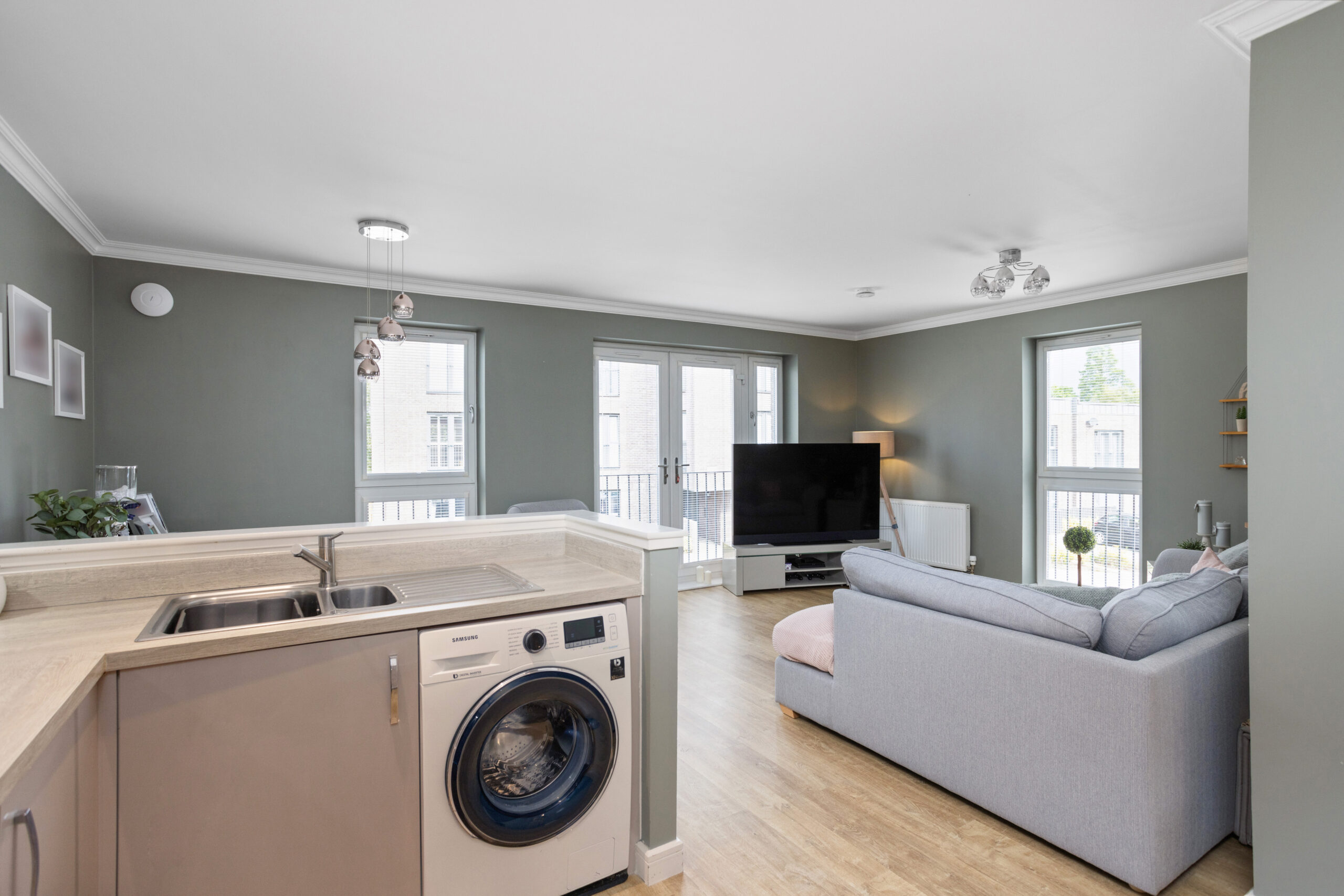 Upon entering, you are greeted by an open-plan kitchen/dining/lounge area, creating a fantastic space to entertain guests. The kitchen shines with a wide range of gloss base and wall units, integrated oven, induction hob, fridge/freezer and space for a free-standing washing machine along with complementing worktops, and spotlights. The French doors open to a Juliet balcony, adding to the apartment's charm.