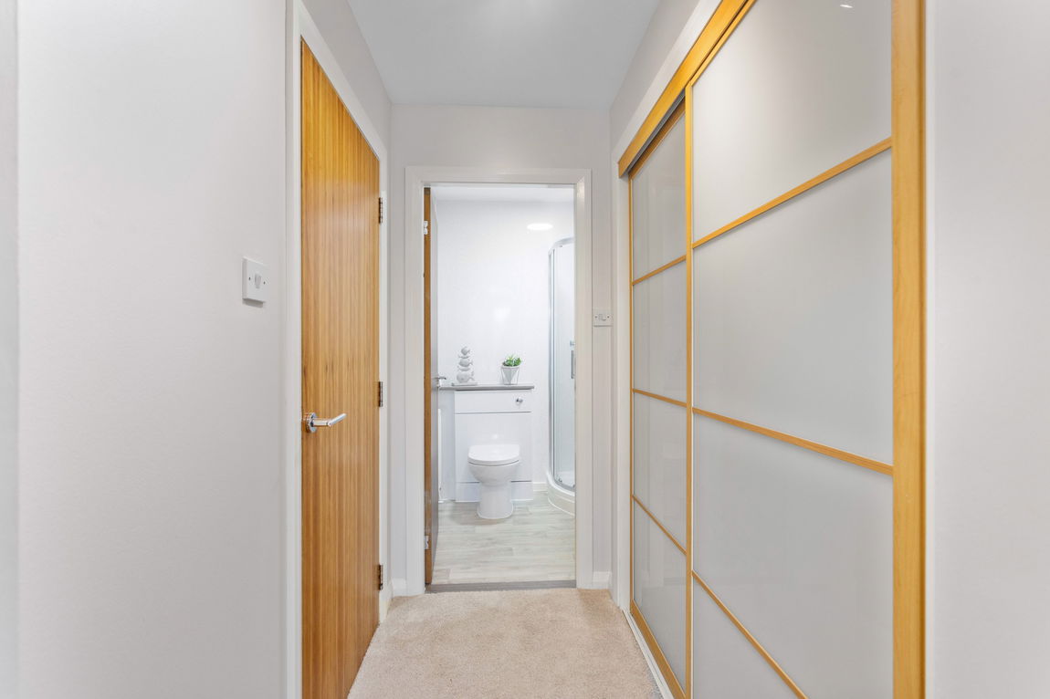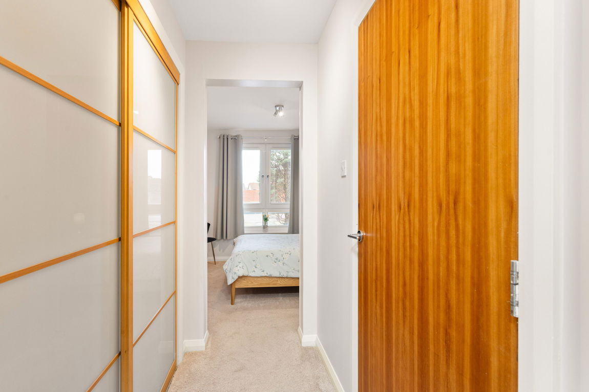 Bedroom two is another generously proportioned double, again with built-in wardrobes, fitted carpet and tasteful decor, making it ideal for guests, a home office or additional bedroom accommodation. The main bathroom completes the accommodation and features a crisp white three-piece suite, partially tiled walls and plank-effect flooring, all presented in a fresh and modern style.