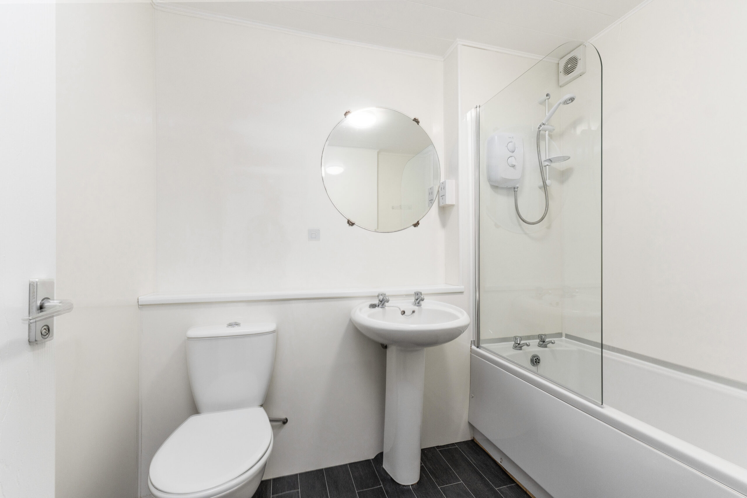 The bathroom is well-appointed with a white three-piece suite, including a bath with an overhead shower. Wet wall panelling provides a sleek, low-maintenance finish, and the flooring is a smart grey tile-effect vinyl, tying the room together.