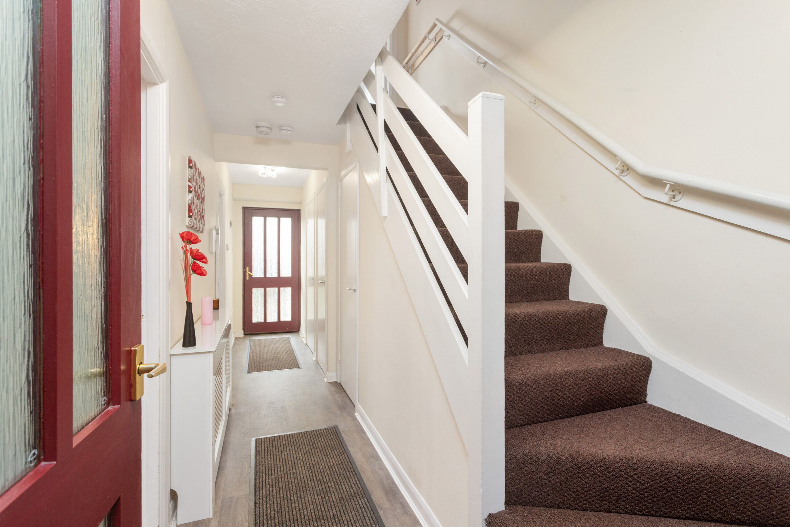 The front door opens into an entrance vestibule, which in turn leads through to the main entrance hallway. This practical and well-designed space offers exceptional storage, with two large cupboards providing ample room to neatly store coats, shoes and everyday belongings. The hallway also gives access to the lounge, kitchen/diner and ground floor cloakroom, with a further door leading directly out to the garden. Stairs rise to the upper level.