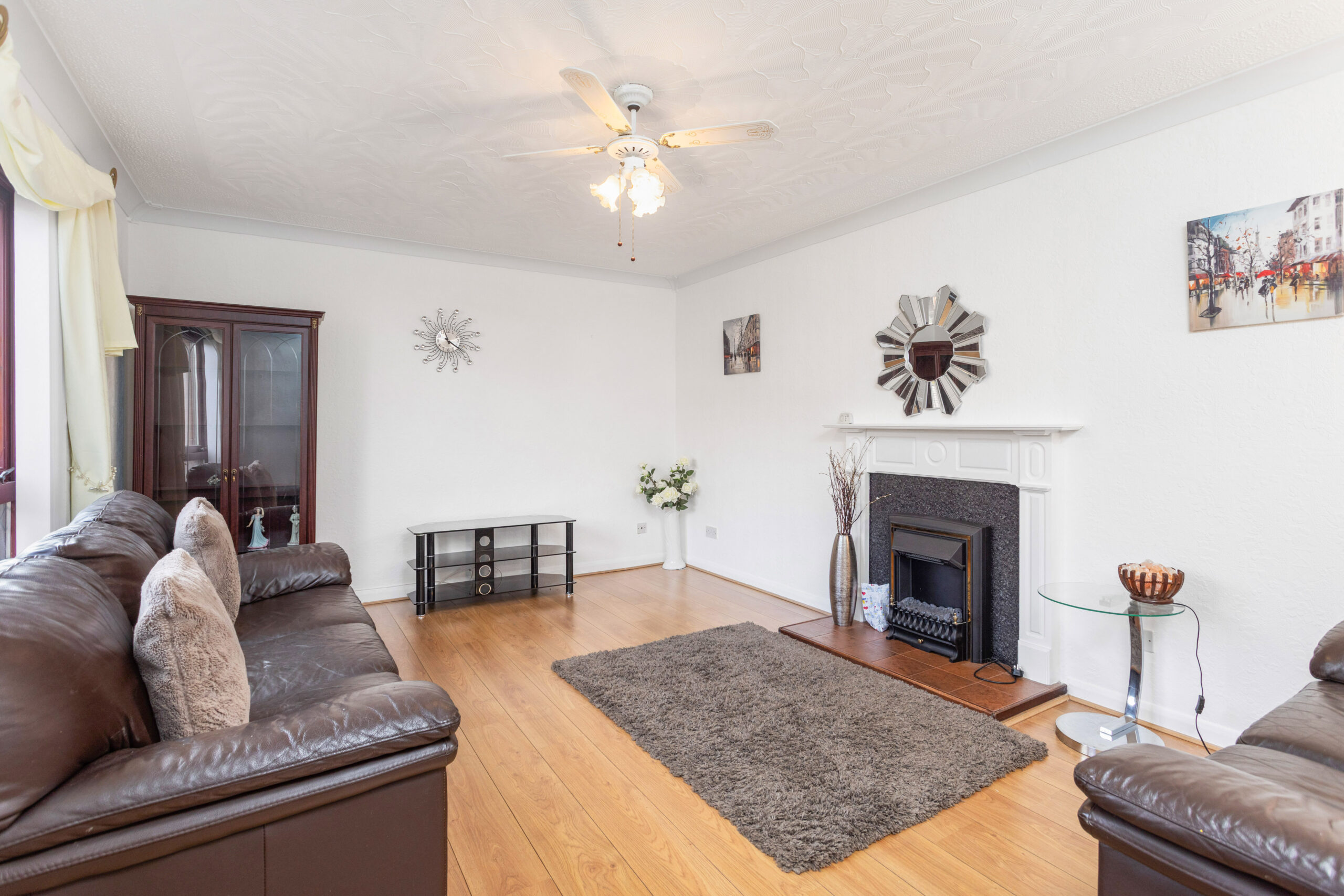 The lounge is a bright and inviting room, finished with laminate flooring and neutral decor. A large front-facing window overlooks the garden, allowing natural light to flood the space while an electric fire with surround creates a cosy focal point.
