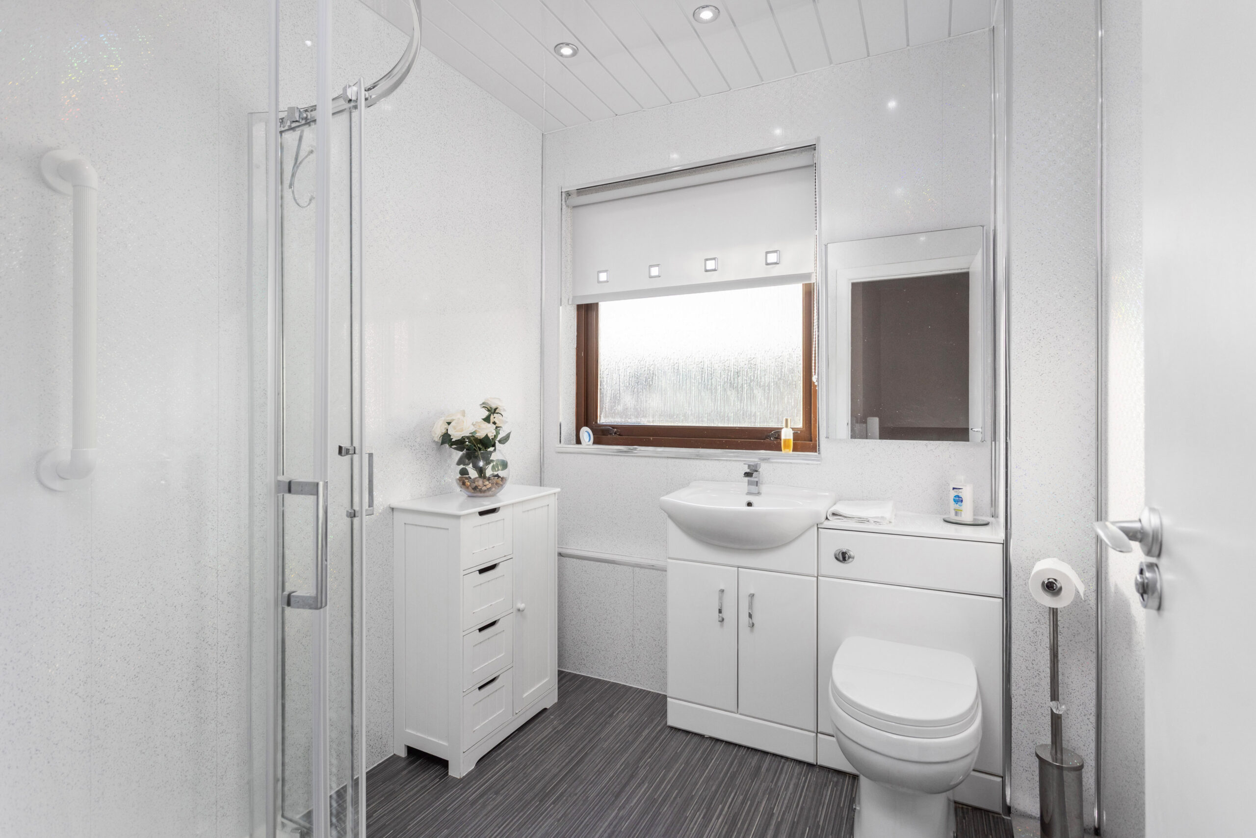 The shower room is modern in style and fitted with a white three-piece suite comprising a WC, wash hand basin and corner shower cubicle. Finished with an elegant wet wall panelling, a panelled ceiling with spotlights, vinyl flooring, vanity storage and a heated stainless steel towel rail, it provides a clean and contemporary finish.