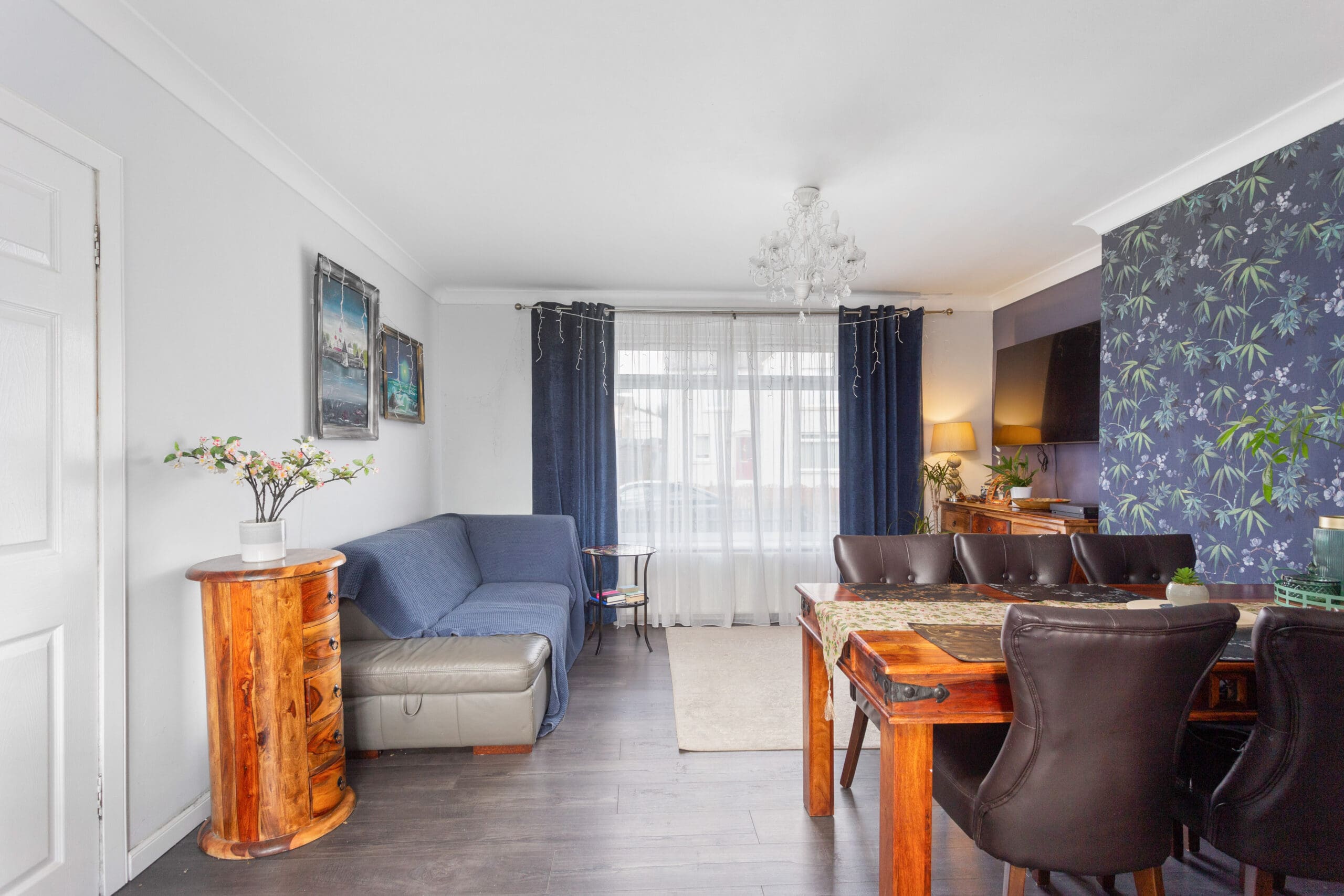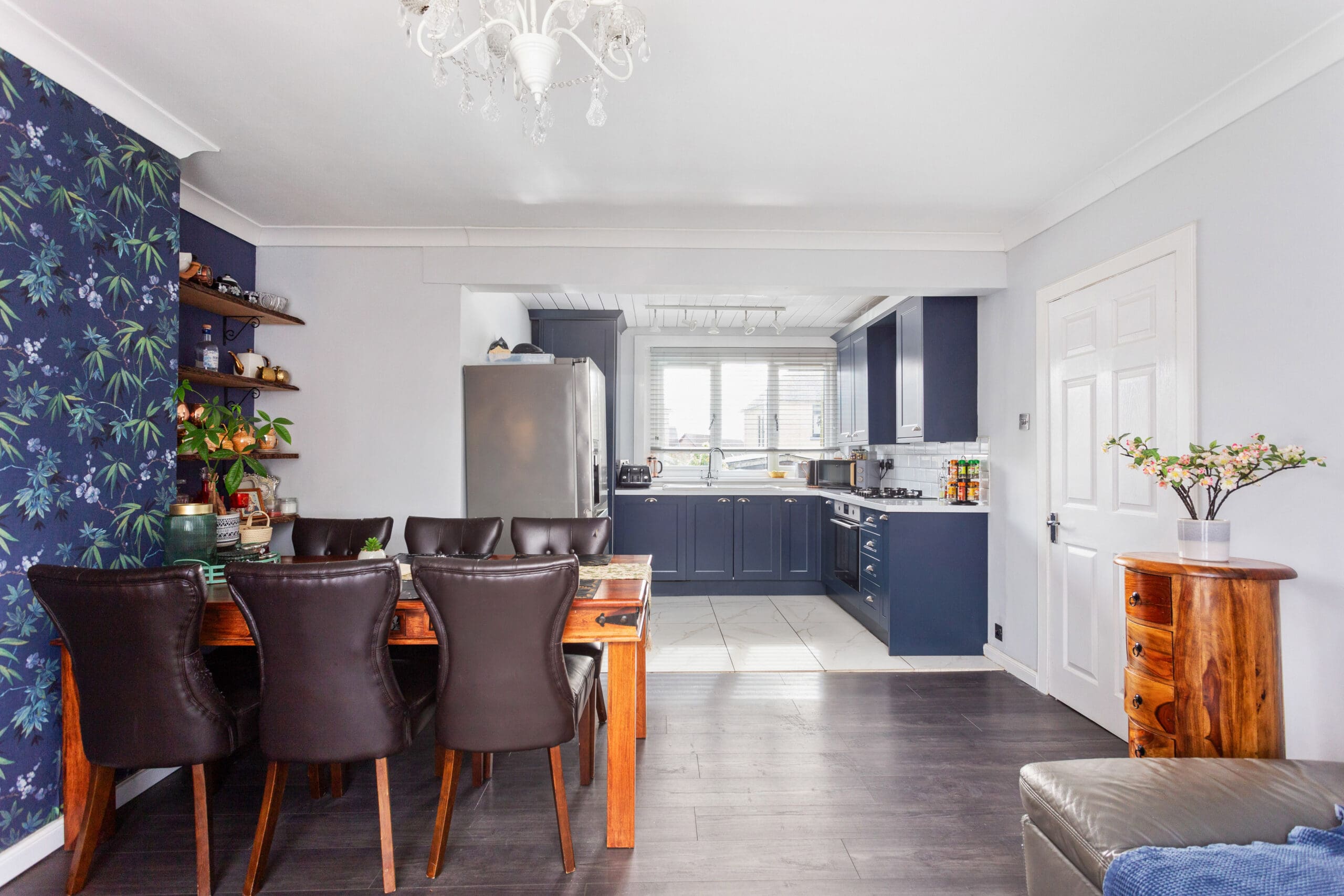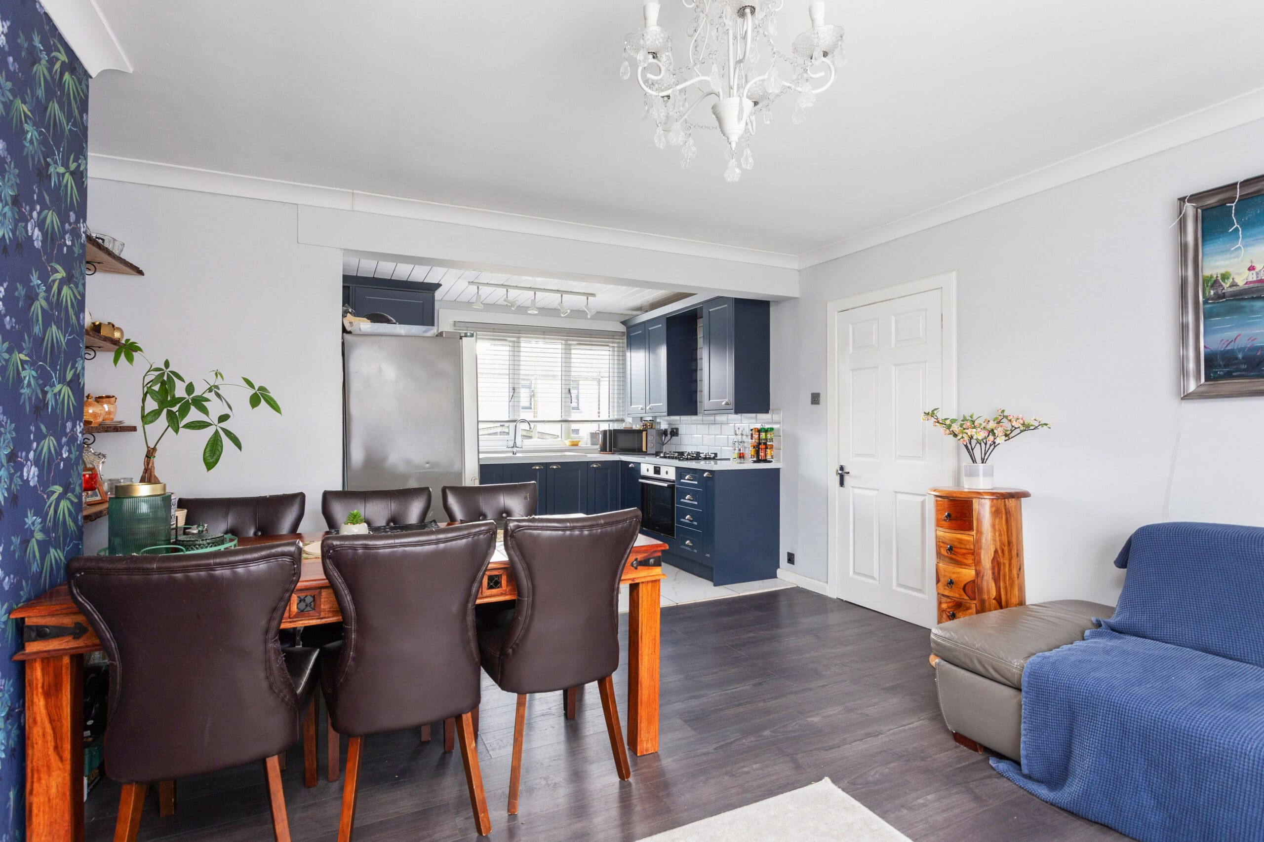 As you step into the welcoming entrance hallway, you are greeted by a practical tiled floor that leads to a convenient storage cupboard and a carpeted staircase ascending to the upper landing. The ground floor unfolds into an open plan lounge and kitchen/dining room, where the stylish kitchen upgraded in 2021 showcases stunning dark blue base and wall units complemented by white metro-style splashback tiles and elegant white marble-effect worktops. Integrated appliances, including an oven and hob, are seamlessly integrated for culinary adventures. A modern laminate flooring adorns the lounge/dining area, offering a perfect canvas for family gatherings and relaxation. The rear hallway off the kitchen provides further storage which currently houses the washing machine and access to outdoors.