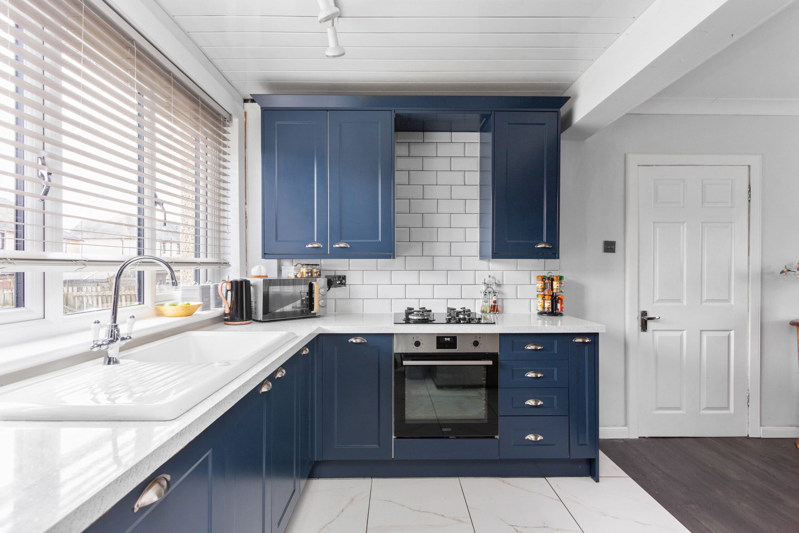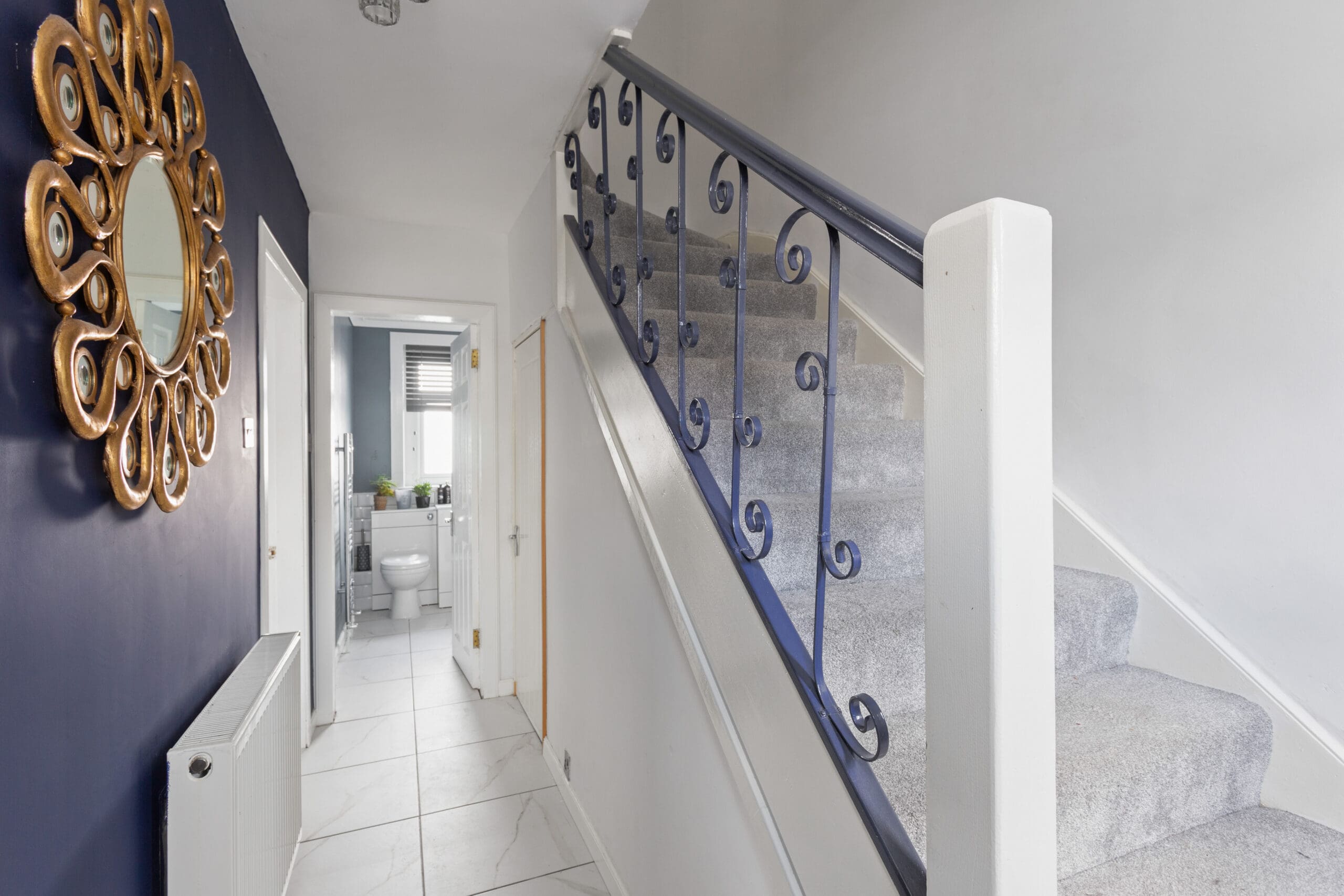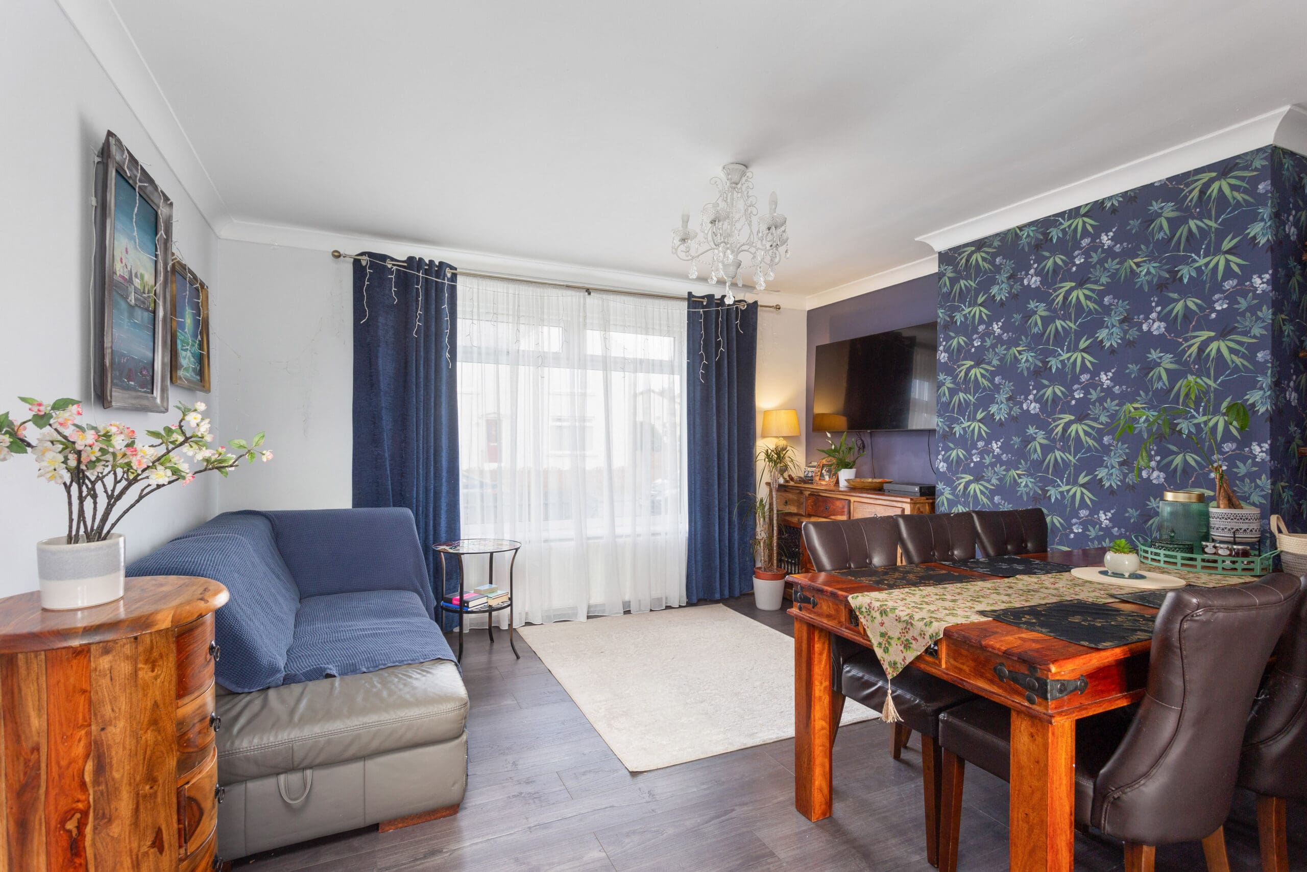 As you step into the welcoming entrance hallway, you are greeted by a practical tiled floor that leads to a convenient storage cupboard and a carpeted staircase ascending to the upper landing. The ground floor unfolds into an open plan lounge and kitchen/dining room, where the stylish kitchen upgraded in 2021 showcases stunning dark blue base and wall units complemented by white metro-style splashback tiles and elegant white marble-effect worktops. Integrated appliances, including an oven and hob, are seamlessly integrated for culinary adventures. A modern laminate flooring adorns the lounge/dining area, offering a perfect canvas for family gatherings and relaxation. The rear hallway off the kitchen provides further storage which currently houses the washing machine and access to outdoors.