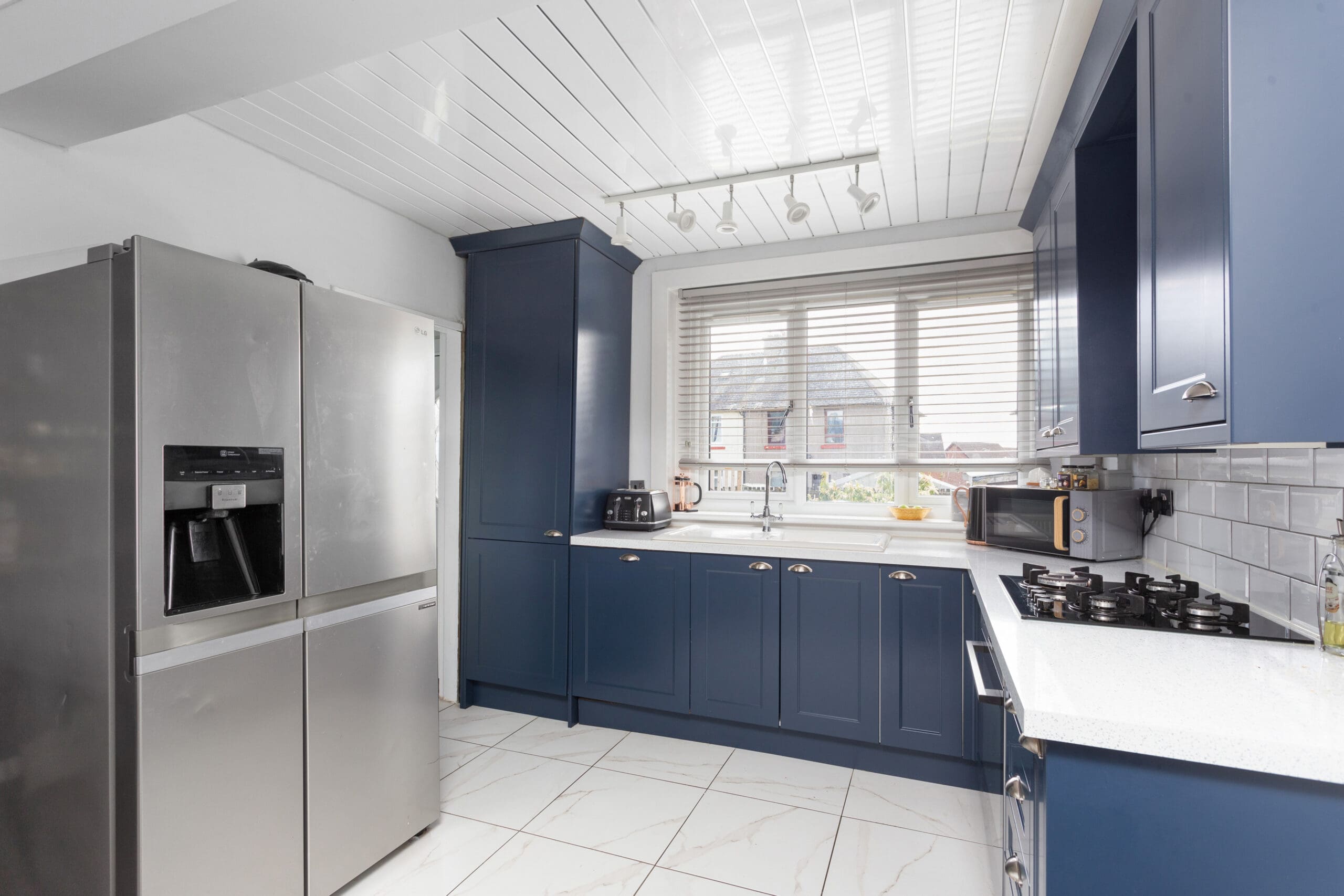 Integrated oven, hob, dishwasher, free-standing fridge/freezer, light fittings, blinds and curtain poles.