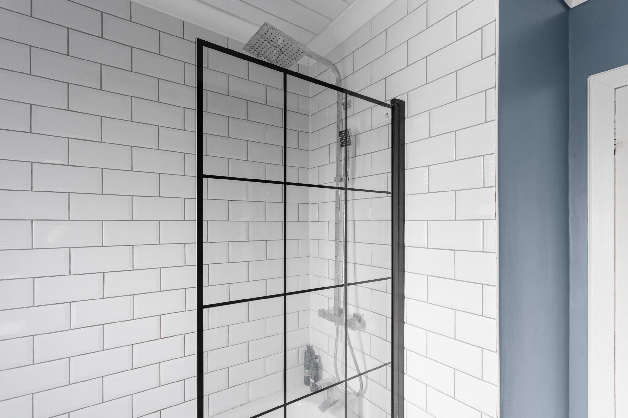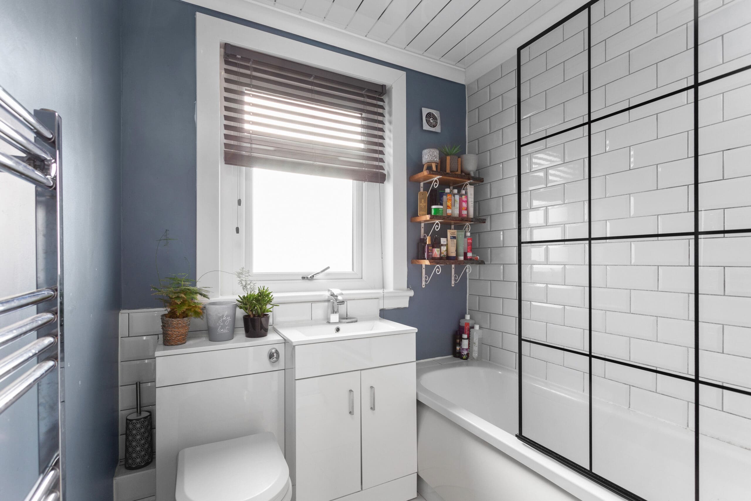 The bathroom, rejuvenated also in 2021, exudes sophistication with white w.c, wash hand basin, and a bath graced by a rainforest shower above. White metro-style splashback tiles and a heated towel rail add to the luxurious feel, while an opaque window ensures privacy.