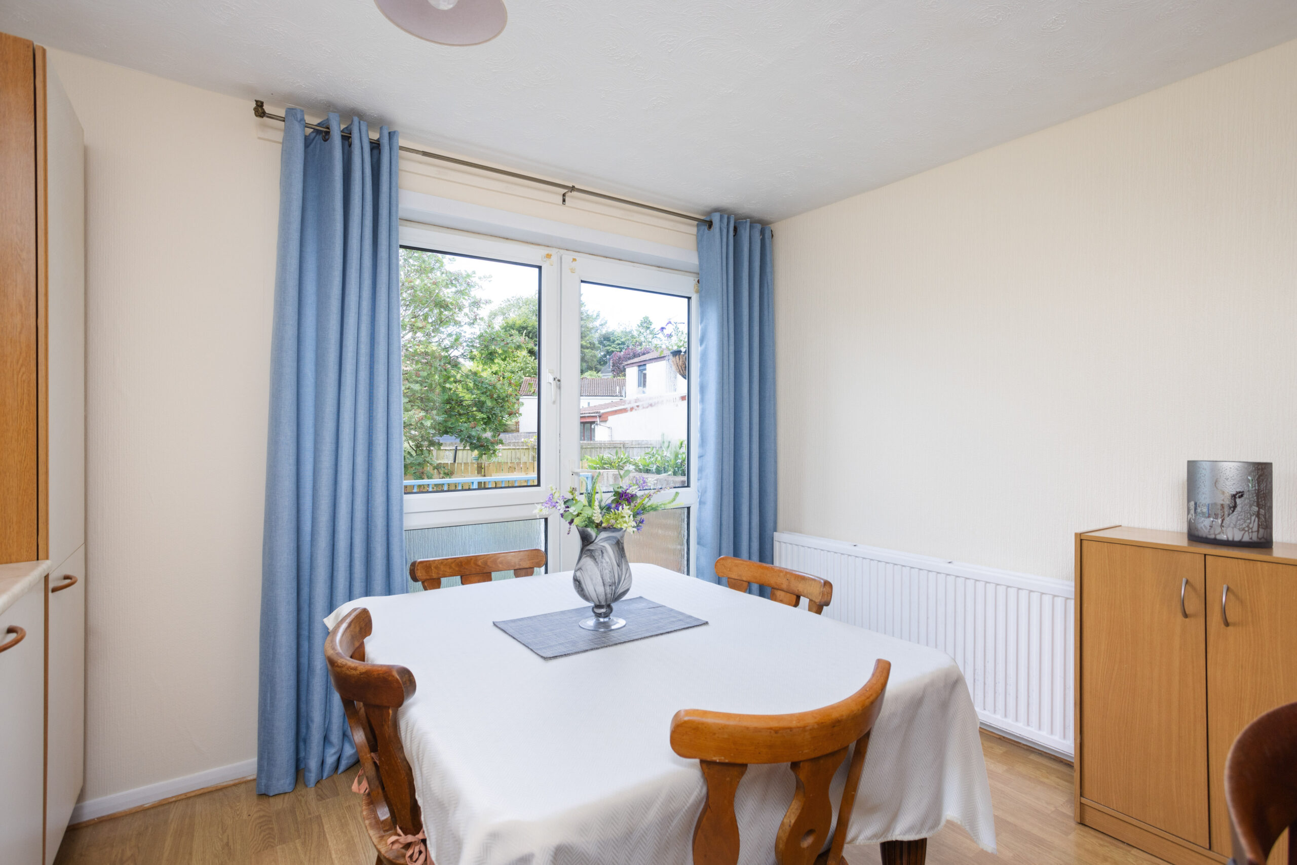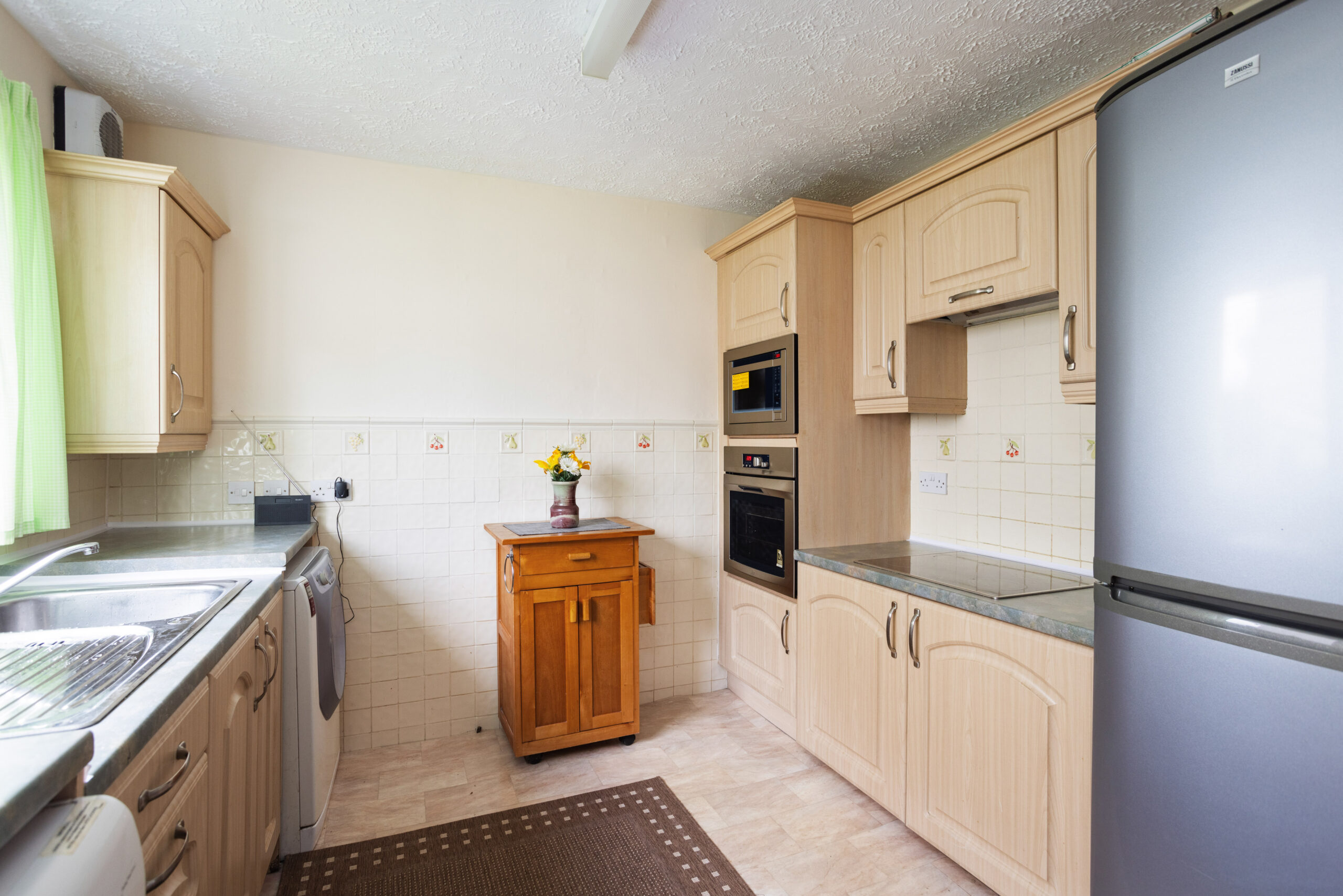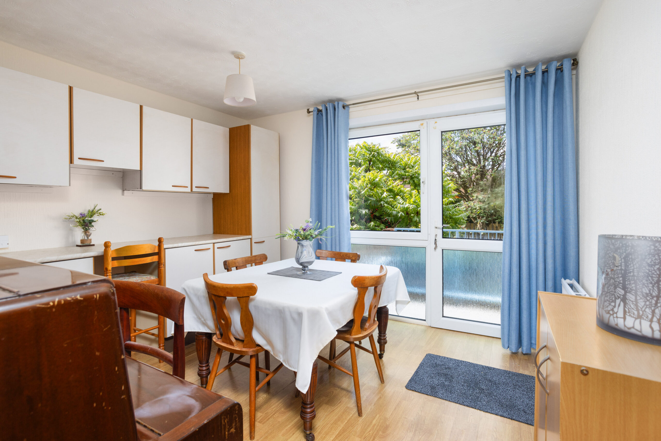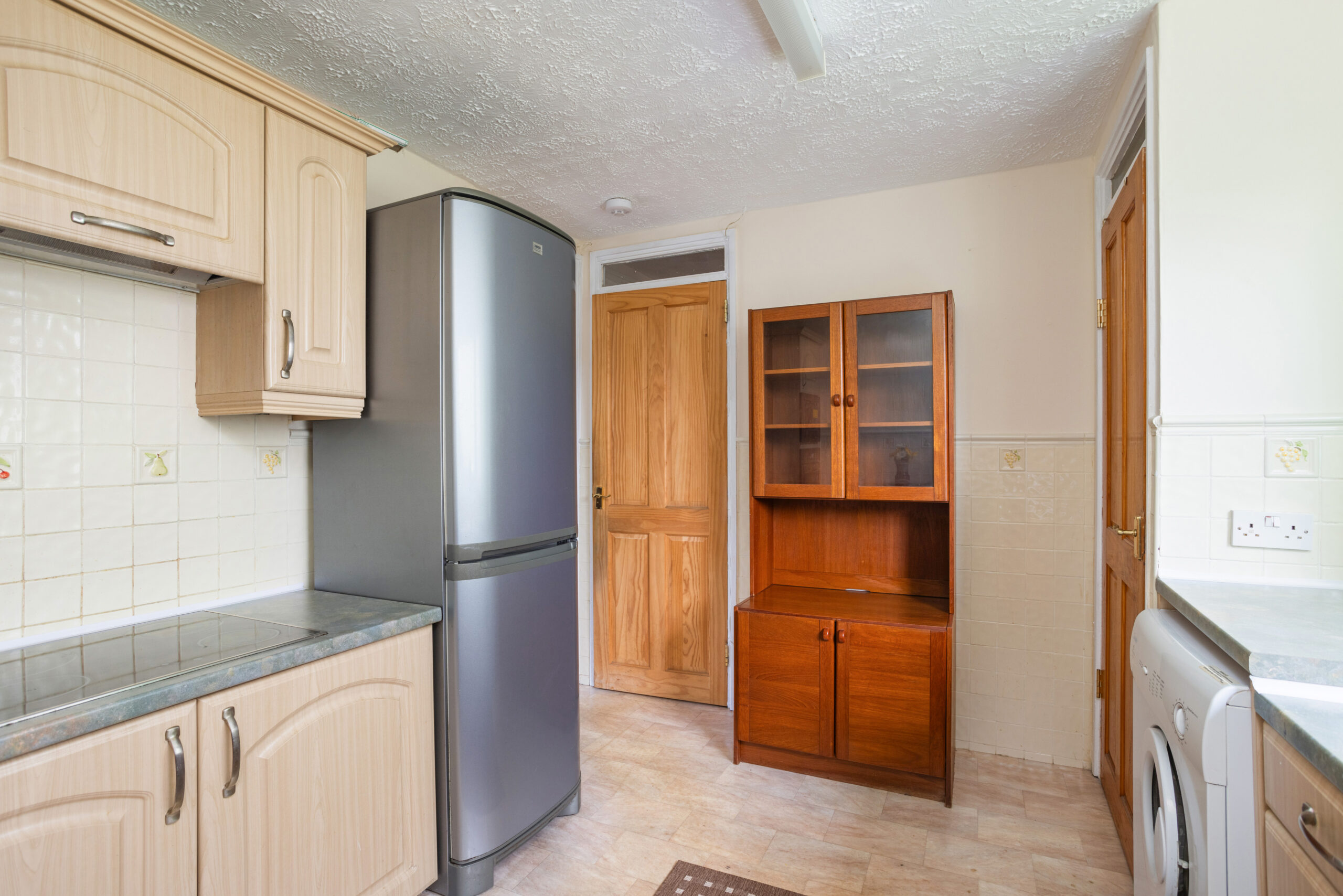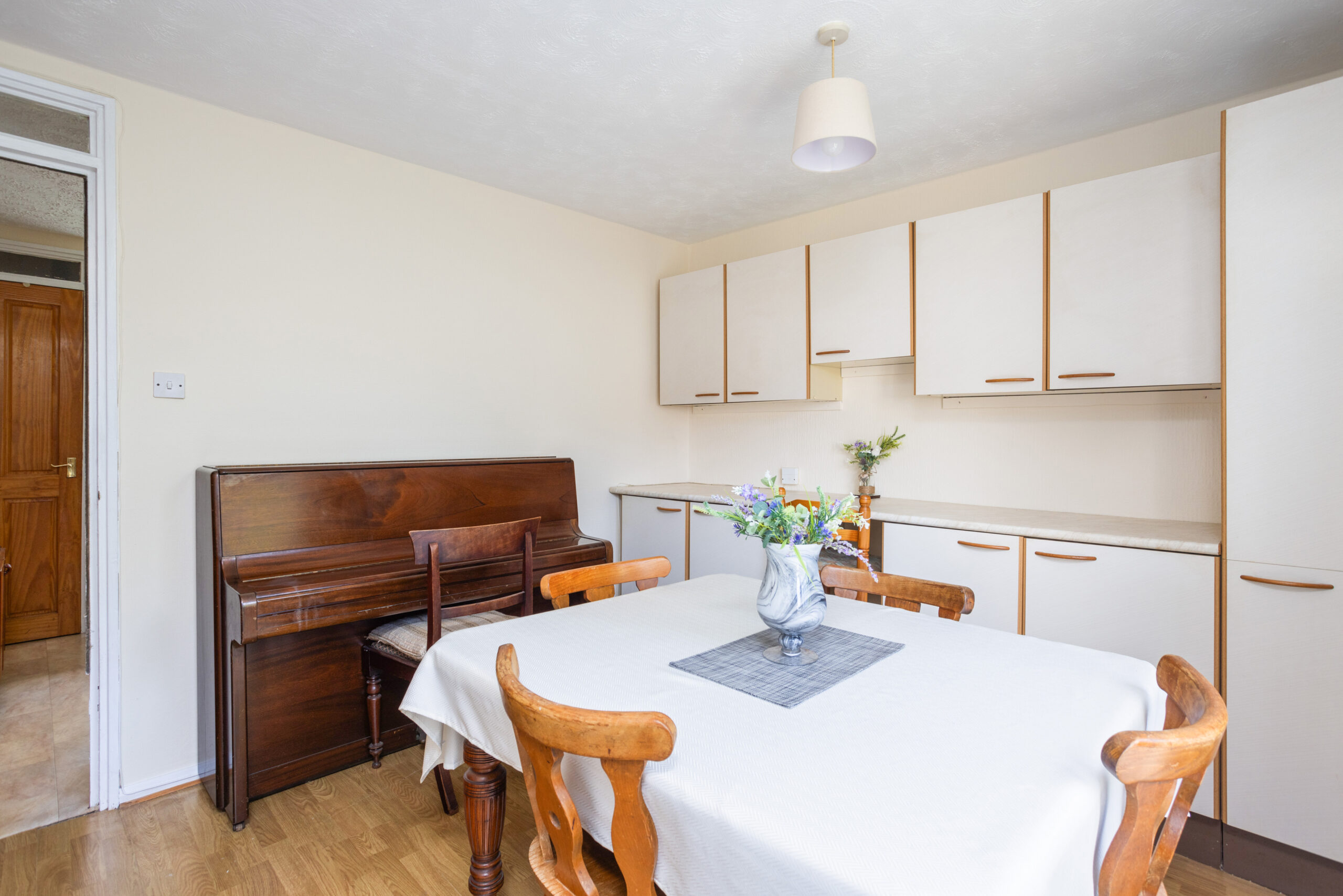 The kitchen, thoughtfully designed features an integrated oven, low-level hob, and microwave, and space for a free-standing washing machine, dryer, and fridge/freezer which are all included within the sale price (no warranty). Well equipped with a wide range of base and wall units. Adjoining this is the dining room, a convivial space with additional storage and direct access to the garden, ideal for hosting gatherings and creating memories.