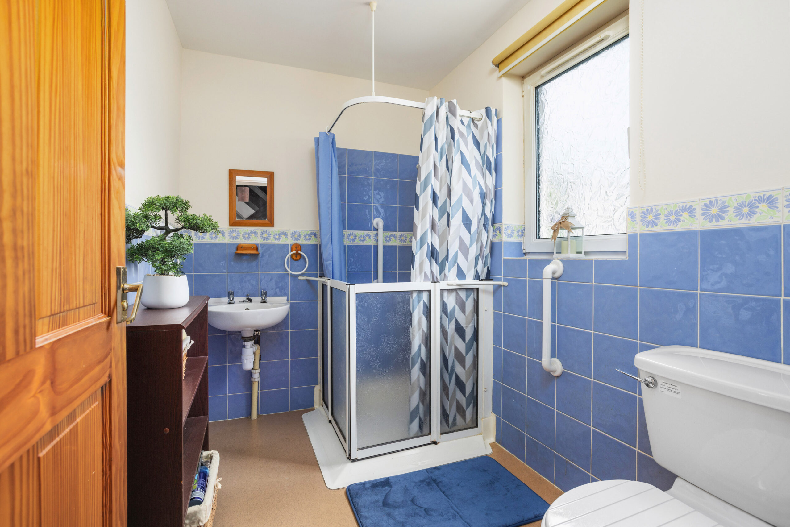 On the ground floor, Bedroom 4 offers flexibility as a sizable double, a cosy second sitting room, or a secluded office space. The adjacent wet room, tiled in blue, adds a touch of colour and completes the downstairs facilities.