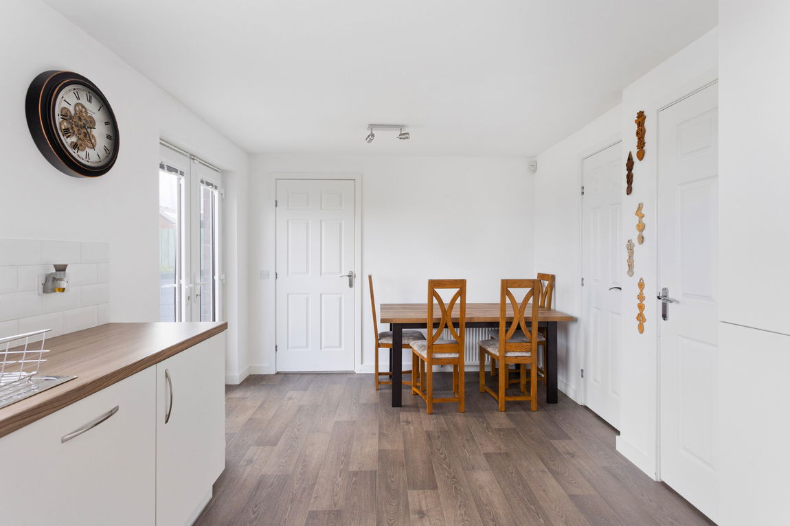 The kitchen/diner is a beautiful blend of style and function. Designed in a timeless style with a combination of base and wall units, complemented by sleek worktops and crisp white metro-style splashback tiles. Integrated appliances including an oven, gas hob, dishwasher, and fridge/freezer ensure a streamlined finish. It's a space perfect for family meals, weekend baking sessions, or hosting friends, with doors opening to the garden and a handy utility room just off the kitchen. A convenient store cupboard keeps belongings neatly tucked away. Doors from the kitchen provide access to the rear garden and a separate utility room, plumbed for a washer and dryer, which also leads to the cloakroom, featuring a white WC, sink, and stylish metro splashback tiles.