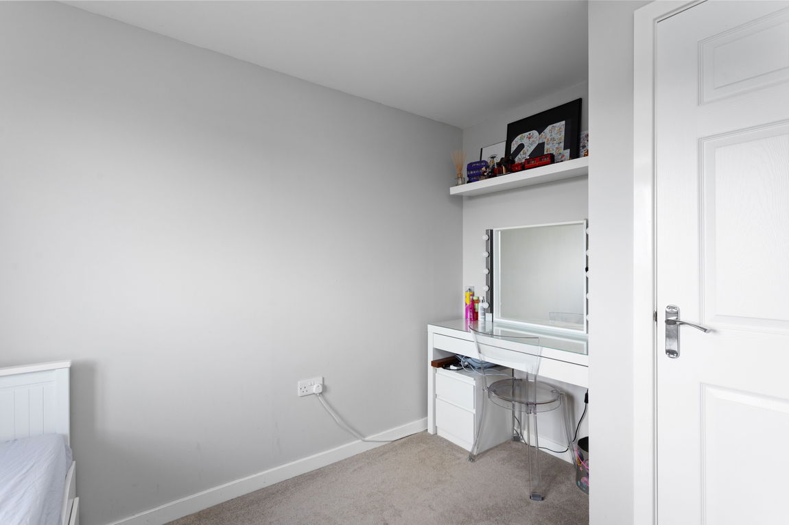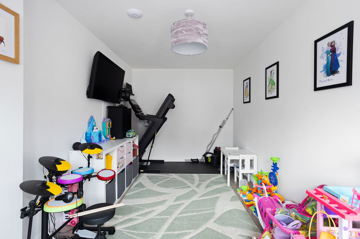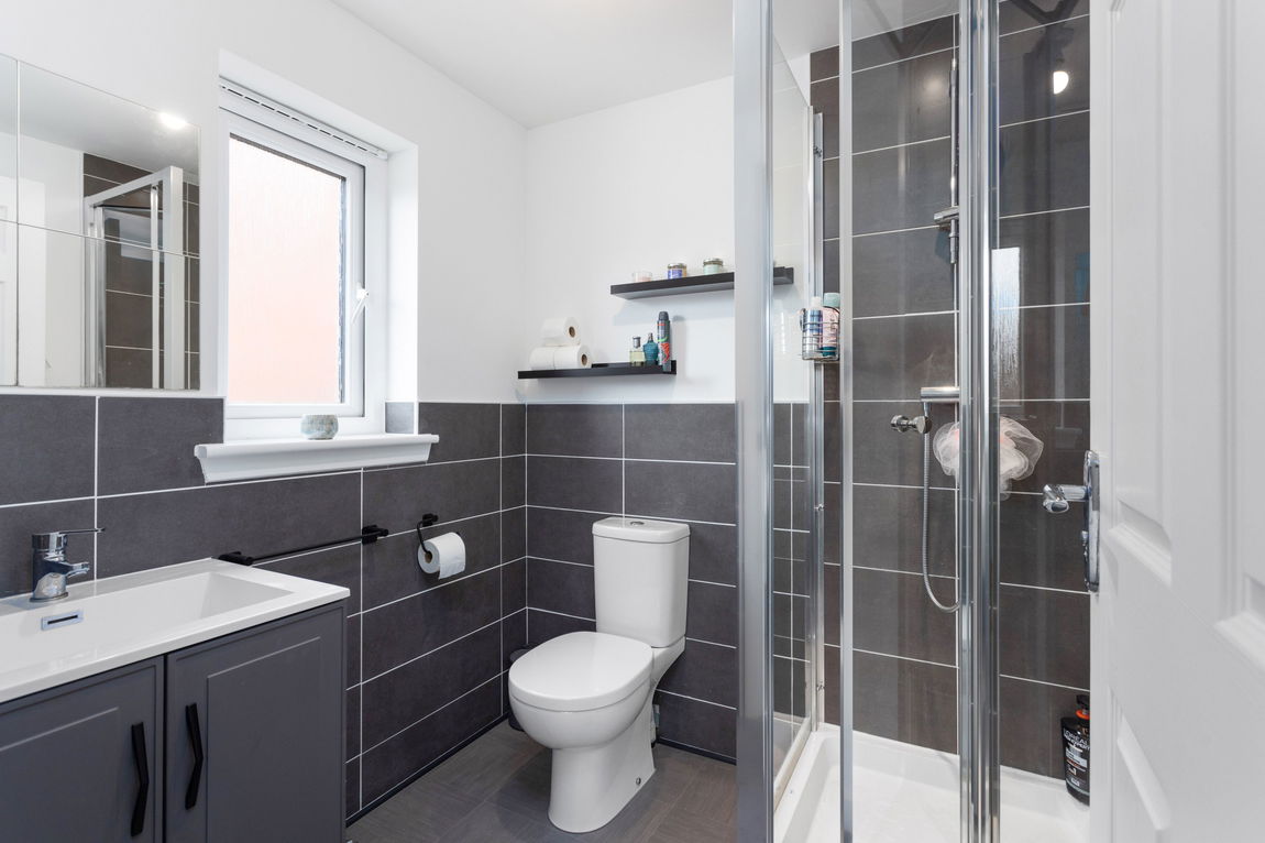 Upstairs, the property continues to impress with four carpeted bedrooms and the family bathroom. The master bedroom is a generous double with fitted wardrobes and access to a newly upgraded en-suite, completed in September 2025, featuring stylish grey tiles and modern finishes. The second bedroom is another sizeable double, adorned with a charming feature wall, while bedrooms three and four are also of excellent proportions, with bedroom three offering fitted storage and both rooms allowing ample space for additional furniture. The family bathroom is modern and elegant, featuring a white three-piece suite with a shower above the bath, contemporary splashback tiles, and a large store cupboard. There is also a hatch to the loft with a ladder and a partially floored space for additional storage.
