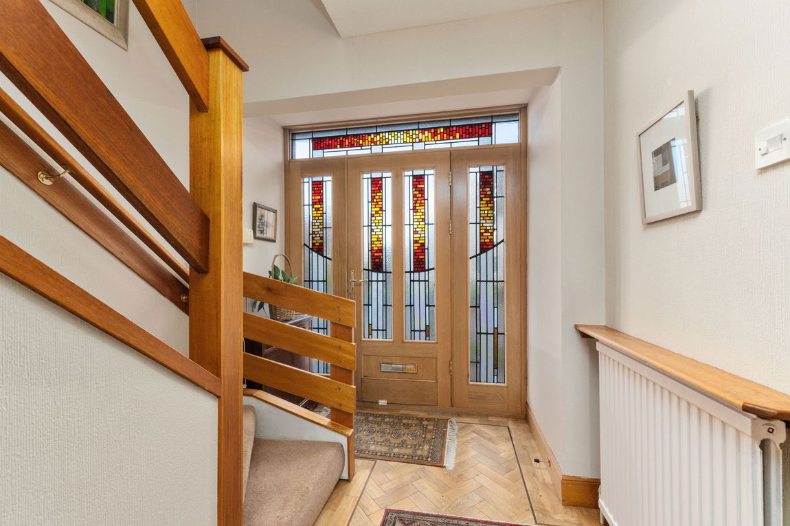This rarely available extended family home, nestled in a quiet, leafy cul-de-sac in the heart of Uphall, offers a wonderful blend of space, style, and comfort. From the moment you arrive, the property's attractive exterior makes an impression, with a monoblocked driveway providing ample parking and leading to a single garage fitted with an electric door, power, and lighting. The garage has been lined for added practicality, while the front garden, attractively chipped and adorned with a variety of mature trees and shrubs, adds charm and kerb appeal. Behind the stunning front door, featuring decorative stained-glass panels, lies a home full of warmth and character.