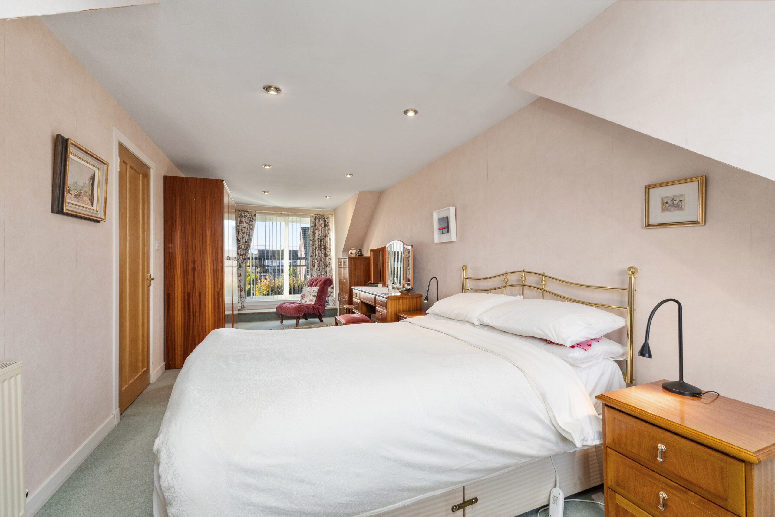 Upstairs, the property continues to impress with four well-proportioned bedrooms and a family shower room. The master suite is an exceptional feature - a generous room with a window to the front and access to a private balcony at the rear, creating a serene retreat. The spacious four-piece en suite bathroom includes a bath, WC, washbasin, and bidet, with tiled walls and spotlights providing a relaxing atmosphere to unwind after a busy day. Bedroom two is another bright double room with built-in wardrobe storage and a front-facing aspect. Bedroom three enjoys wonderful open views that can be fully appreciated from the second balcony - currently used as a charming library, complete with bookshelves included in the sale. Bedroom four is presently utilised as a home office, with the desk and office storage also included, offering flexibility for modern living. Completing the upper level is the stylish family shower room with a shower cubicle, WC, and washbasin with storage. A hatch gives access to the loft, which includes a pull-down ladder and houses the boiler.