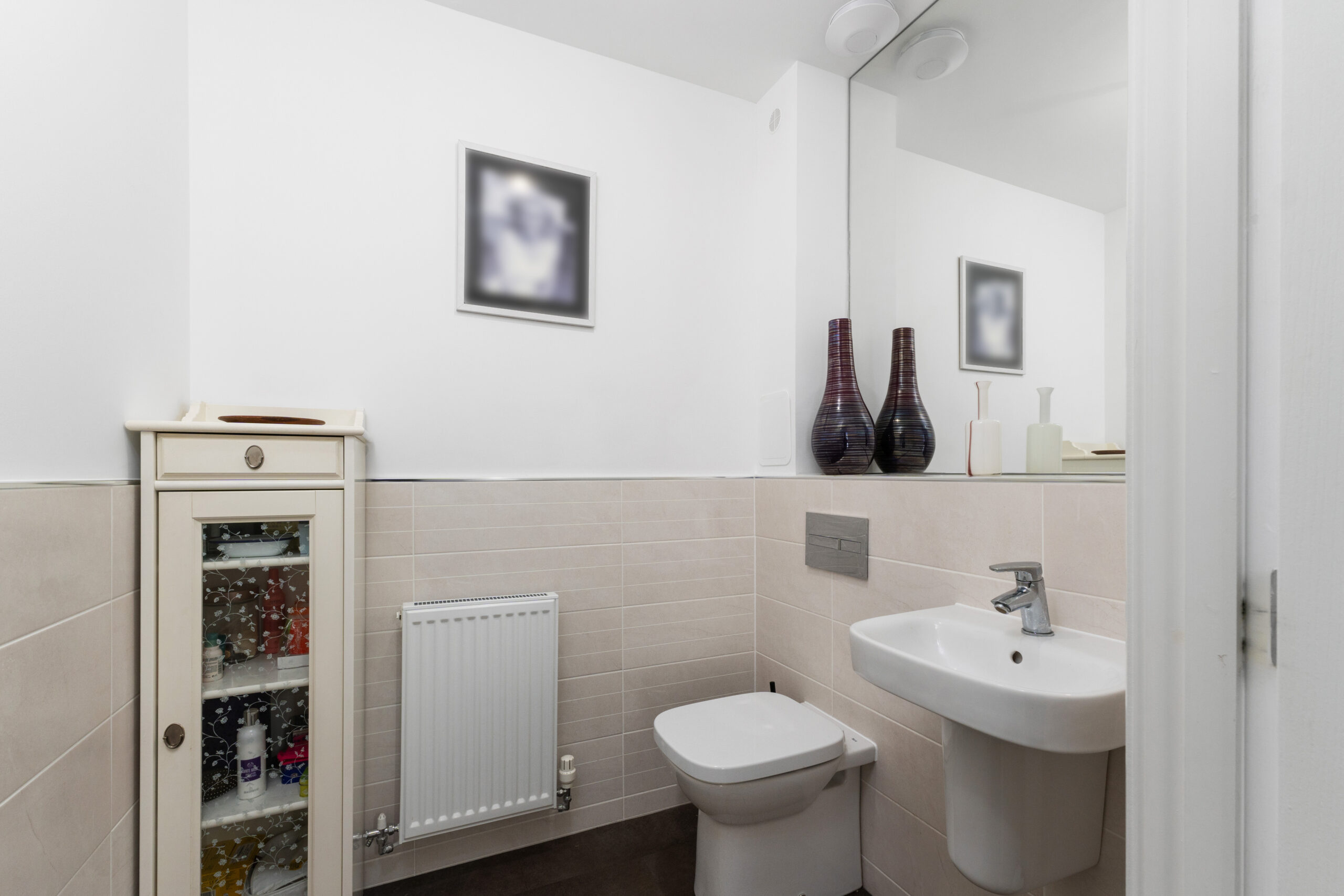A handy ground floor cloakroom adds everyday convenience, featuring stylish half-tiled walls, modern fittings, and a bespoke mirror that adds a touch of character and charm to this well-designed space.