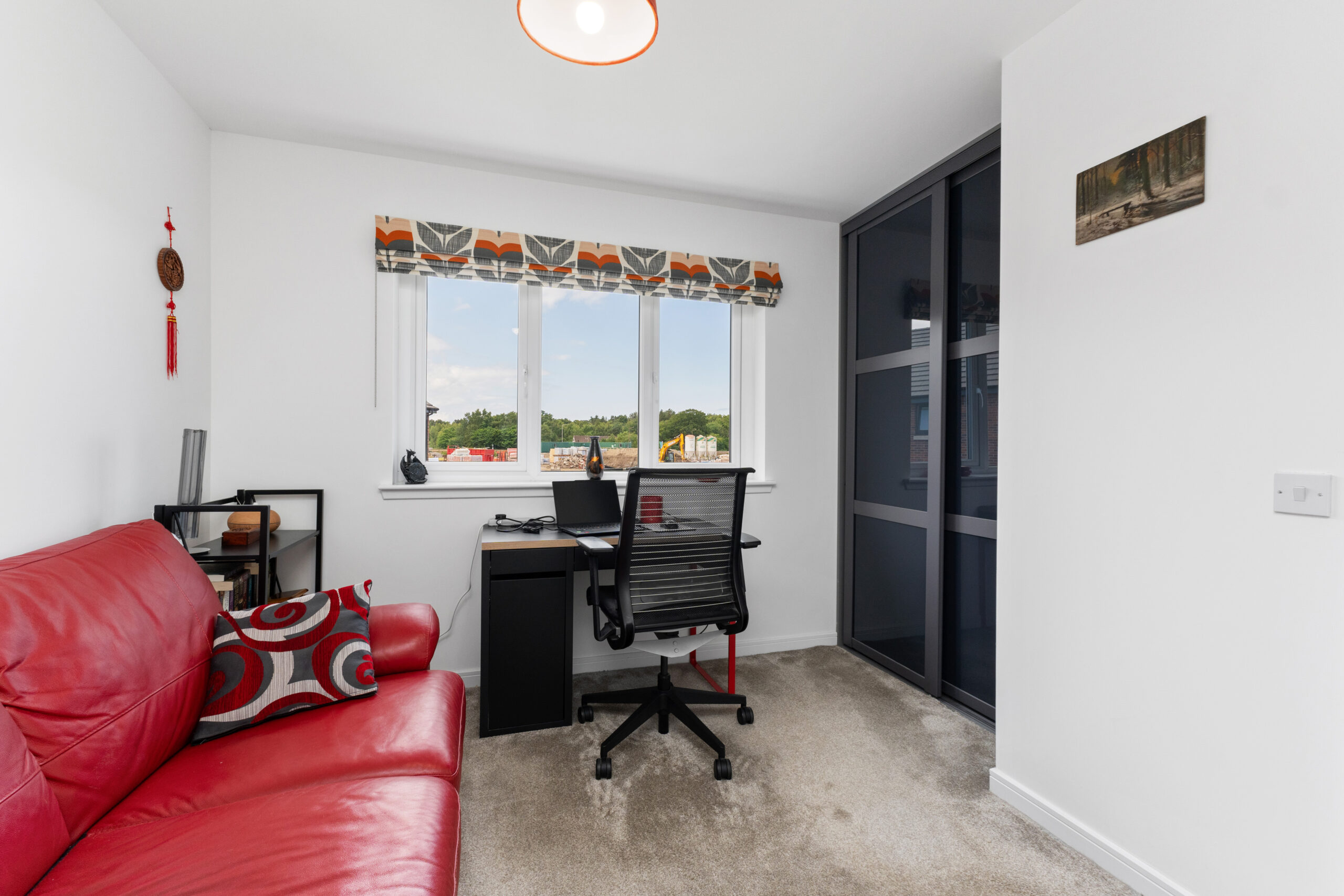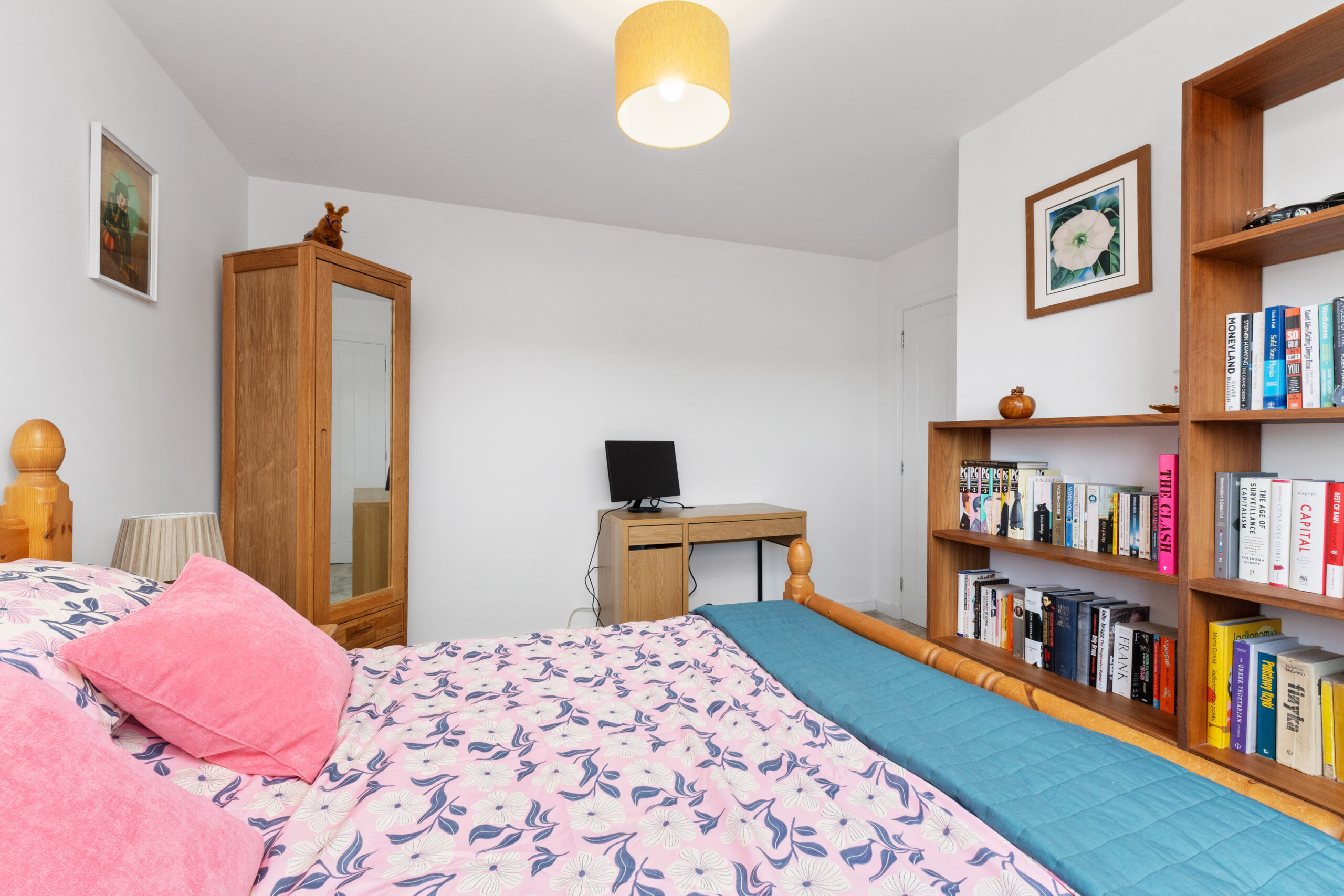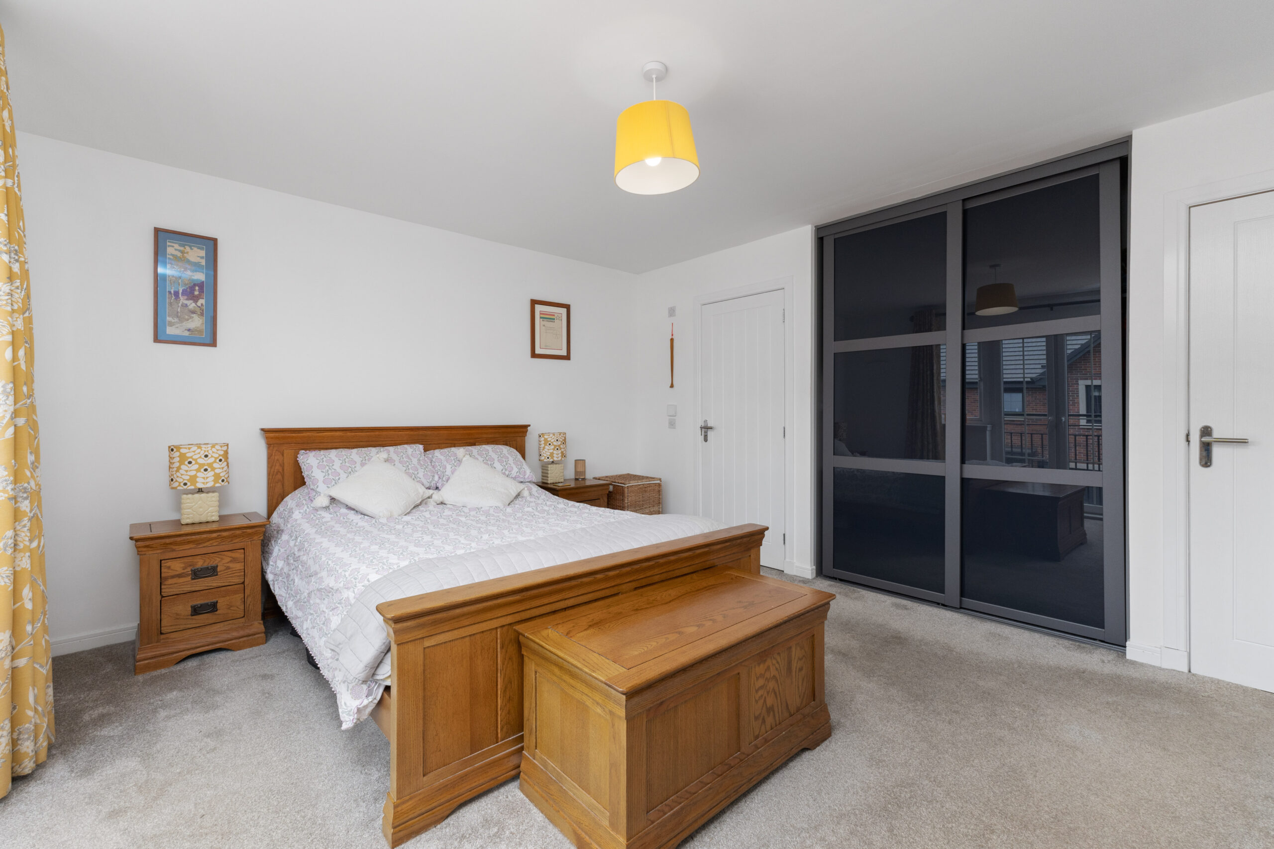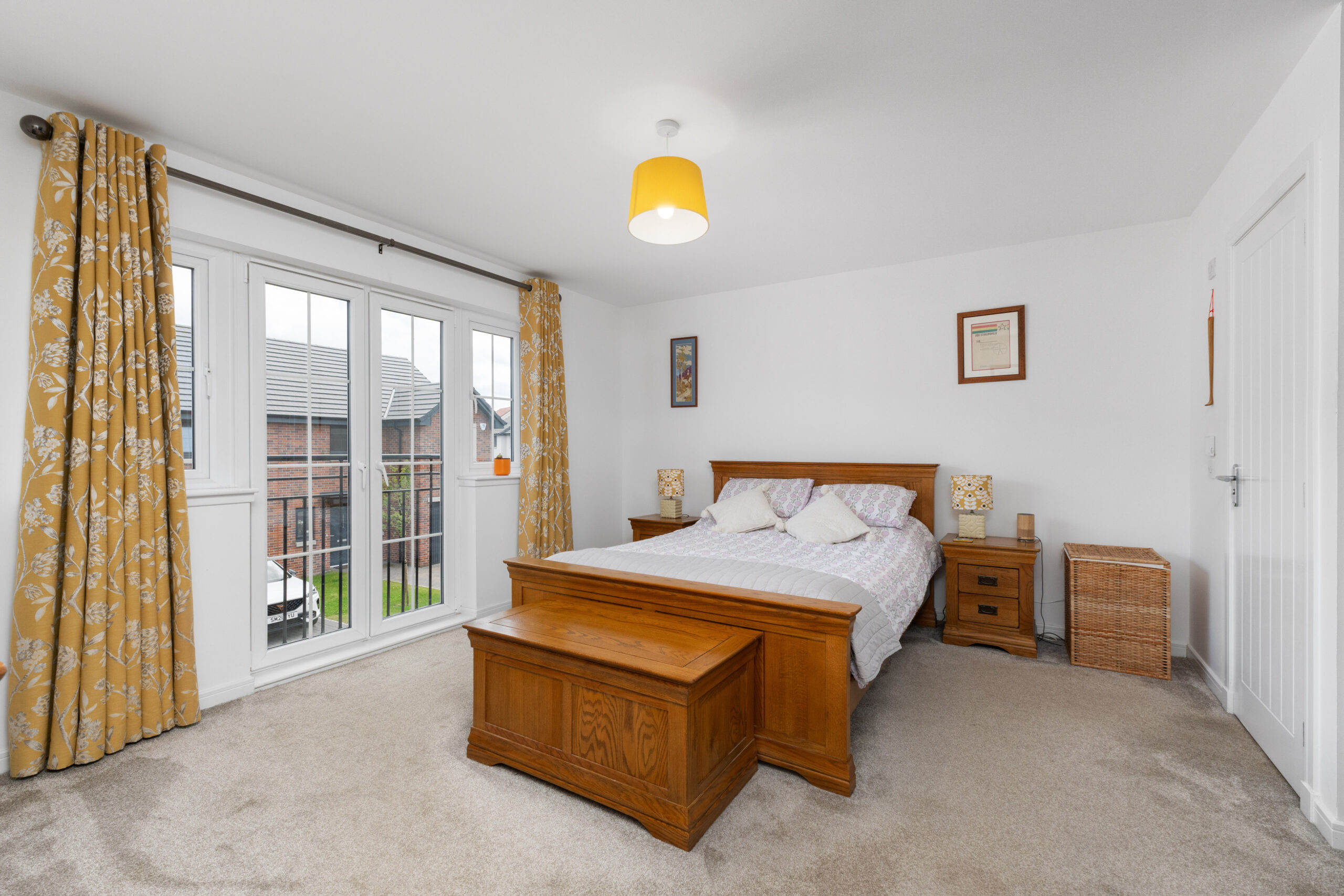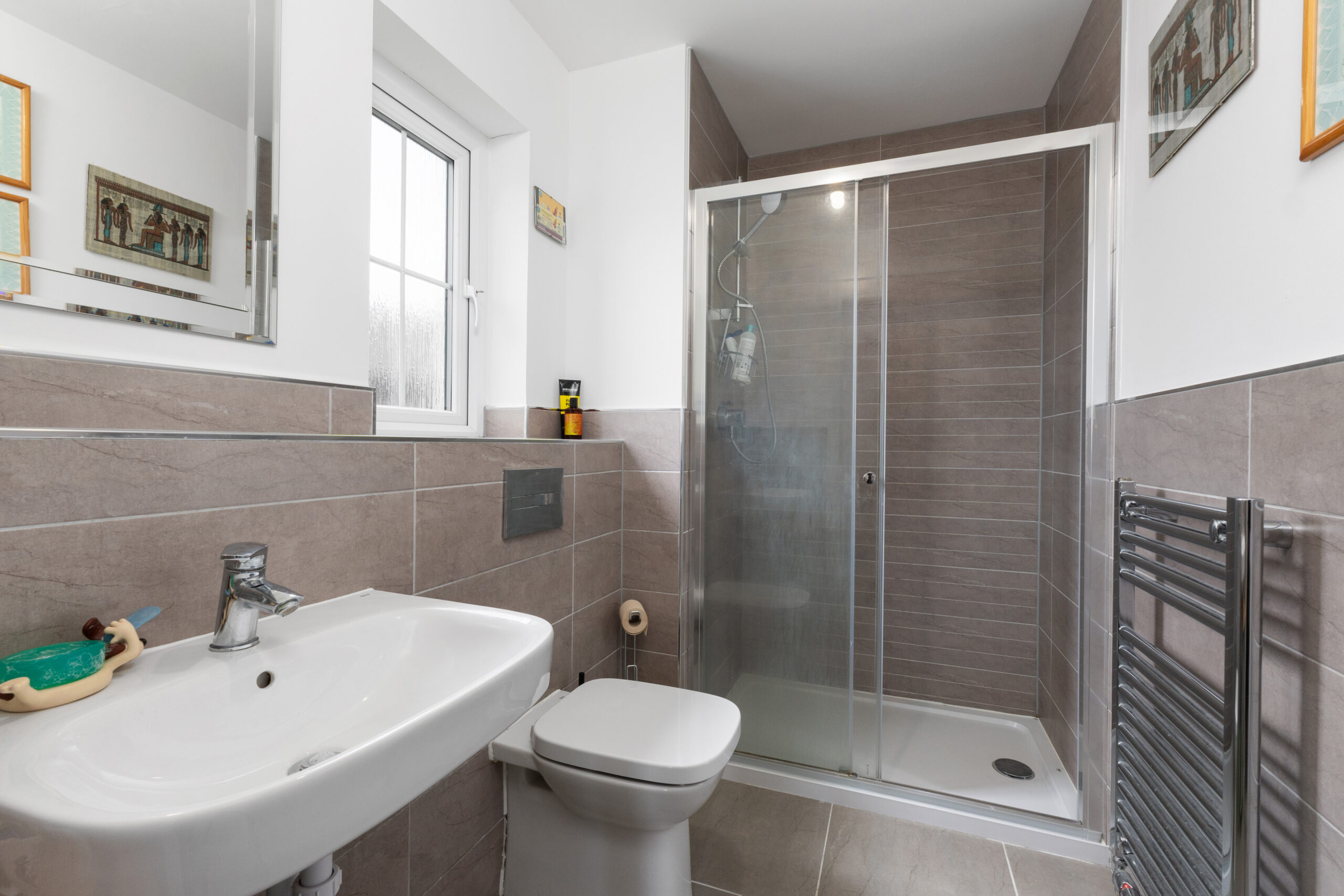 The principal bedroom sits to the front of the home and is a true sanctuary, complete with fitted wardrobes, a charming Juliette balcony-a perfect spot to let in the morning breeze or enjoy a moment of calm at the end of the day-and access to the luxury of an en suite shower room, featuring stylish tiling, a generous double shower enclosure, sleek white WC, and matching basin. All further bedrooms are generously proportioned and thoughtfully presented, offering superb flexibility for family living. Whether used as spacious bedrooms or productive work-from-home spaces, each room easily accommodates free-standing furniture and enjoys a bright, airy feel throughout.