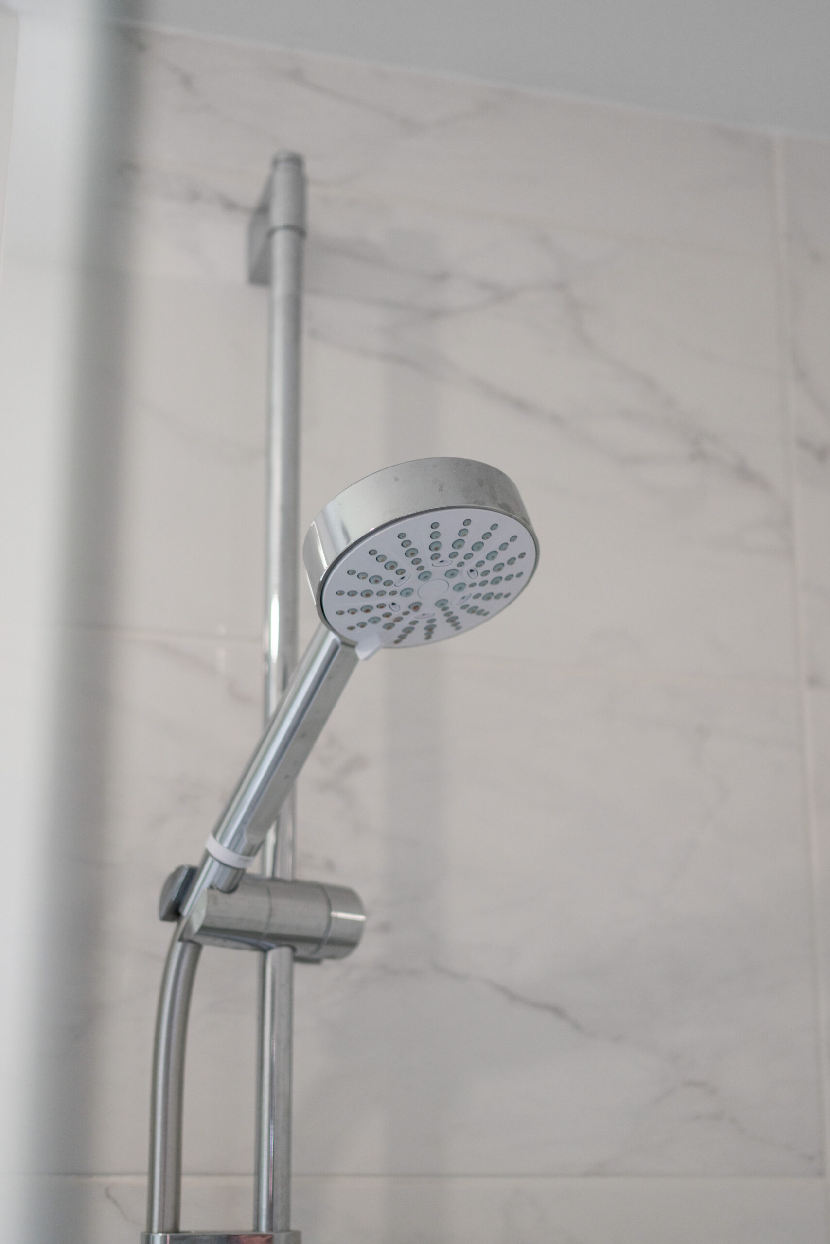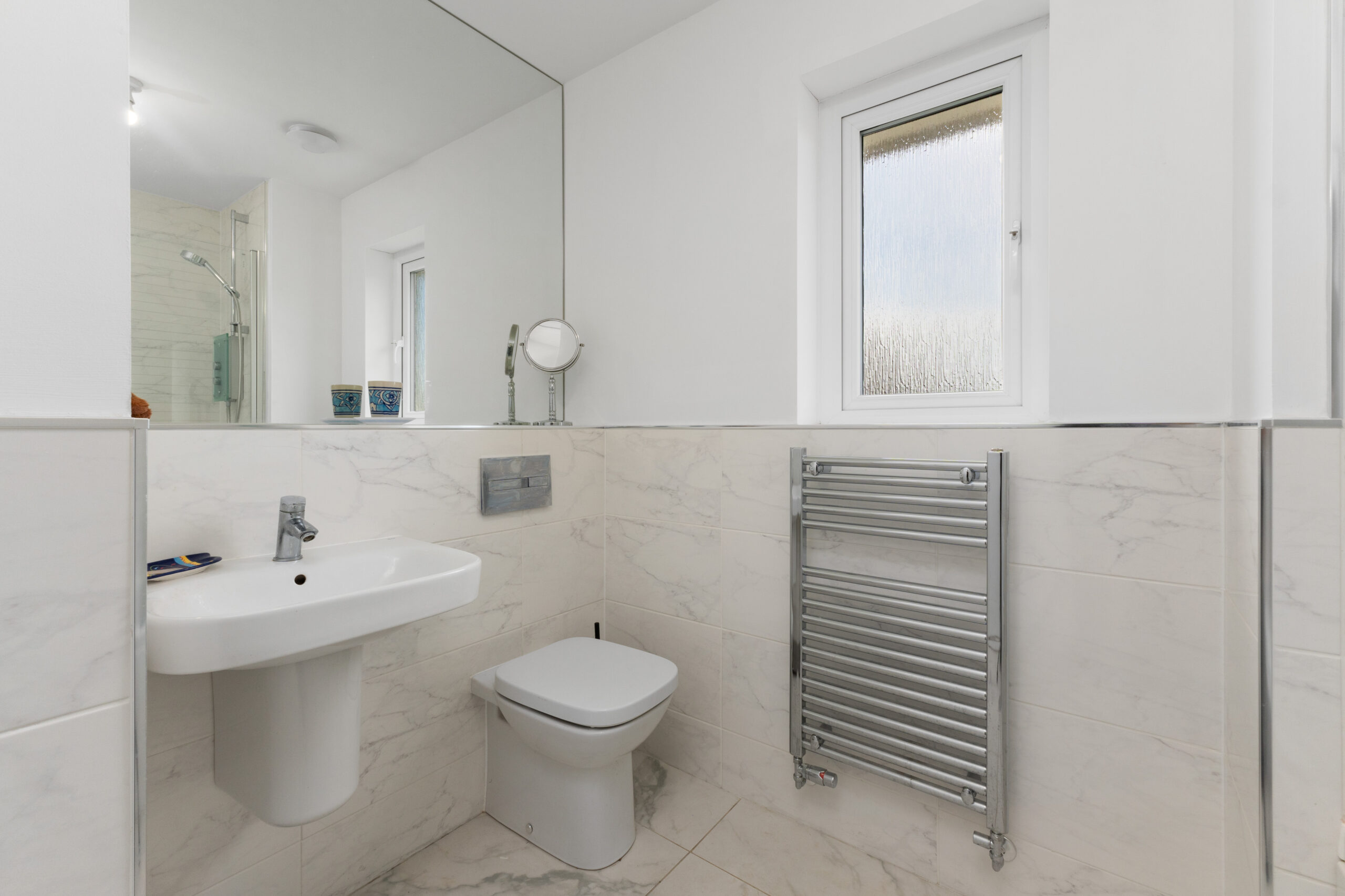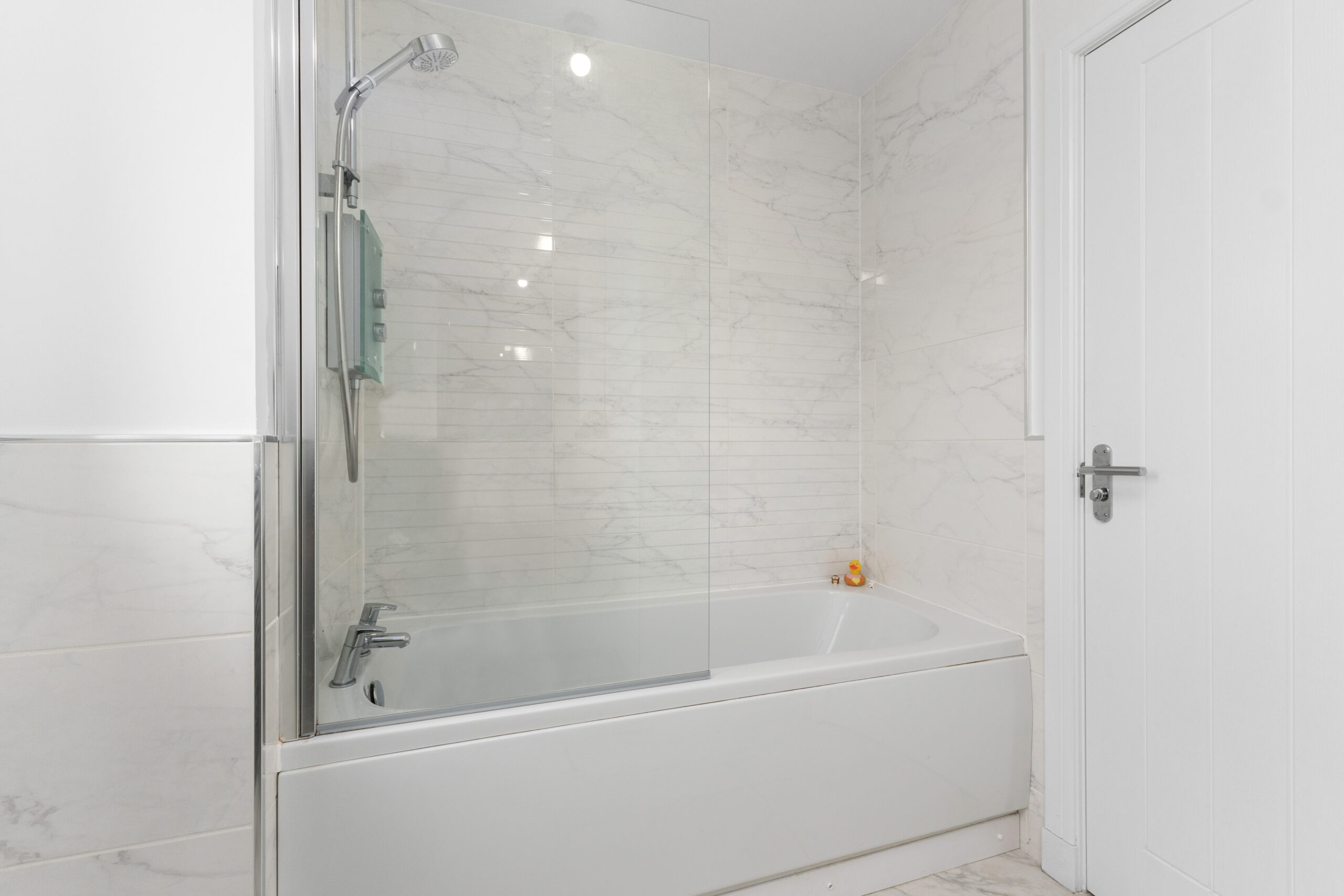 The family bathroom completes the accommodation showcasing a crisp white three-piece suite with a shower over the bath, finished with elegant marble-effect tiling to the walls and floor for a sleek, modern look.
