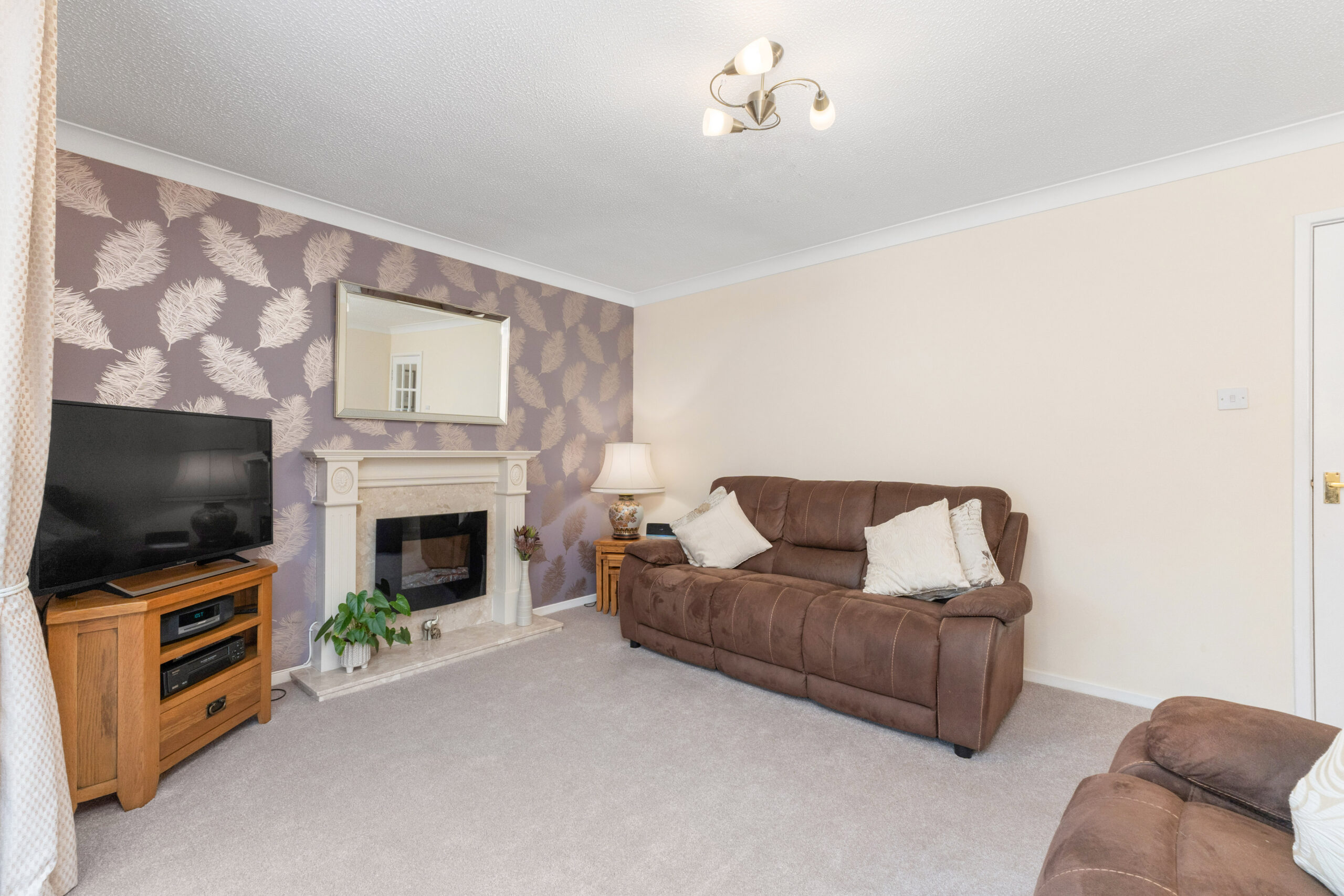 To the rear, the heart of the home awaits in the stylish yet cosy lounge. Soft carpet underfoot, neutral tones, and a feature wallpapered wall create a relaxing atmosphere, centred around an elegant electric fire and surround-perfect for cosy evenings in. Double doors open into a light-filled conservatory, offering a second reception space that's ideal for lazy weekend mornings or a quiet evening retreat. French doors lead out to the generous, south-east facing garden, inviting the outside in and creating a truly seamless connection between house and garden.