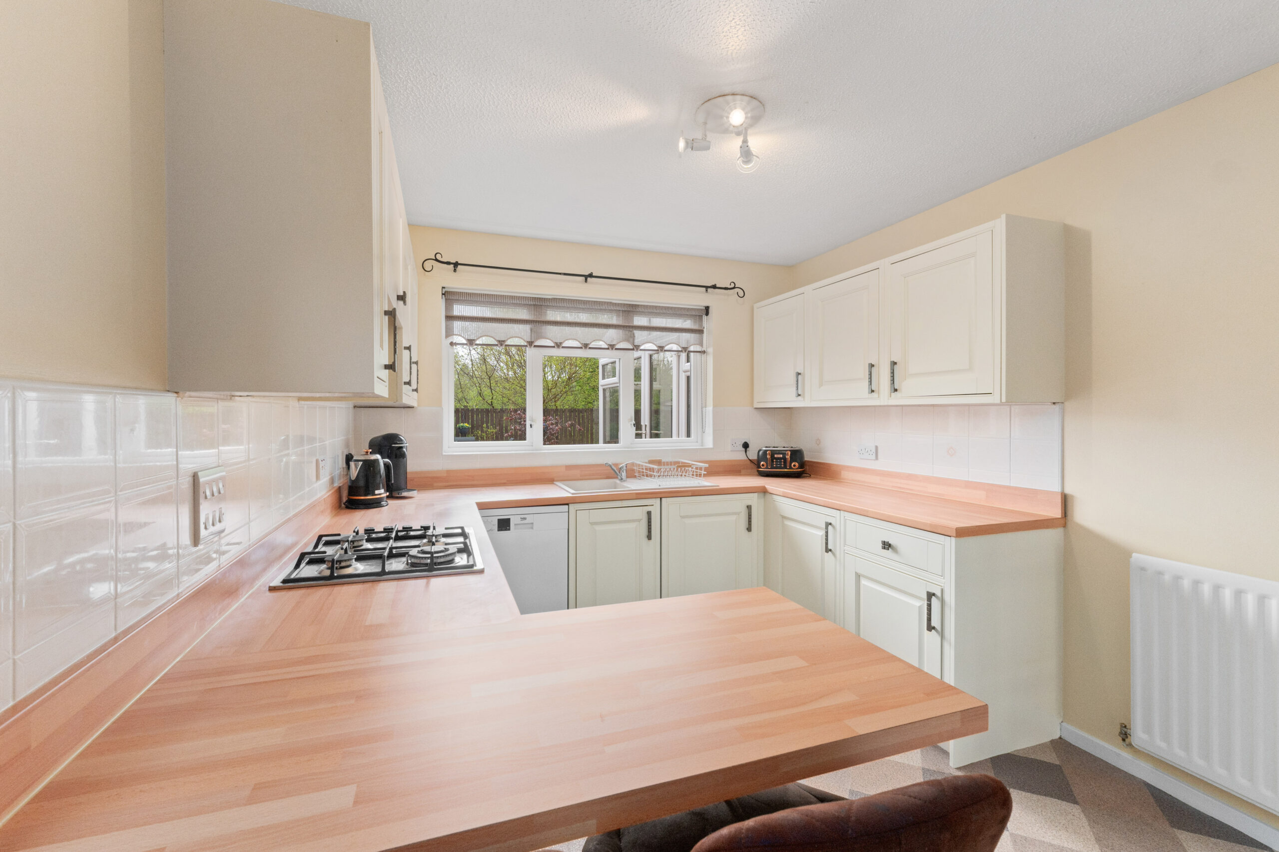 The breakfasting kitchen is a practical and social hub, designed for everyday living. Cream shaker-style units are paired with complementary worktops and stylish tiled splashbacks, delivering timeless appeal. The breakfast bar provides the perfect spot for morning coffee or after-school snacks, while integrated appliances including an oven, hob, freezer and washing machine add functionality. There's also space for a slimline dishwasher and fridge/freezer, both of which are included in the sale. A door leads directly out to the garden, making summer barbecues and alfresco dining effortless.