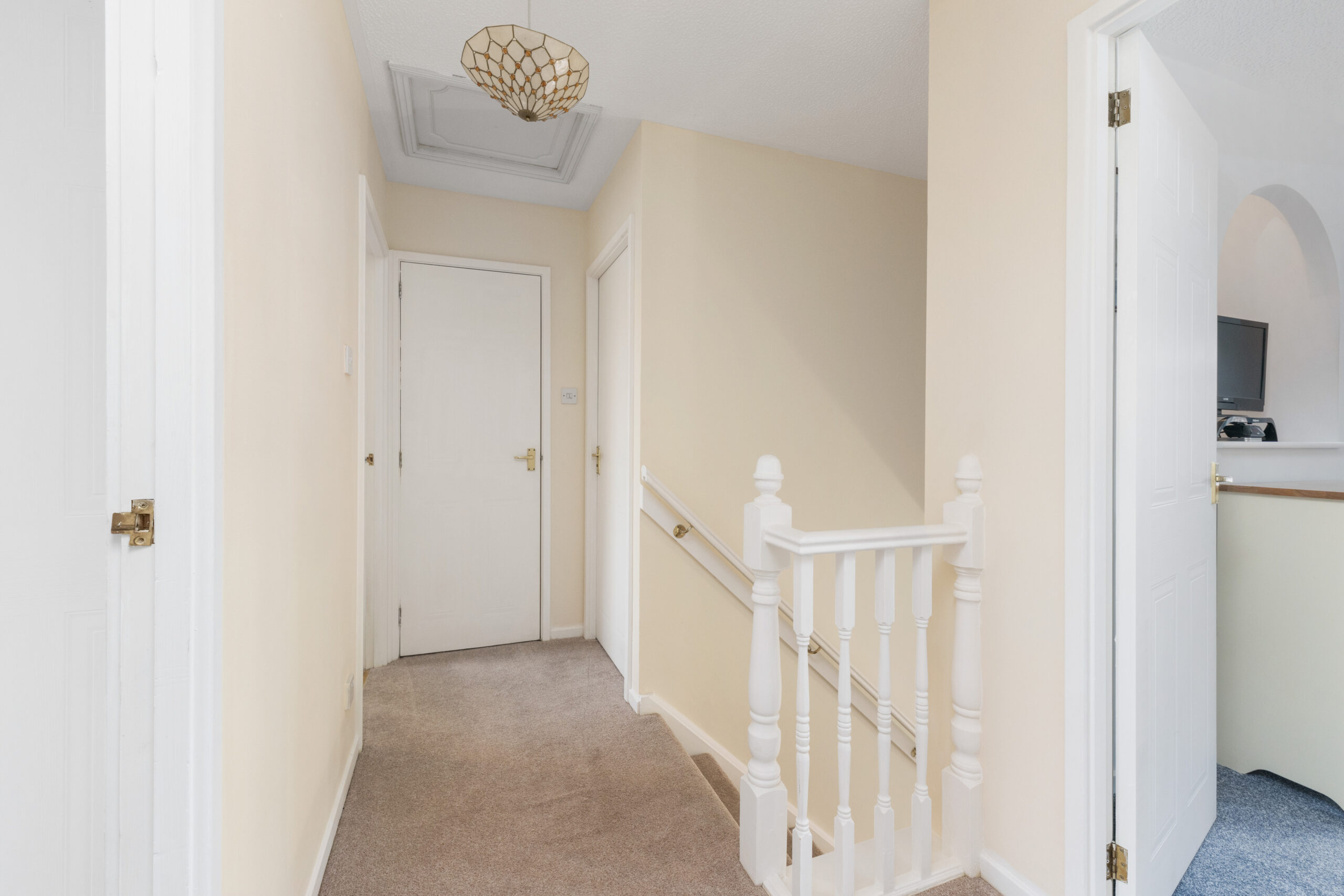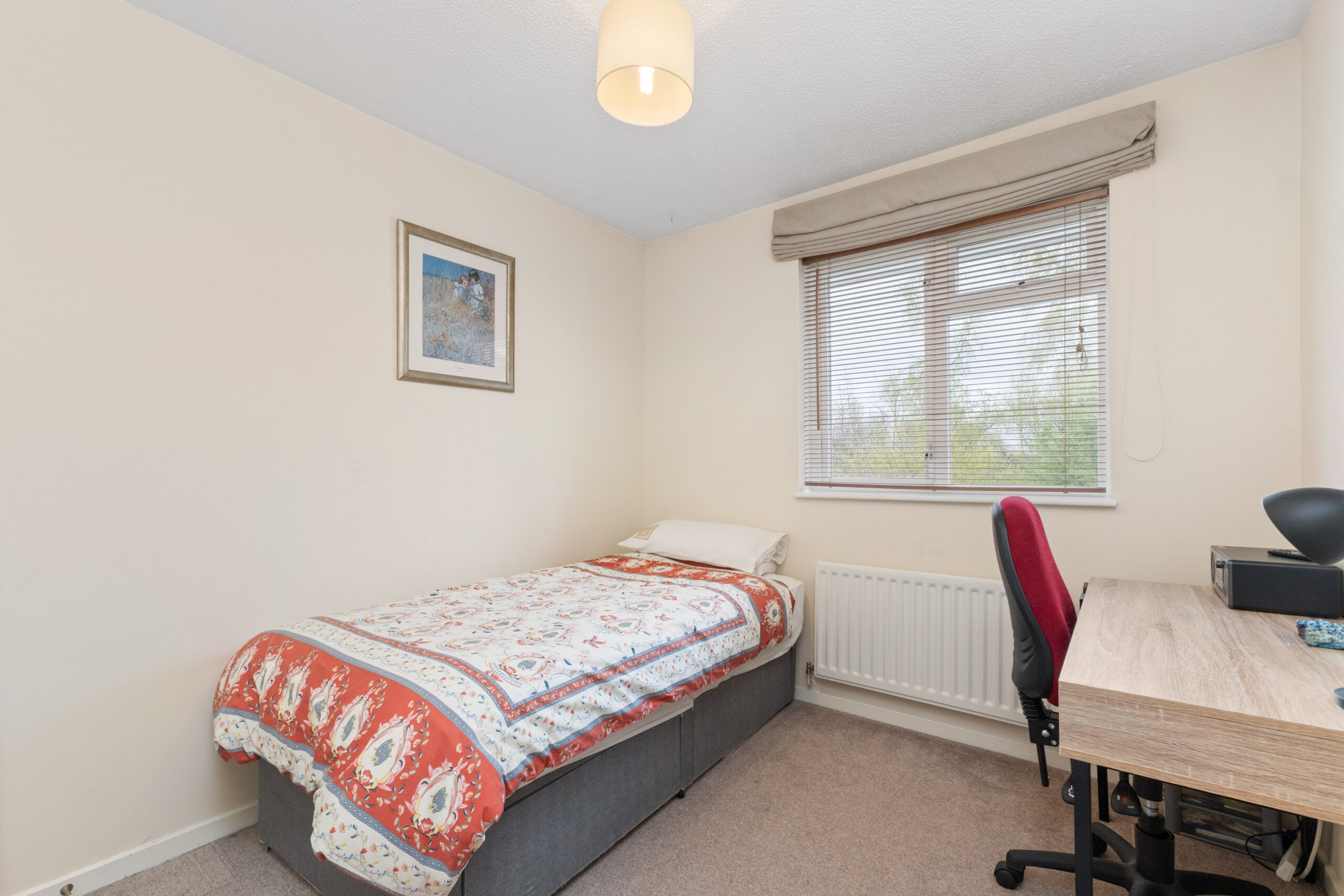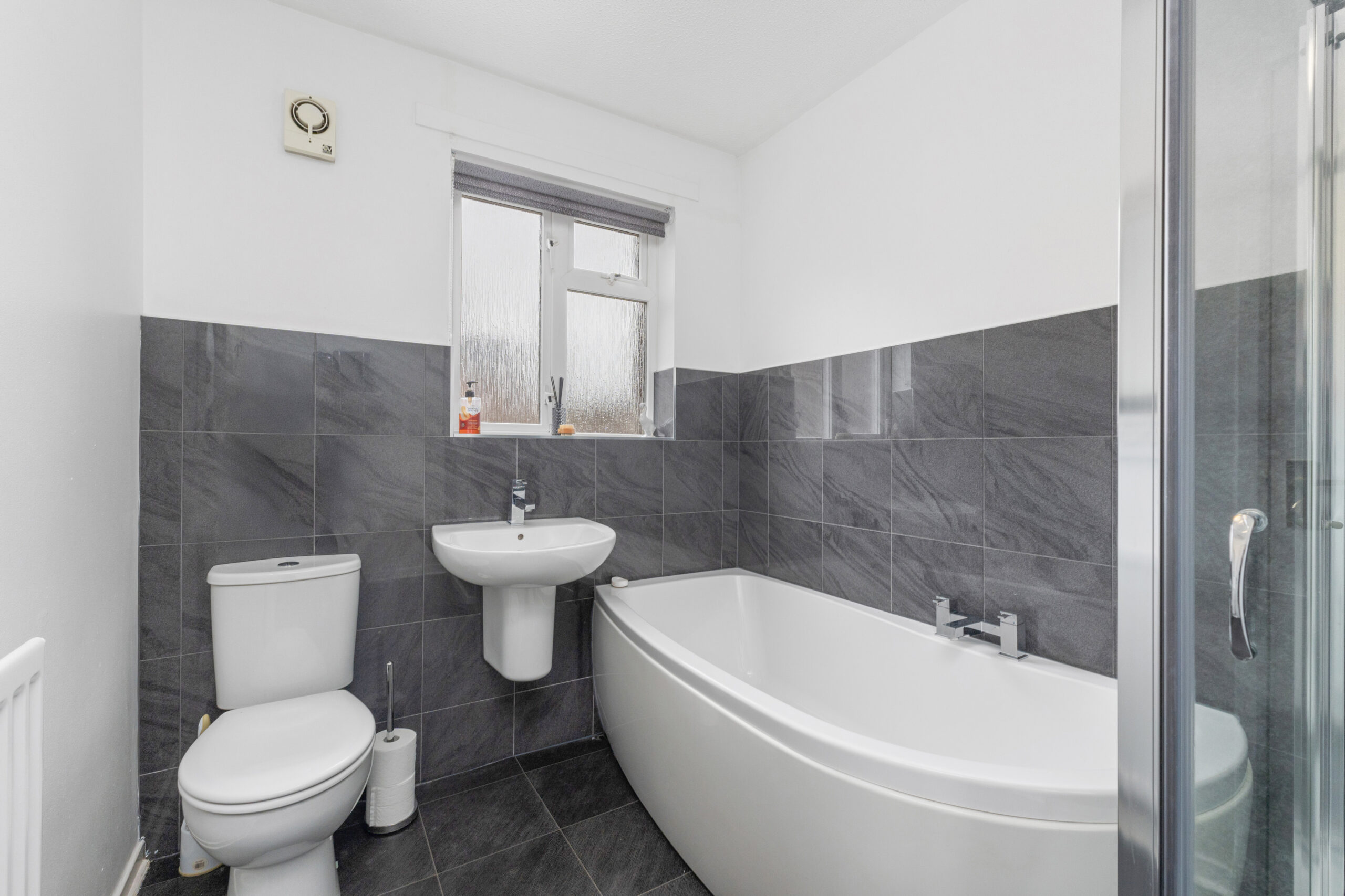 Bedroom two is another spacious double, complete with fitted wardrobes, while bedrooms three and four are equally well-sized-ideal for children, guests, or a dedicated home office-and both benefit from built-in storage. All bedrooms are carpeted for comfort and presented in move-in-ready condition. The stylish family bathroom completes the upper level and offers a touch of luxury, with a four-piece suite including a bath, WC, wash hand basin, and a separate shower cubicle. Grey tiles and wet wall panelling create a modern, spa-like feel-perfect for relaxing after a long day.