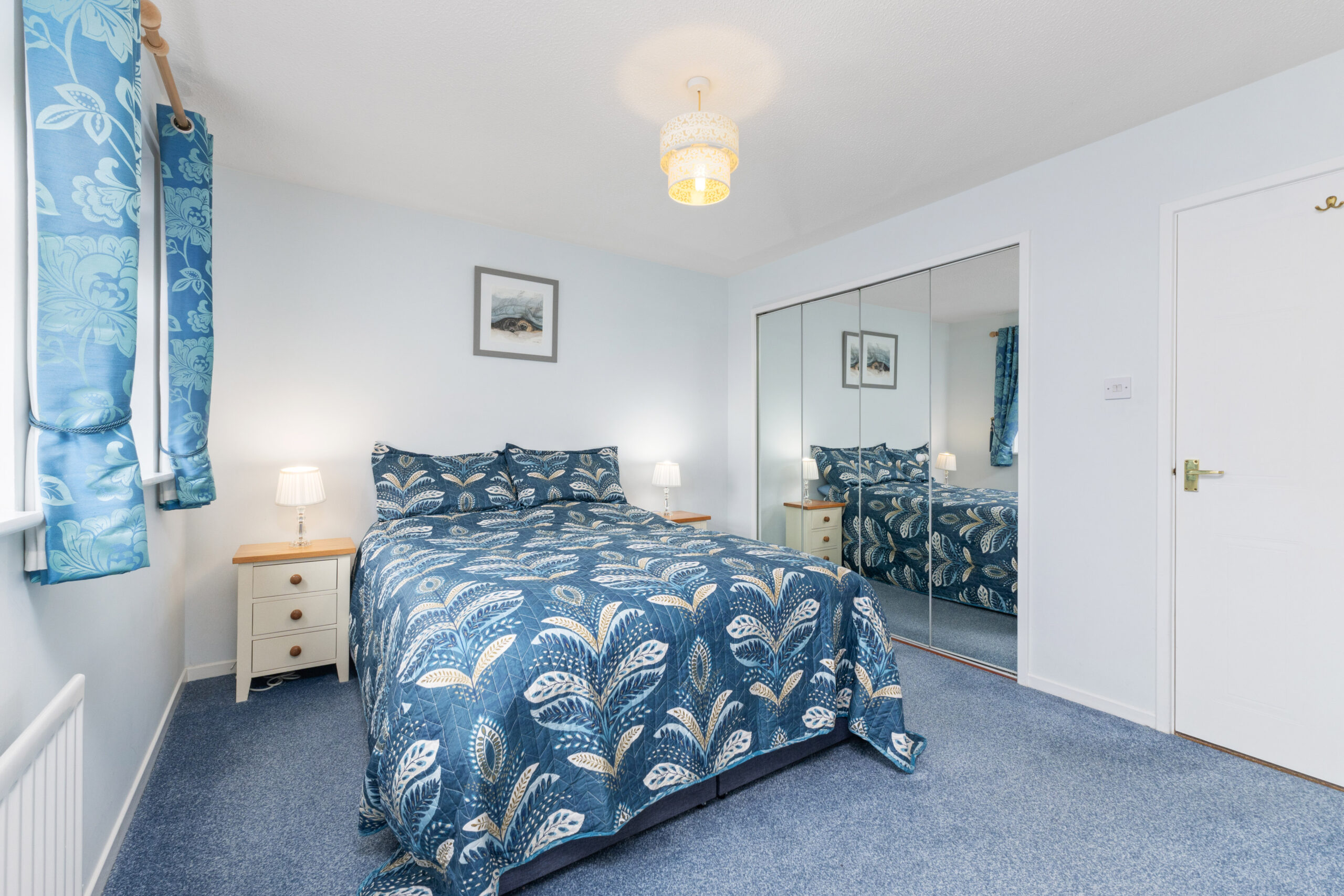 Upstairs, the carpeted staircase leads to a spacious landing and four generously proportioned bedrooms. Each room is well-presented, providing flexibility for families, guests or home working. The master bedroom is a standout, elegantly styled in soft neutral tones, with triple front-facing windows that bathe the room in light. Built-in mirrored wardrobes offer excellent storage, while a charming niche creates the perfect space for a TV or display area. The en suite is sleek and contemporary, with a white three-piece suite, tiled flooring, modern wet wall panelling, and bright white splashback tiles for a crisp, clean finish.