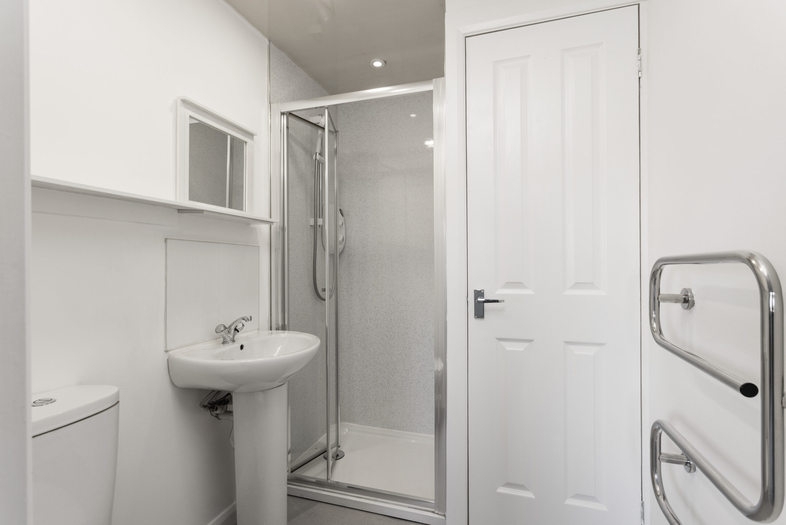 The bedroom, carpeted for comfort, continues the fresh neutral decor, offering a relaxing space. The shower room is equally well-appointed with a white suite, including a convenient shower cubicle, and is finished with white splashback tiles and wet wall panelling.