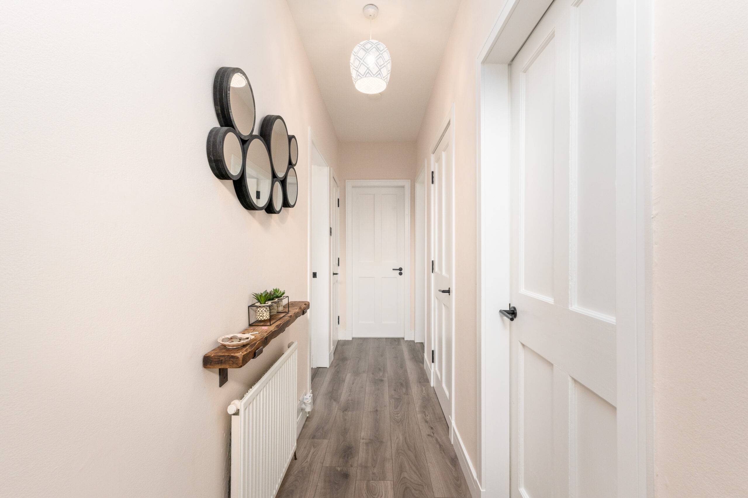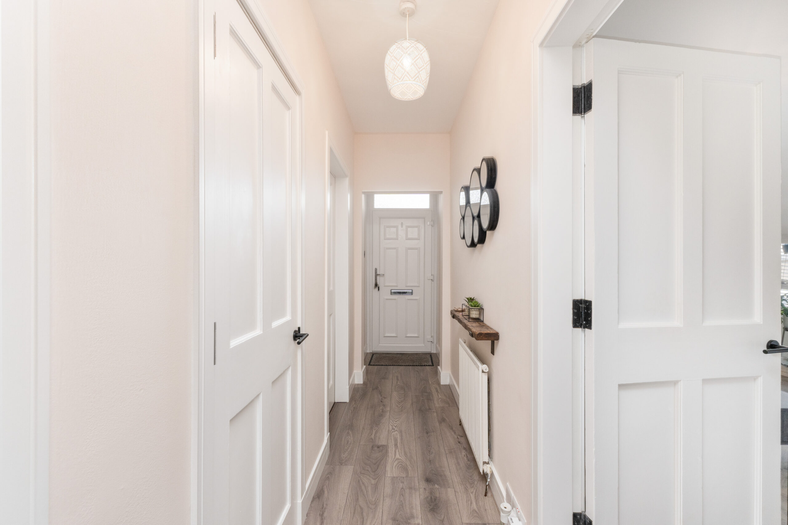 The property benefits from gardens to the front and rear, a private driveway, and ample on-street parking. Upon entering, the welcoming hallway provides access to all rooms and features laminate flooring, along with two large storage cupboards, ideal for keeping everyday essentials neatly tucked away.