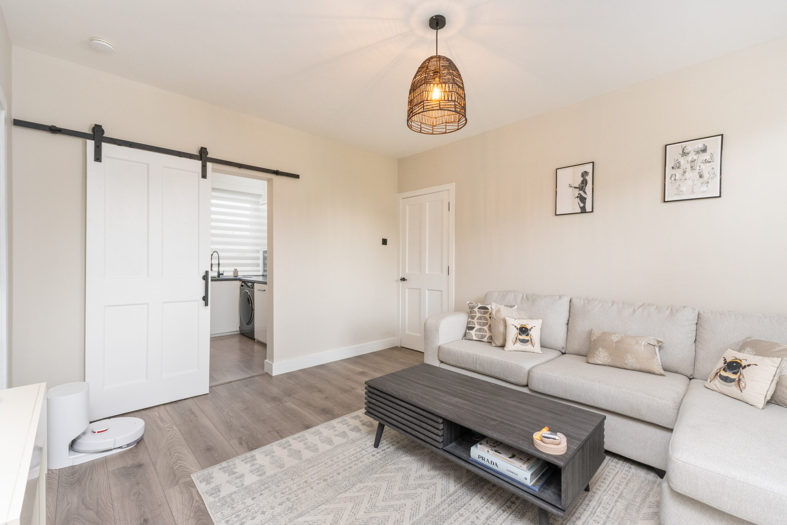 The sun-drenched lounge is a warm and inviting space, filled with natural light from its twin front-facing windows. A wall-mounted electric fire adds a cosy touch, while the neutral decor and laminate flooring create a modern yet comfortable setting. A sliding door leads to the contemporary kitchen, a statement of style which boasts sleek white gloss base and wall units, an integrated oven and hob, a dishwasher, and space for a fridge/freezer and washing machine. Complementing worktops and splashback complete the look perfectly, with a door providing direct access to the rear garden.