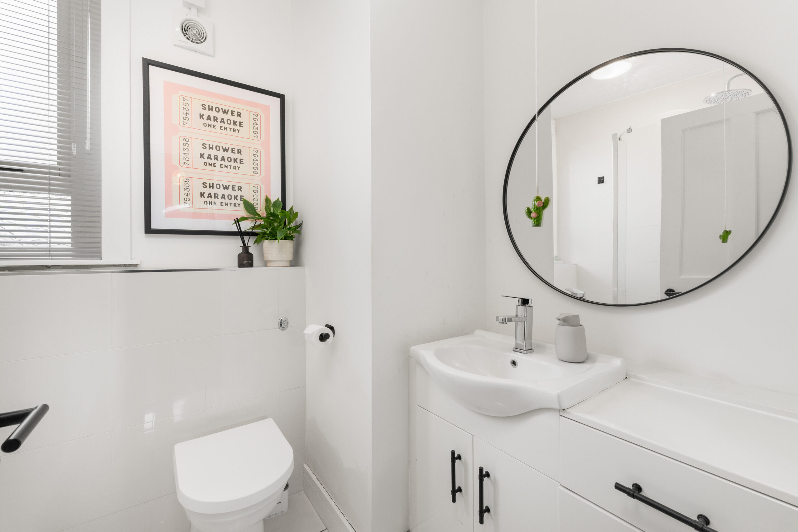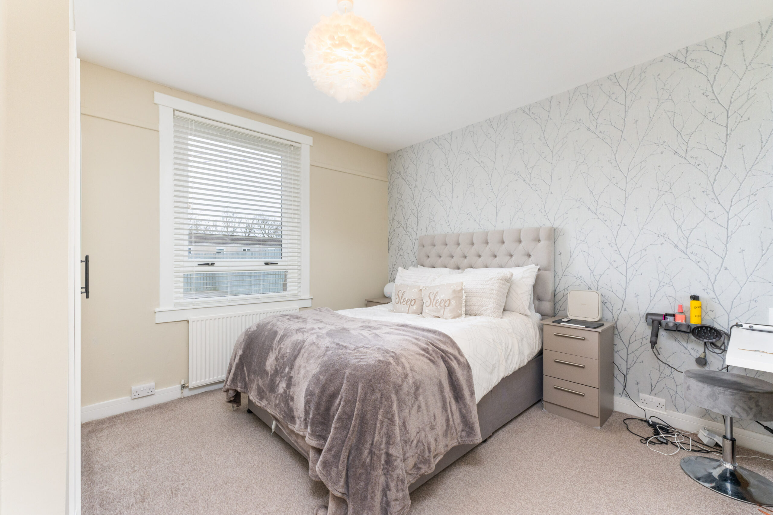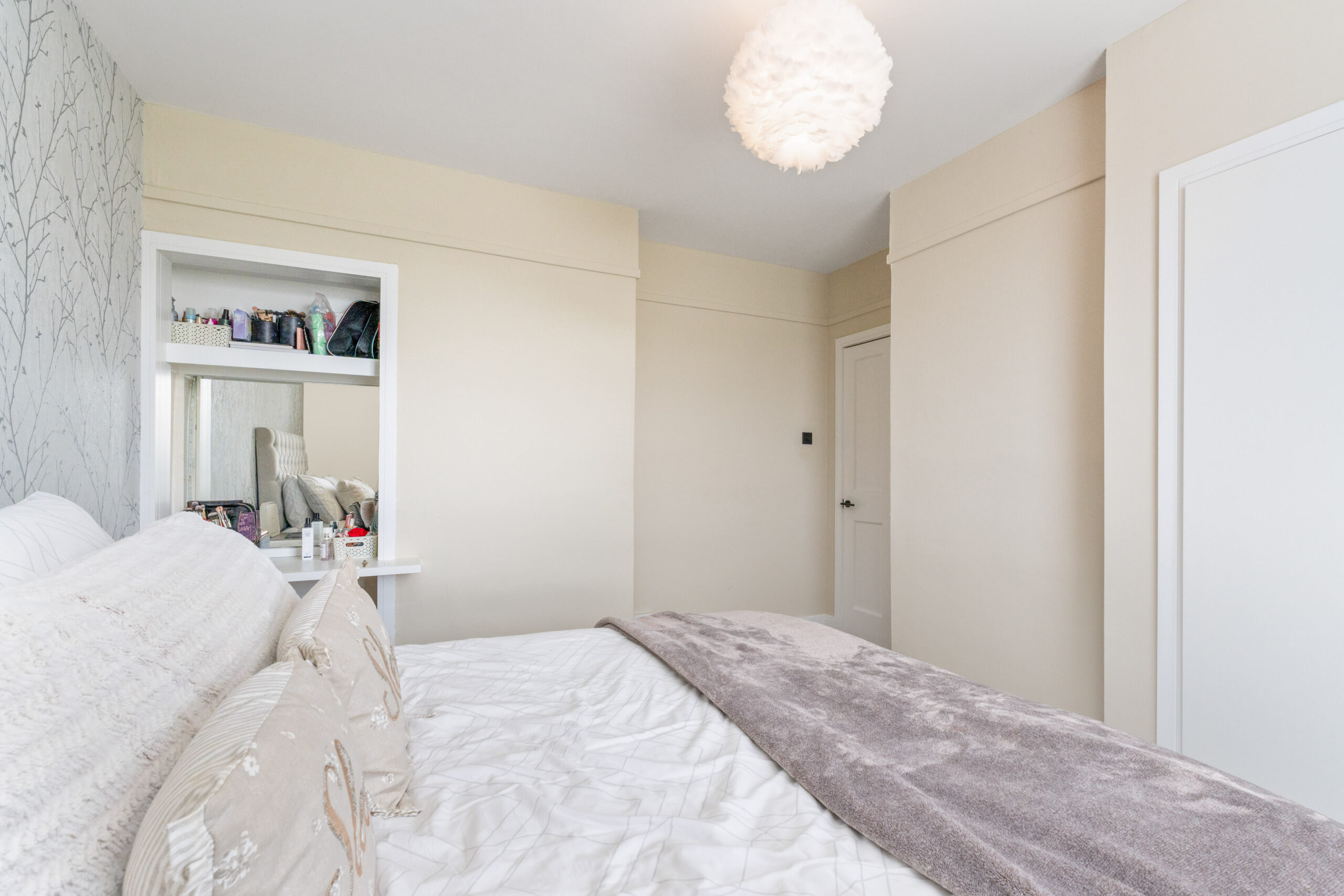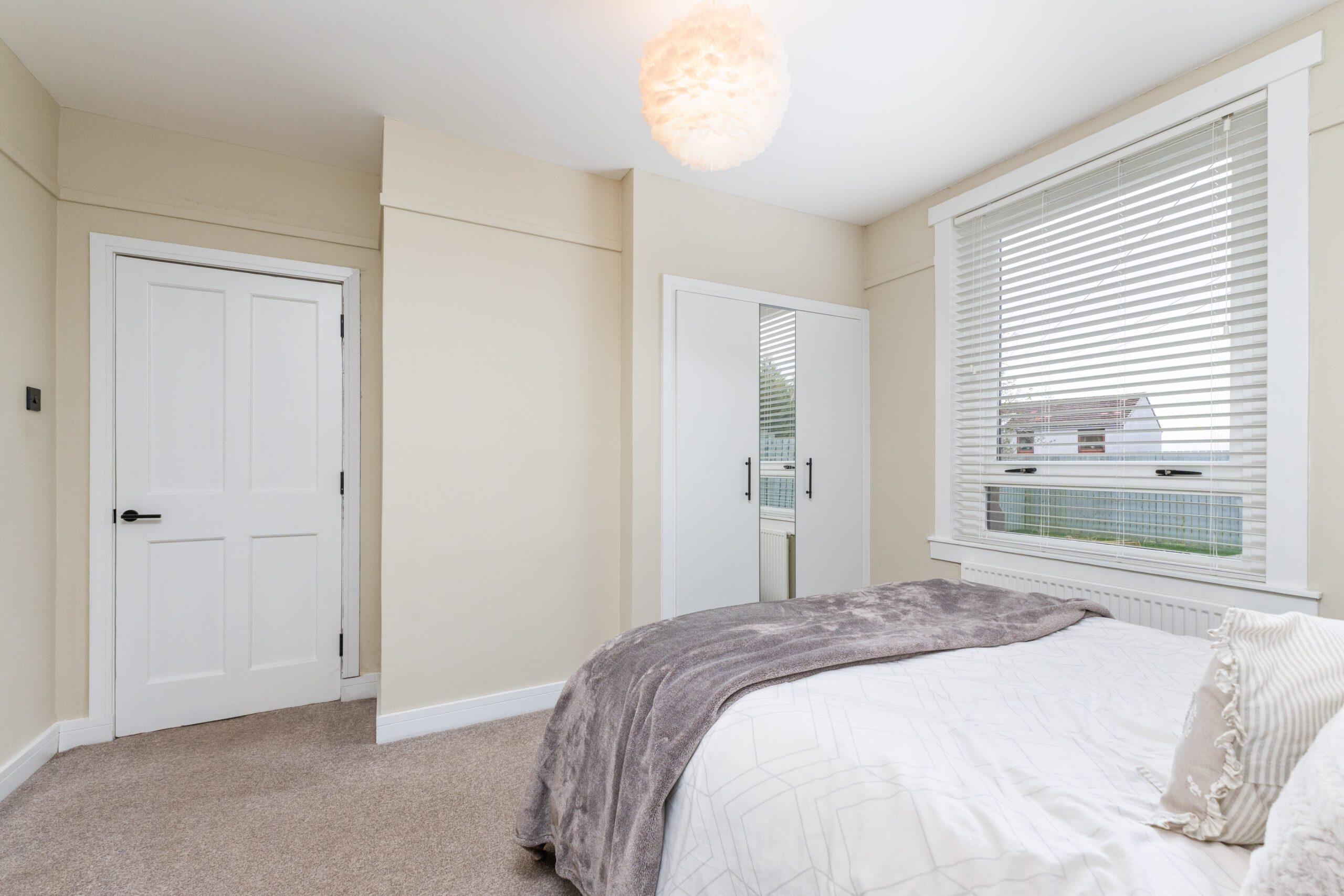 Both bedrooms exude tranquillity. The main bedroom is a generous double, overlooking the rear garden, and features calming neutral tones with a chic accent wall. A fitted wardrobe offers excellent storage, and the niche is perfectly suited for a dressing/makeup table. The second bedroom, positioned at the front of the property, is another spacious double, featuring bright neutral decor, laminate flooring and ample space for free-standing furniture.