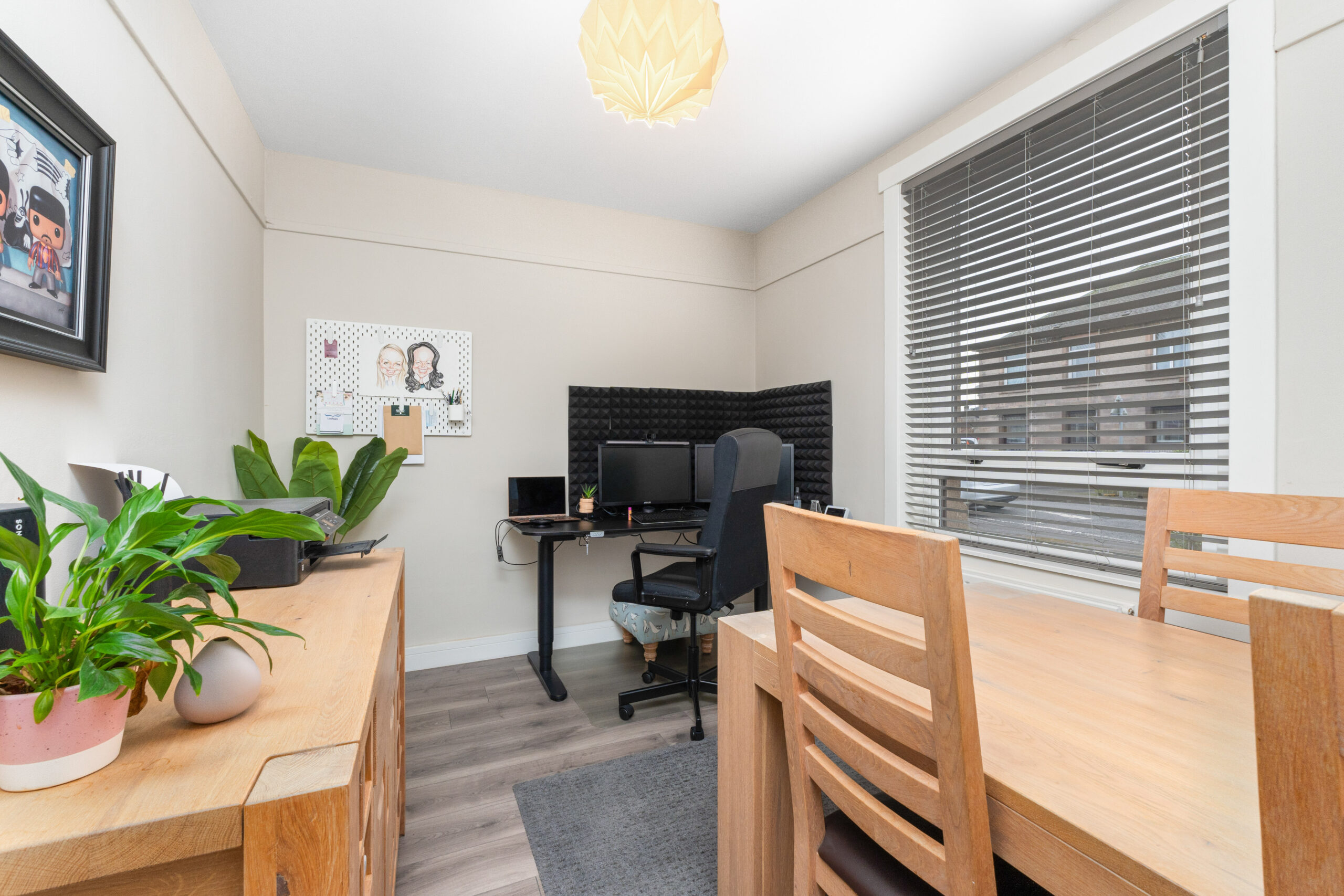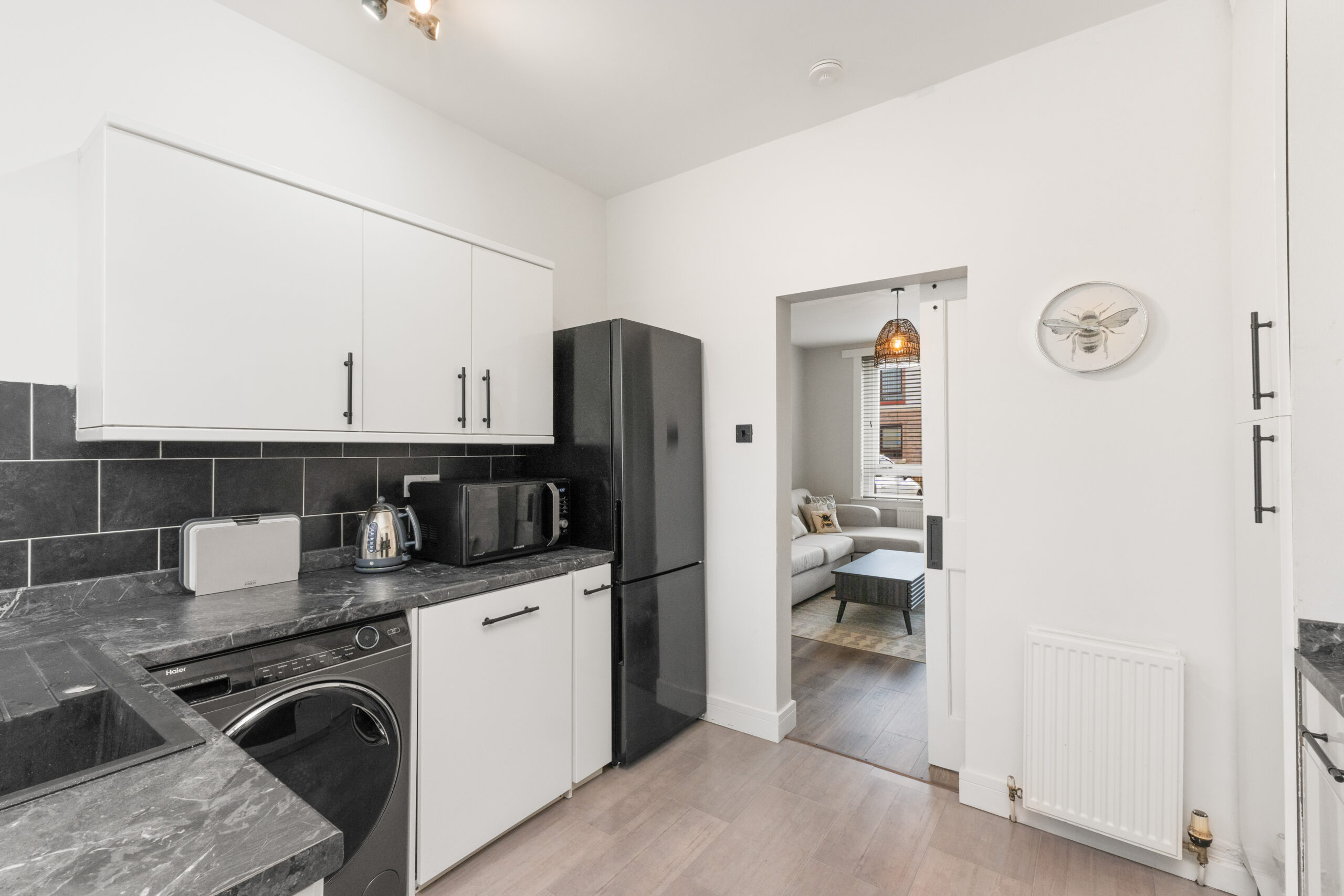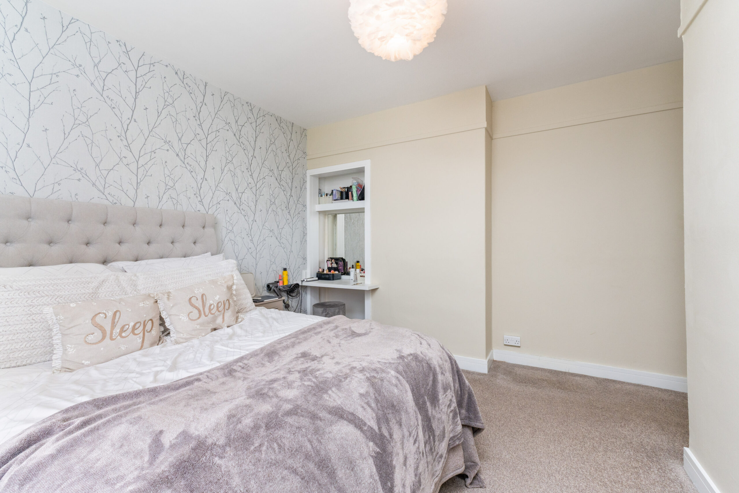 Both bedrooms exude tranquillity. The main bedroom is a generous double, overlooking the rear garden, and features calming neutral tones with a chic accent wall. A fitted wardrobe offers excellent storage, and the niche is perfectly suited for a dressing/makeup table. The second bedroom, positioned at the front of the property, is another spacious double, featuring bright neutral decor, laminate flooring and ample space for free-standing furniture.