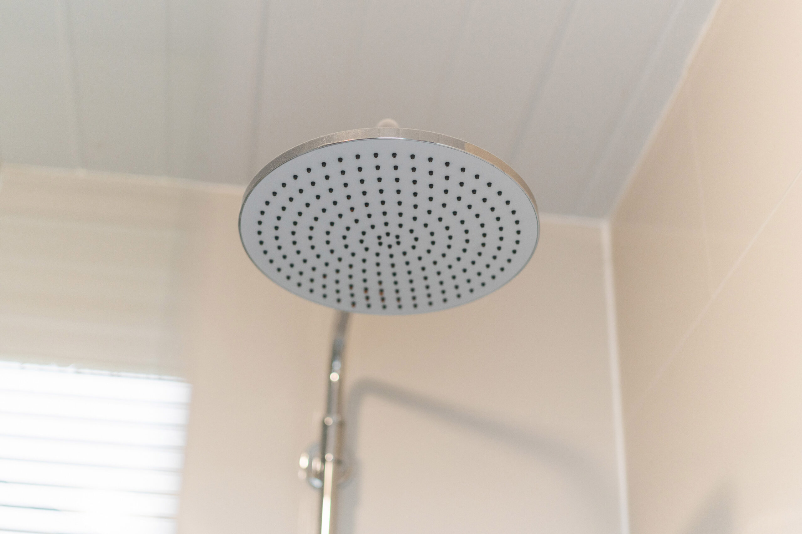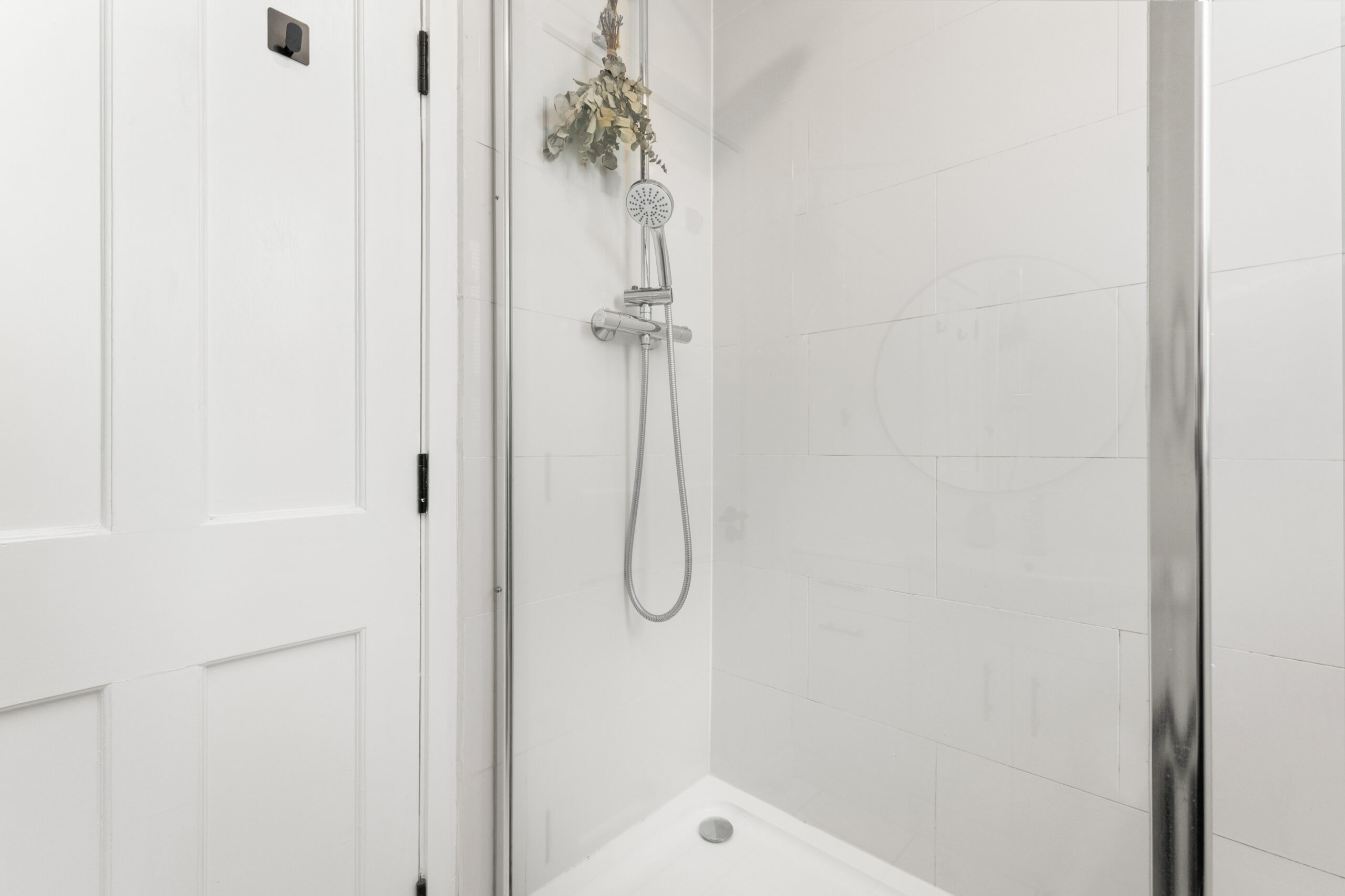 The modern shower room is finished to a high standard, comprising a sleek white three-piece suite with a WC, a wash hand basin with storage below, and a double shower enclosure. Stylish tiling on the floor and most walls, along with contemporary black handles, add a modern touch. A rear-facing window allows natural light to fill the space.