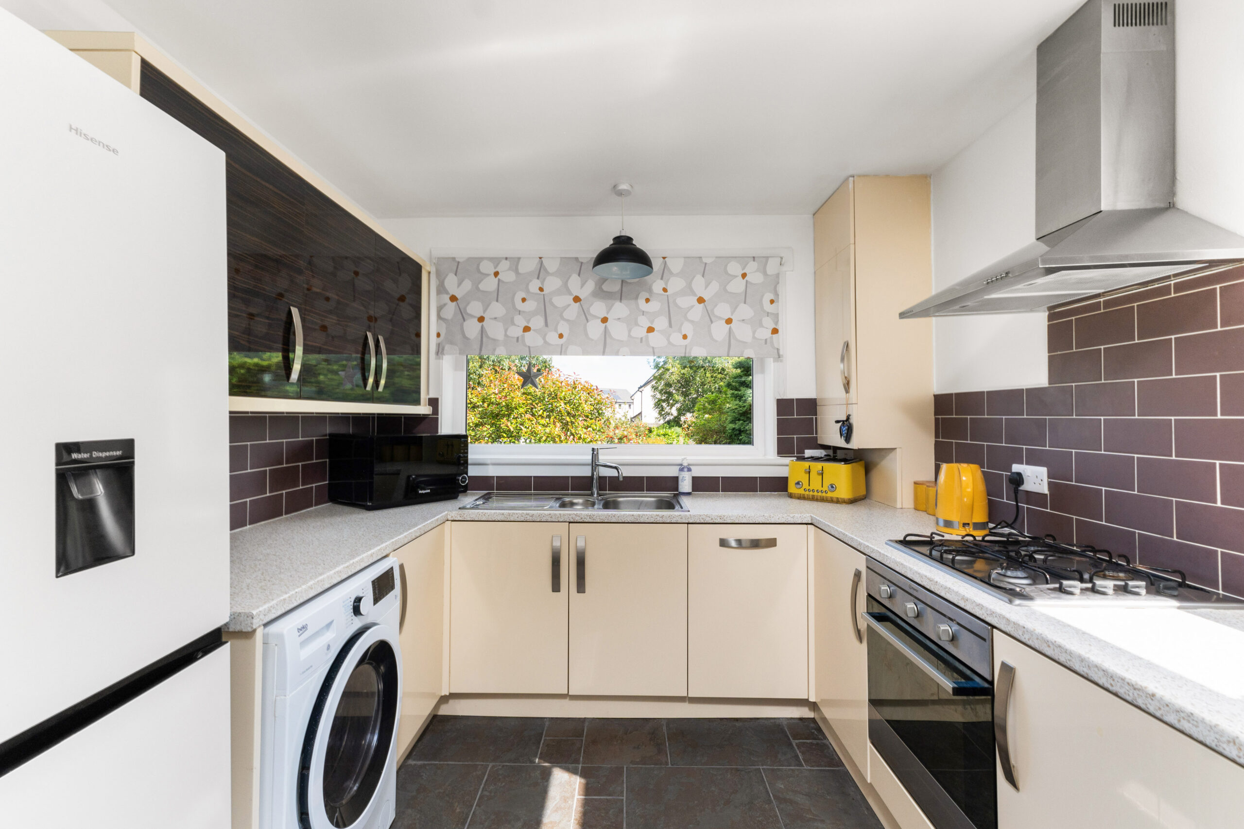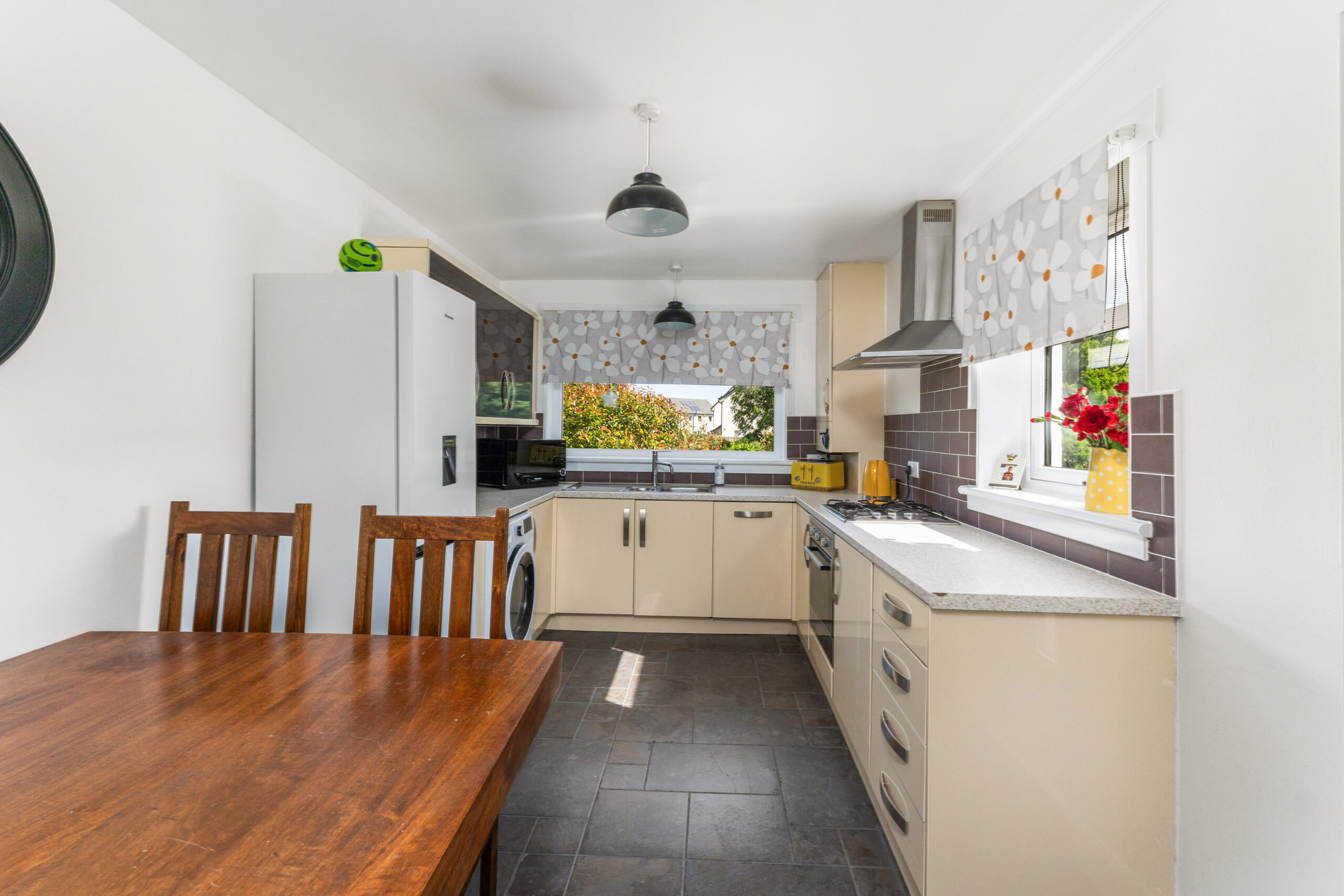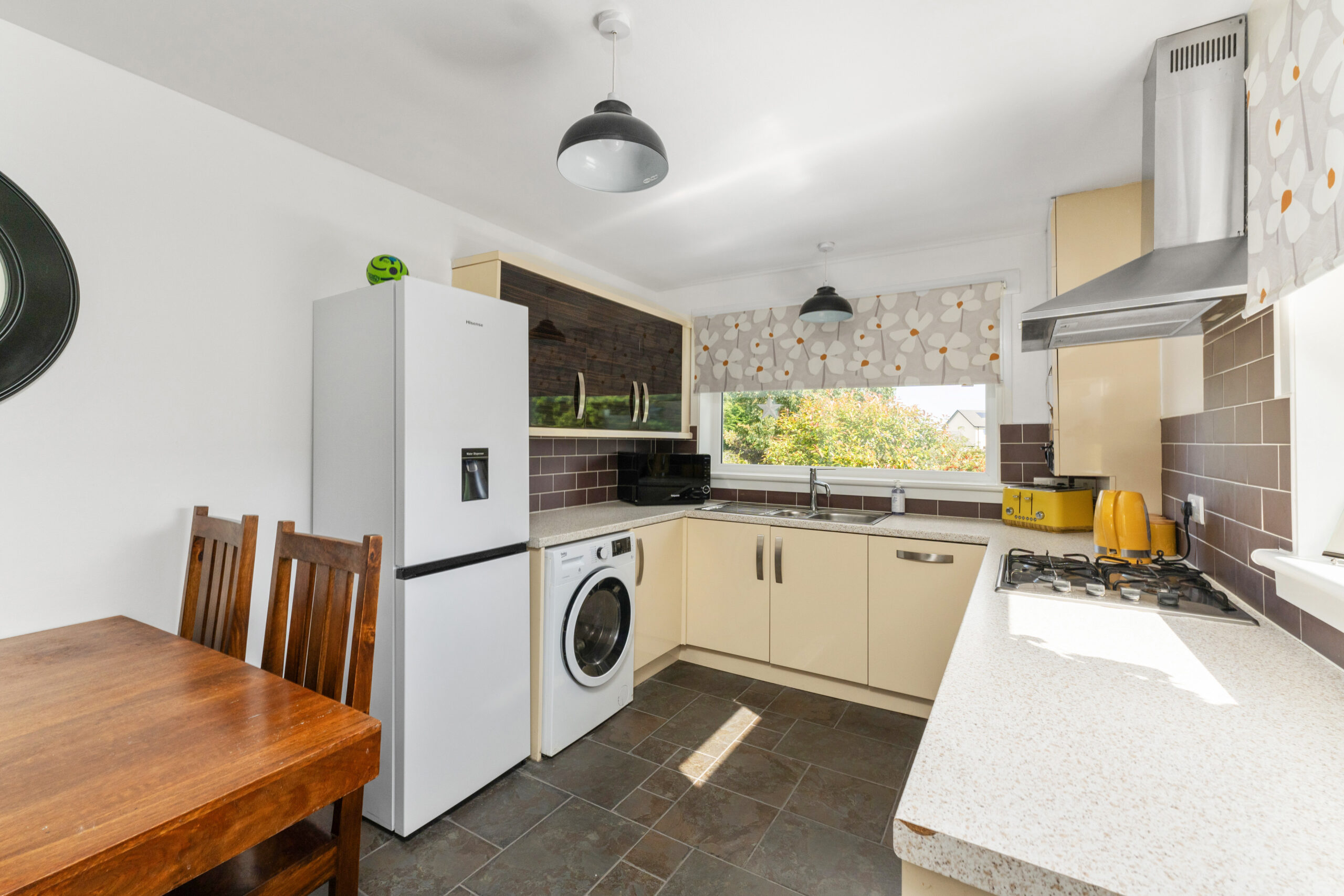 To the rear, the kitchen/diner is a culinary delight with rich cream units, complementing worktops, and chocolate-coloured metro splashback tiles. It is fully equipped with an integrated oven, hob, hood, dishwasher, and has space for a washing machine and fridge/freezer which are all included within the sale. A door from here opens to the rear garden, a tranquil retreat with mature shrubs, lawn, chipped areas, and cosy seating spots. The perfect haven for enjoying the summer months.