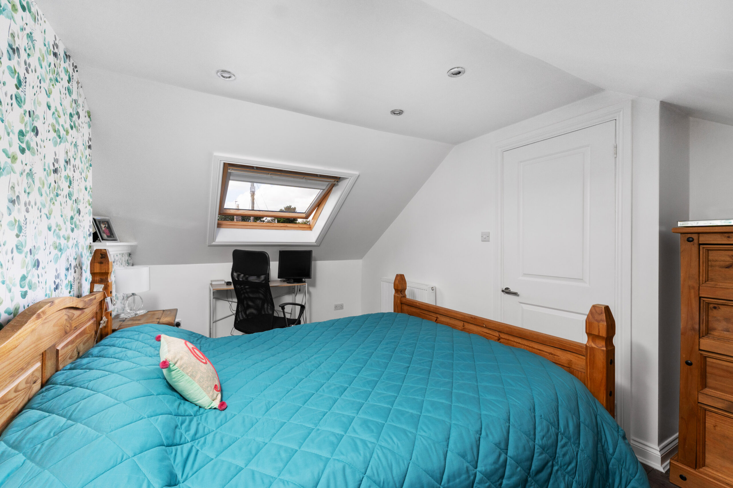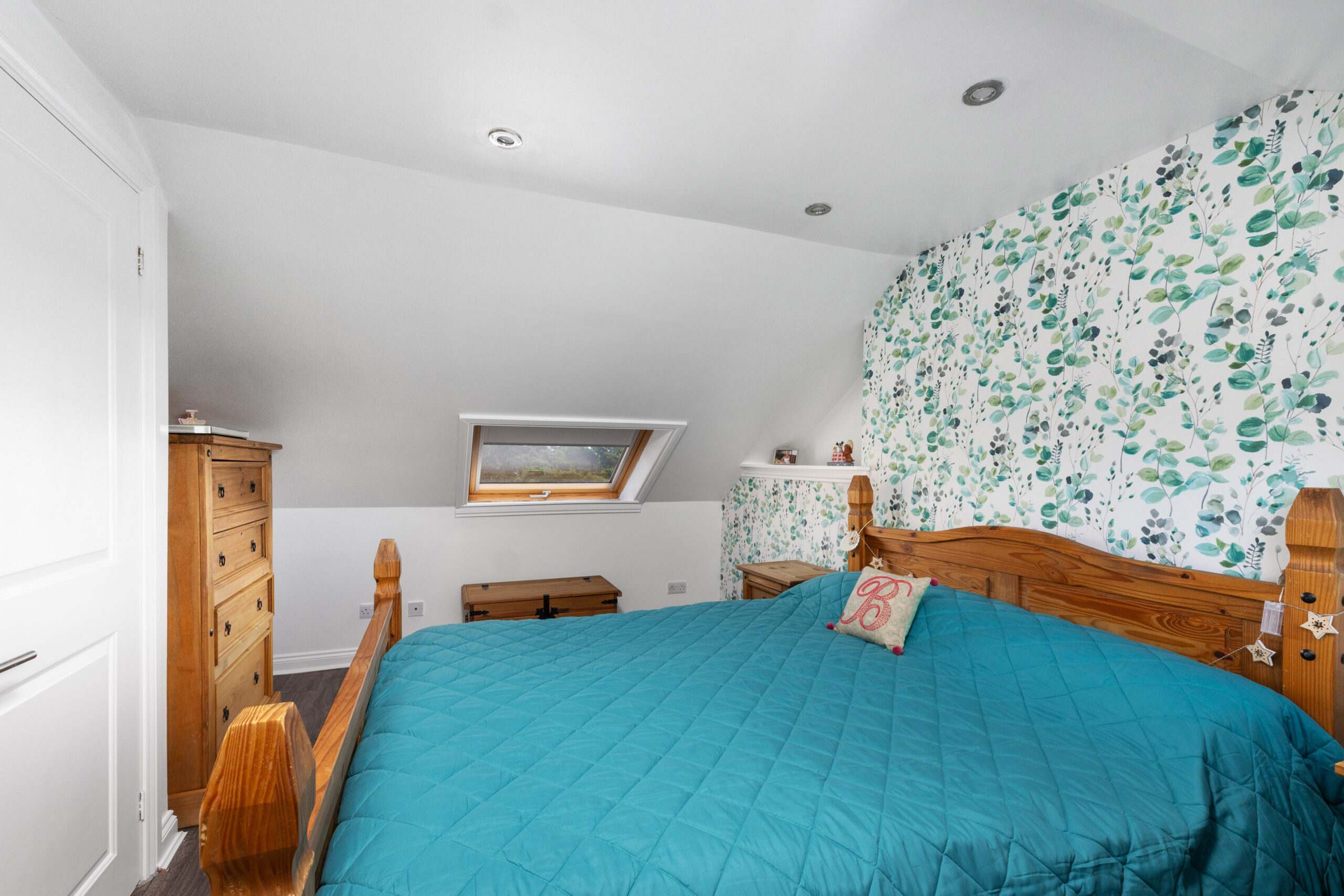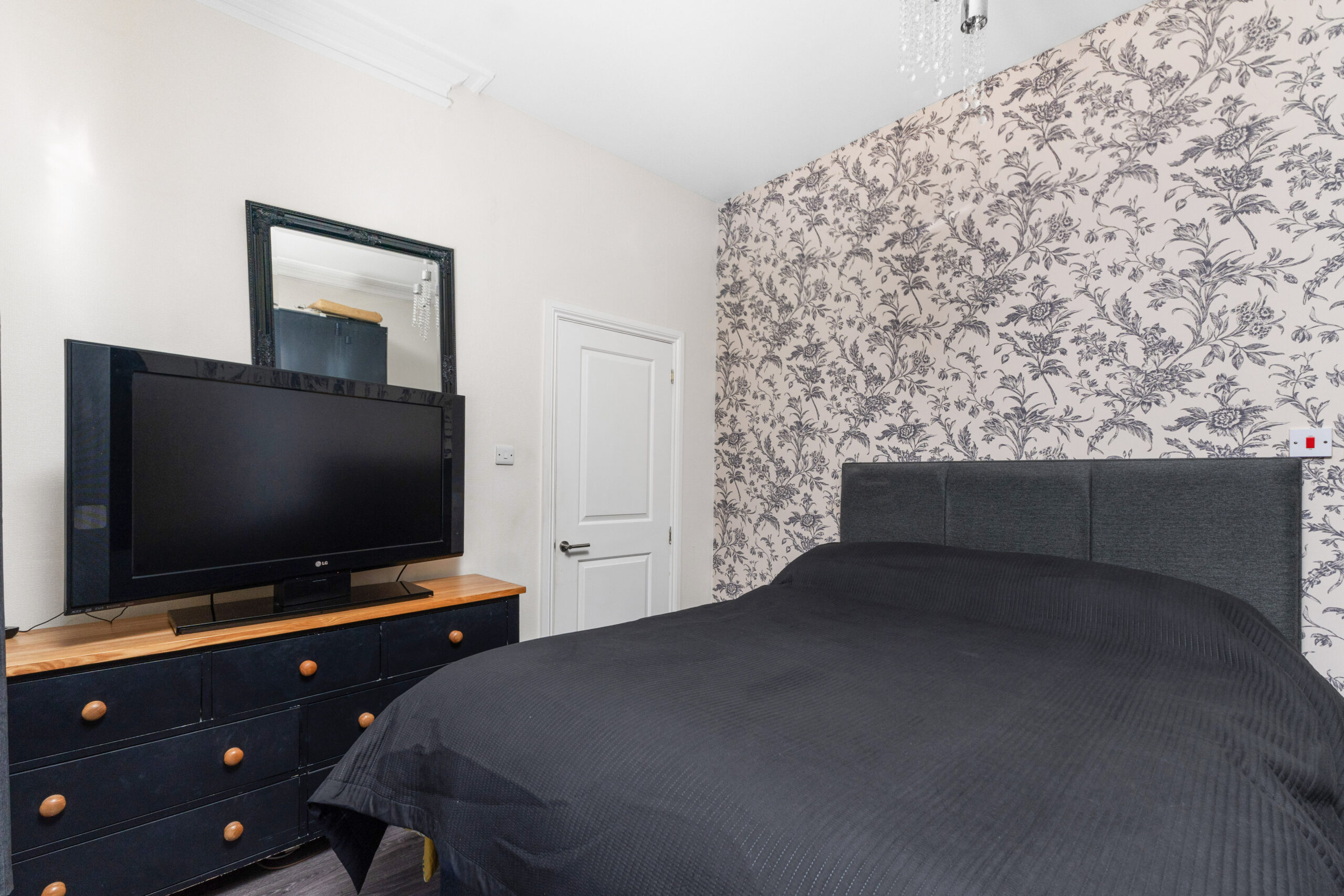 Upstair hosts a second double bedroom large enough to fit a king-sized bed and free-standing bedroom furniture. Decorated in neutral tones with a feature paper to one wall. The bathroom completes the accommodation and is finished with chic black wet wall panelling, spotlights and a heated towel rail.