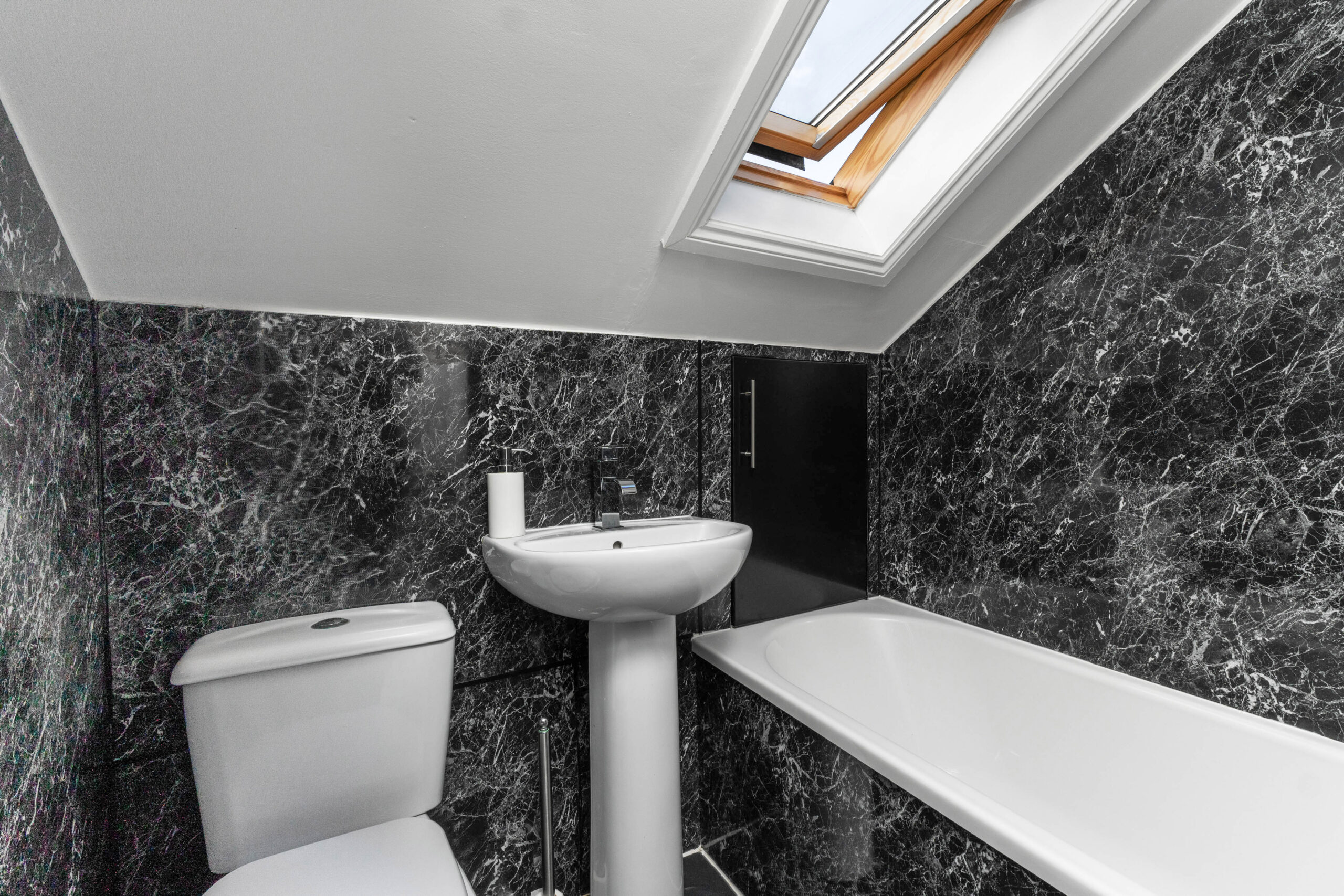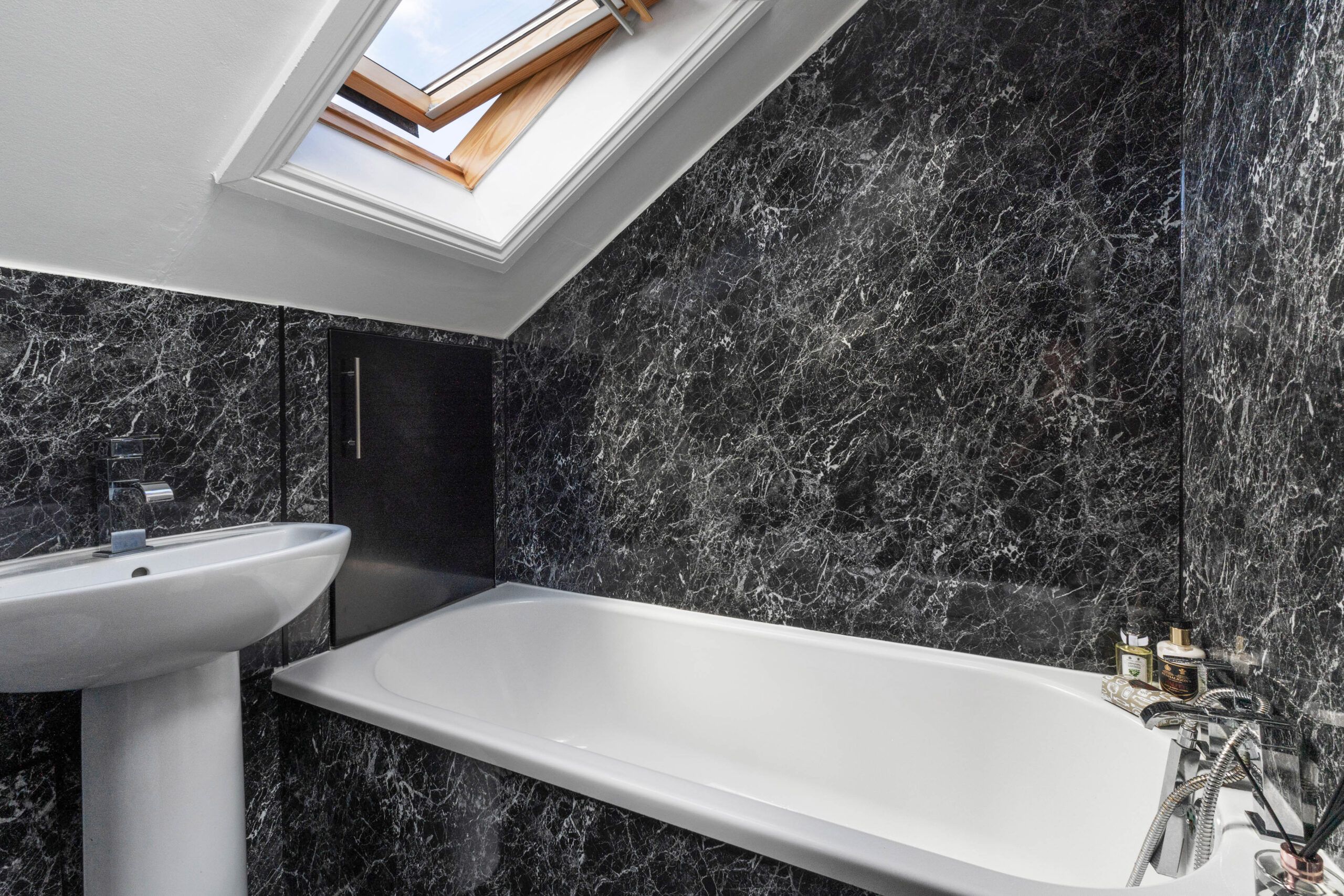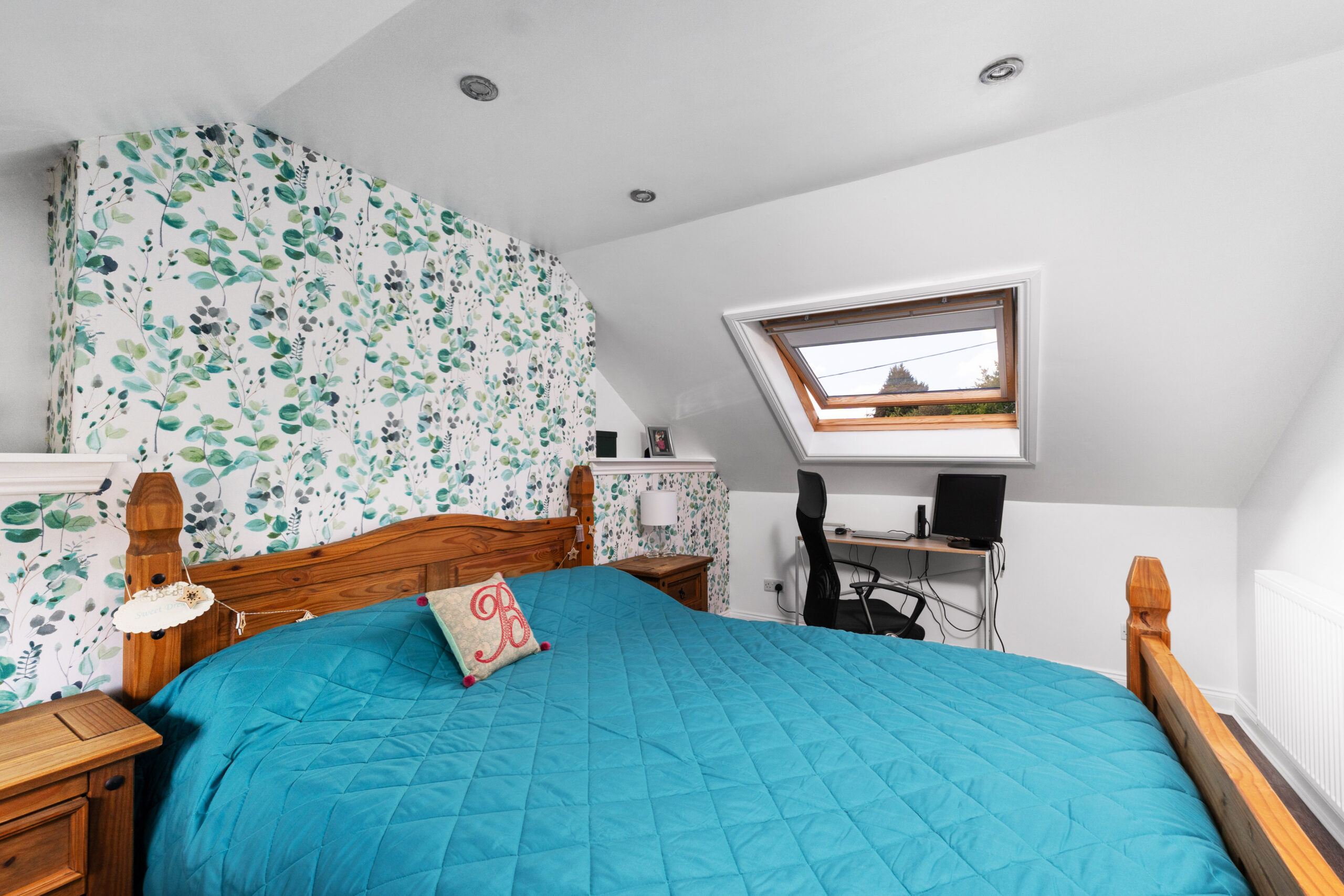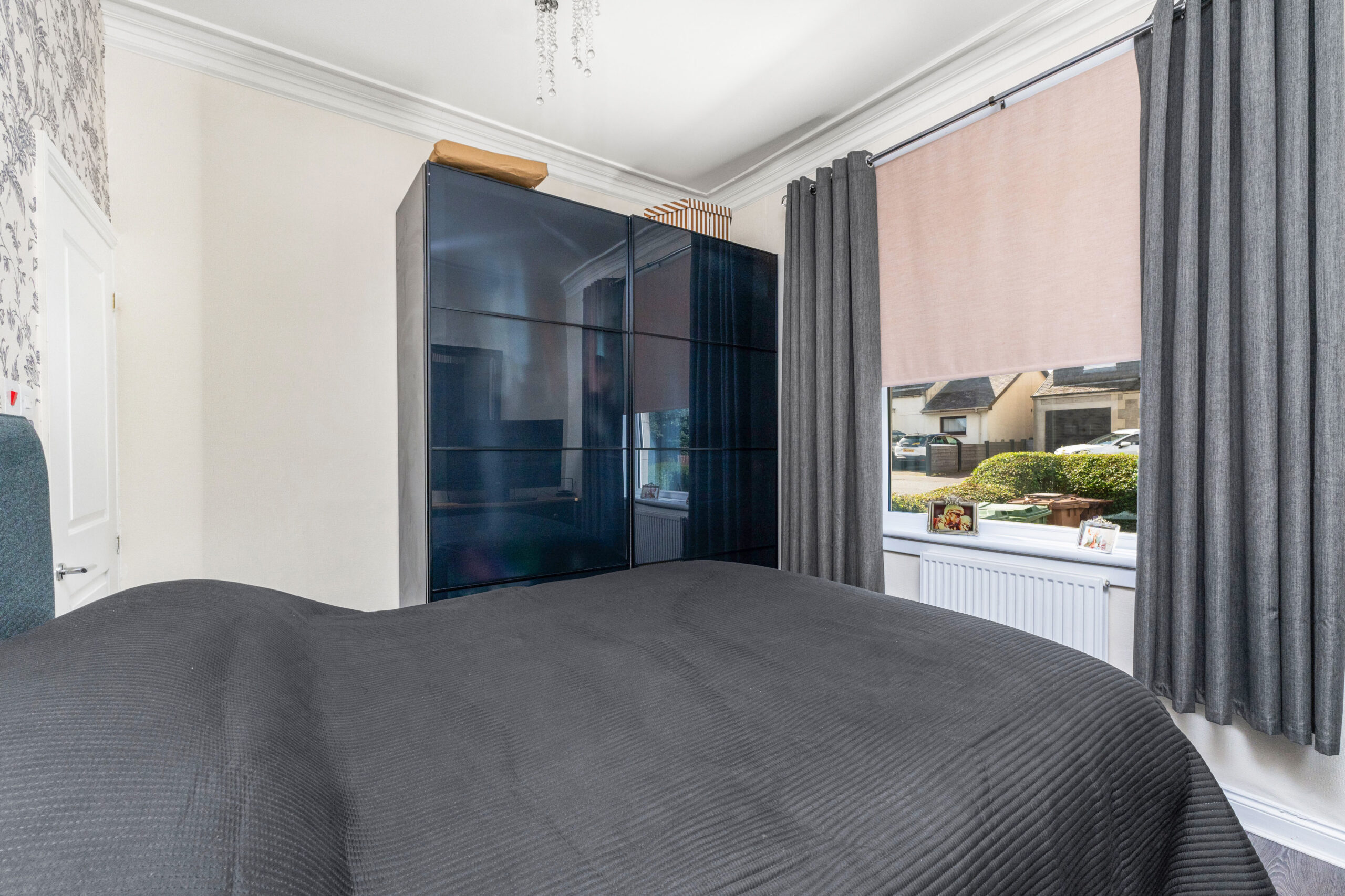 Upstair hosts a second double bedroom large enough to fit a king-sized bed and free-standing bedroom furniture. Decorated in neutral tones with a feature paper to one wall. The bathroom completes the accommodation and is finished with chic black wet wall panelling, spotlights and a heated towel rail.