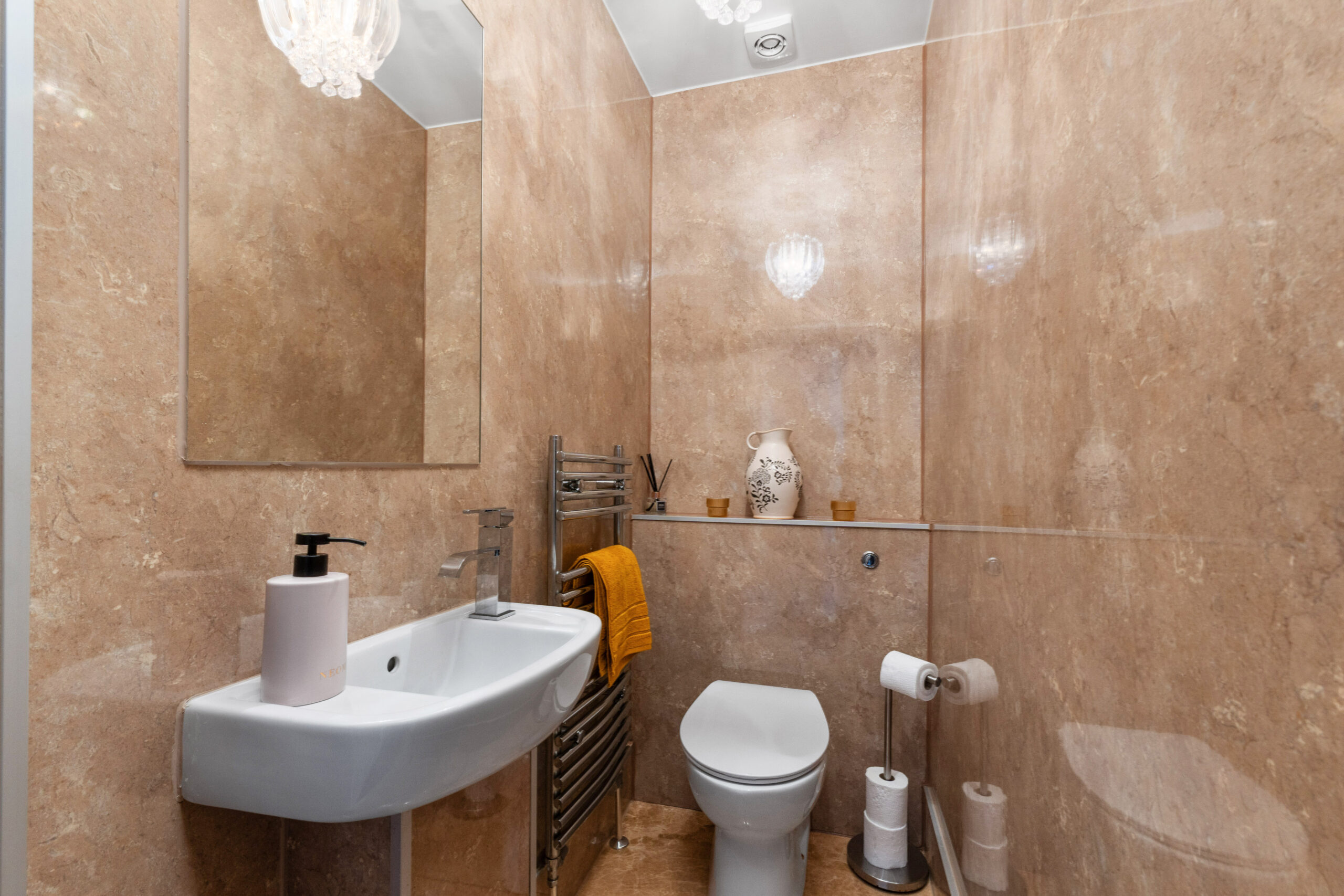 The ground floor bedroom is tastefully decorated, complete with a shower compartment with wet wall panelling, and offers space for free-standing bedroom furniture. Just outside the bedroom, you will find a conveniently located cloakroom with white w.c, sink, finished with stylish wet wall panelling.
