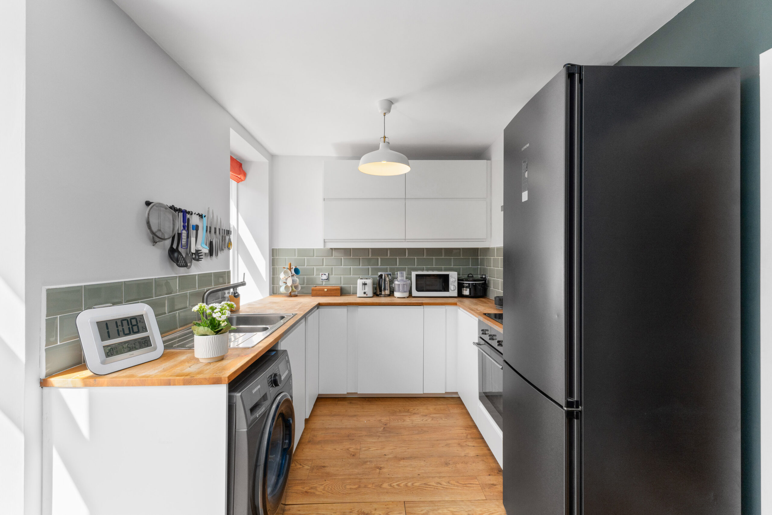 The kitchen/diner is equally appealing, offering a bright and practical space with white high-gloss base and wall units, integrated oven, hob, and hood, and space for a freestanding fridge/freezer and washing machine, all of which are included. The kitchen enjoys garden views from two windows and features stylish butcher block wooden worktops, metro-style tiled splashbacks, and ample room for a dining table and chairs. A durable laminate floor completes the look, making it both functional and inviting.