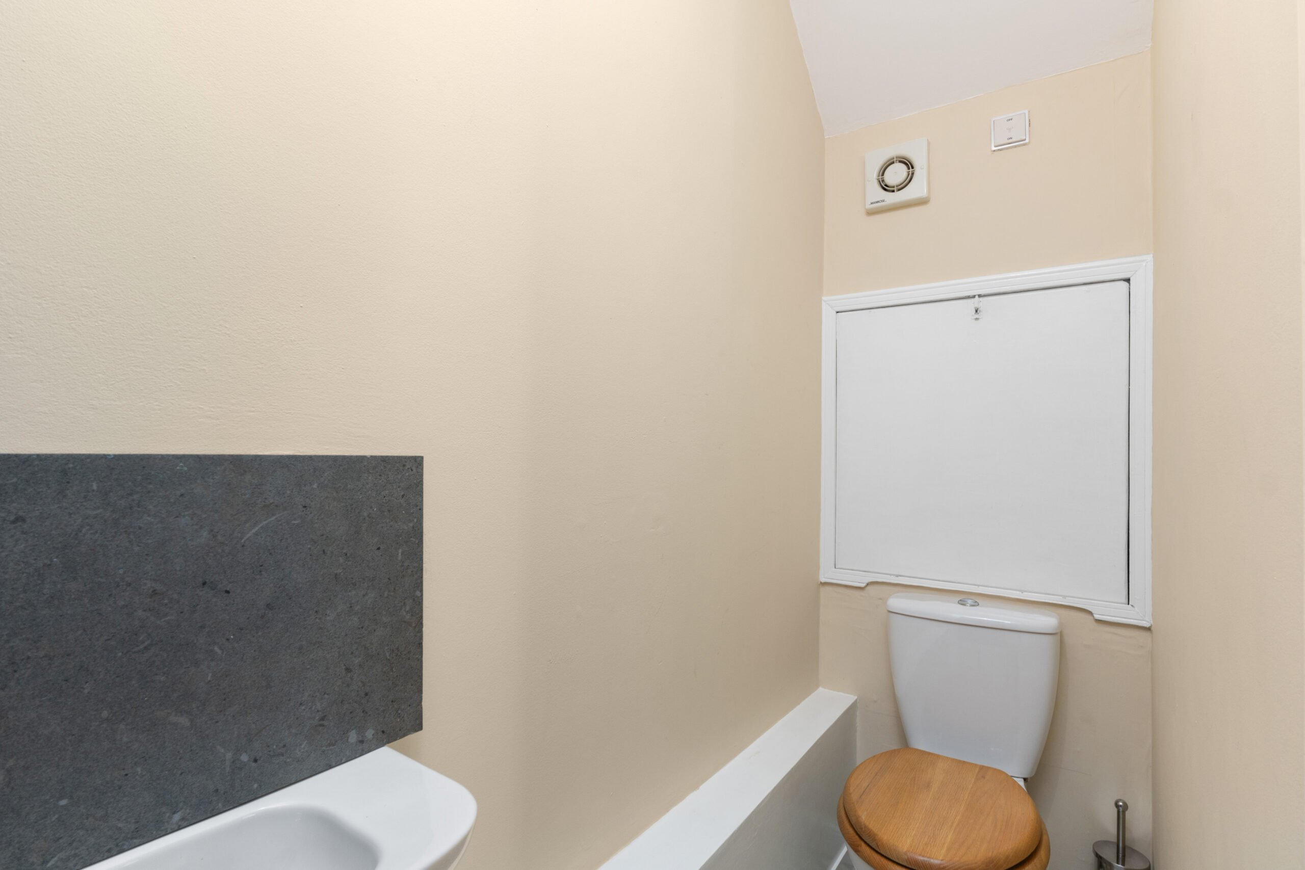The cloakroom, conveniently located on the ground floor, features a white WC and sink, with a patterned vinyl floor adding a touch of character.