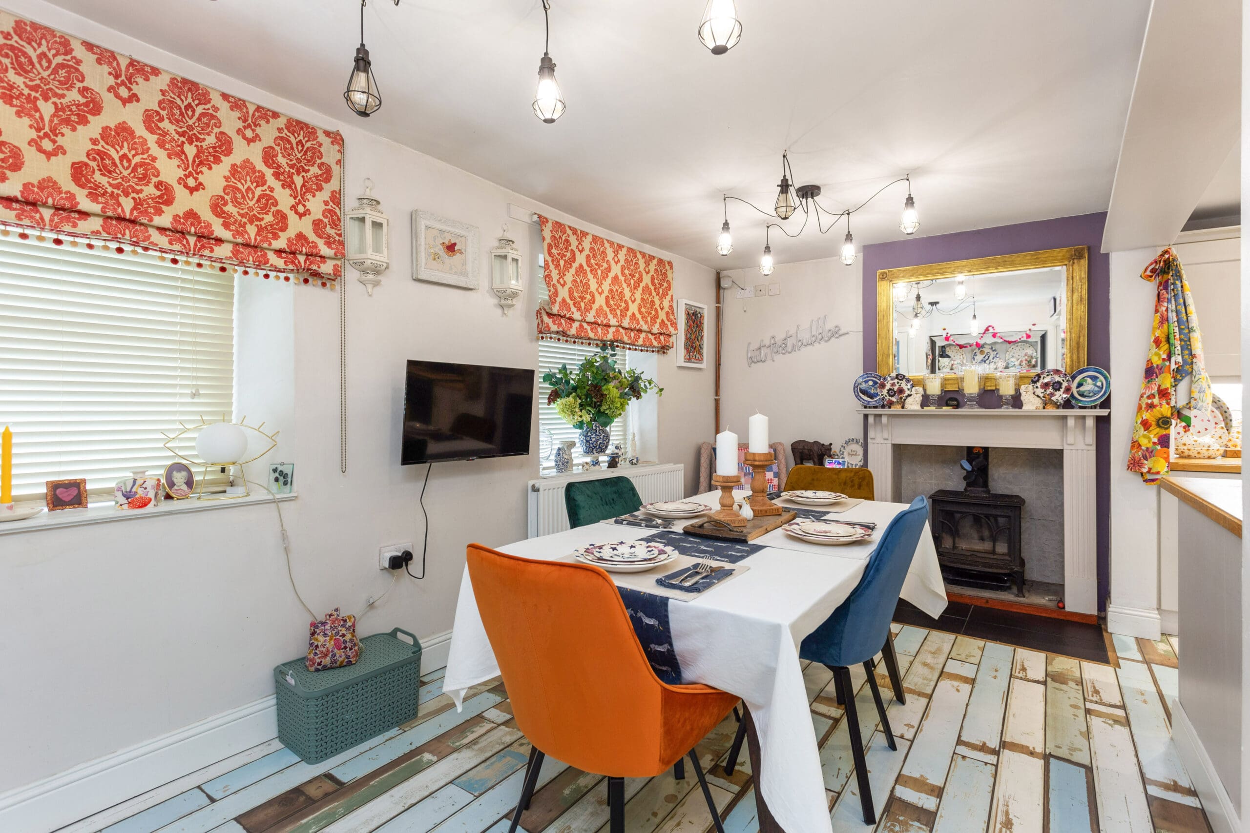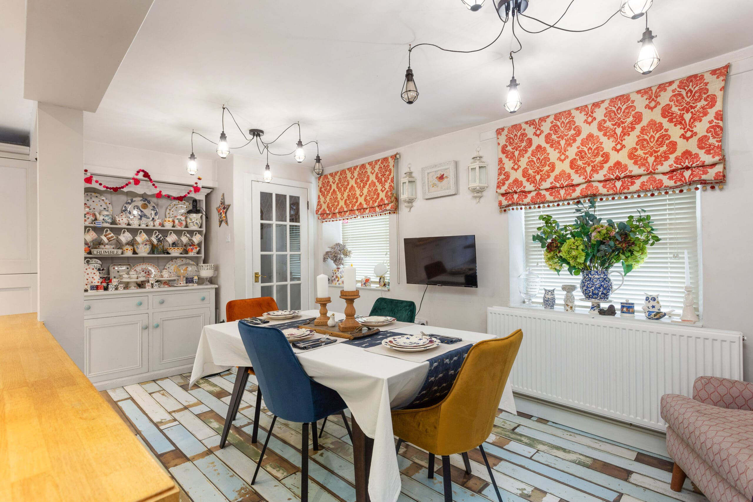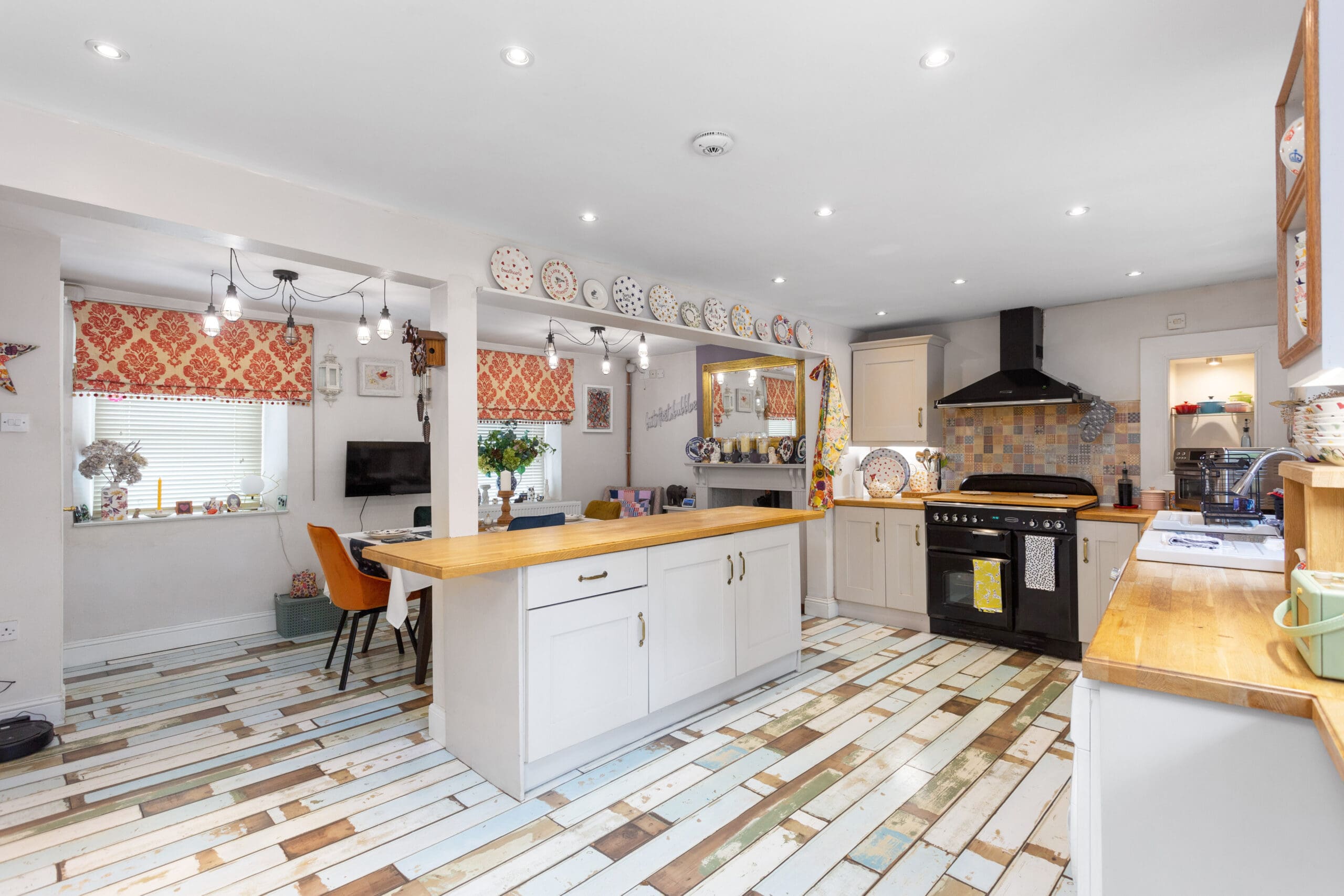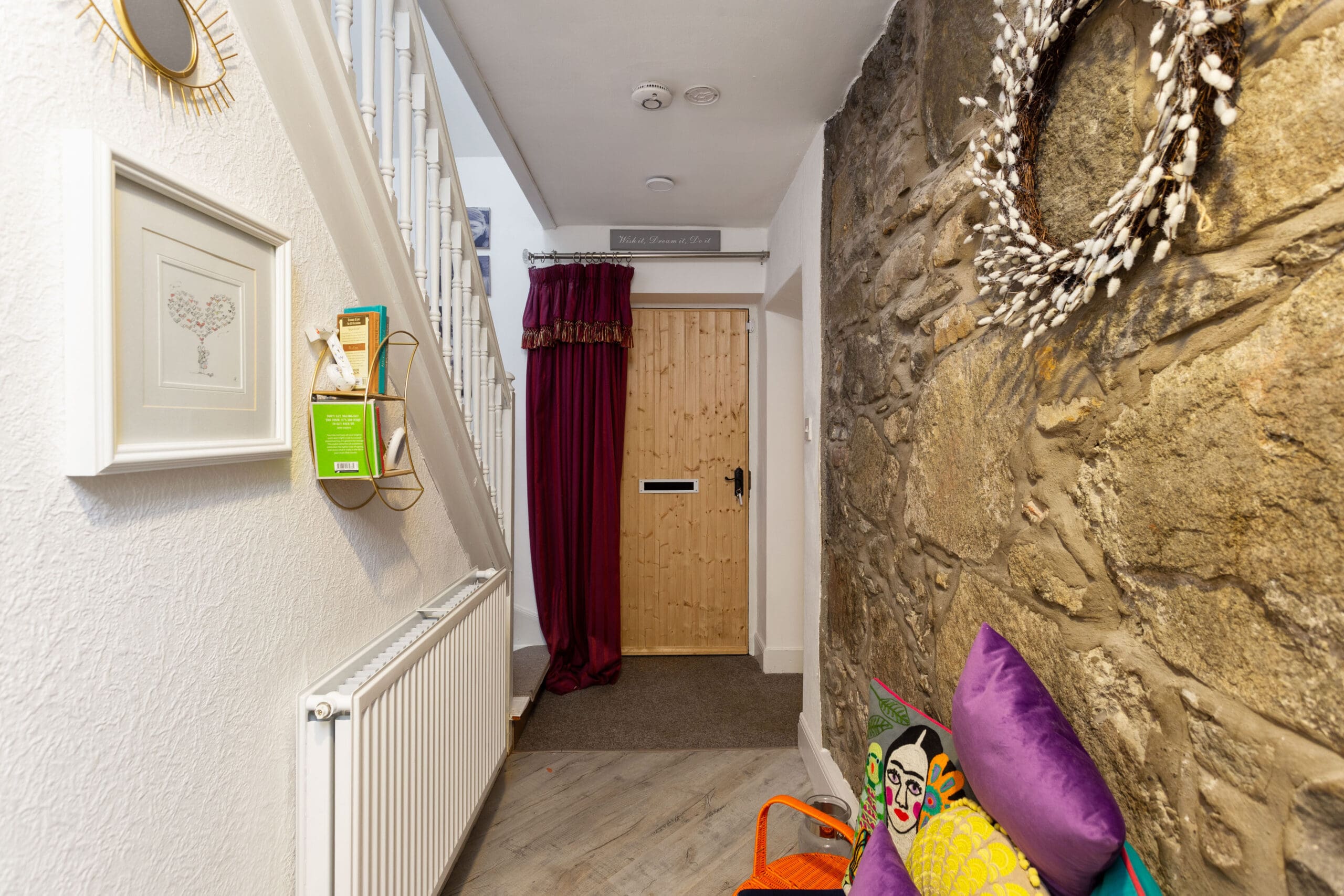 A homely green front door opens to reveal an inviting stone-brick facade, leading into an entrance hallway that serves as the gateway to a delightful ground floor space and stairs ascending to further treasures. Original stone features evoke a sense of time-honoured elegance throughout. The kitchen/dining/lounge area is where residents can enjoy a well-equipped kitchen with a 'Belfast sink', an undercounter integrated fridge and freezer, alongside a free-standing range cooker and space for a dishwasher, washing machine and dryer. The central island thoughtfully separates culinary endeavours from the adjoining relaxation space, complete with a wood burner for cosy evenings in. Door provides access to garden.