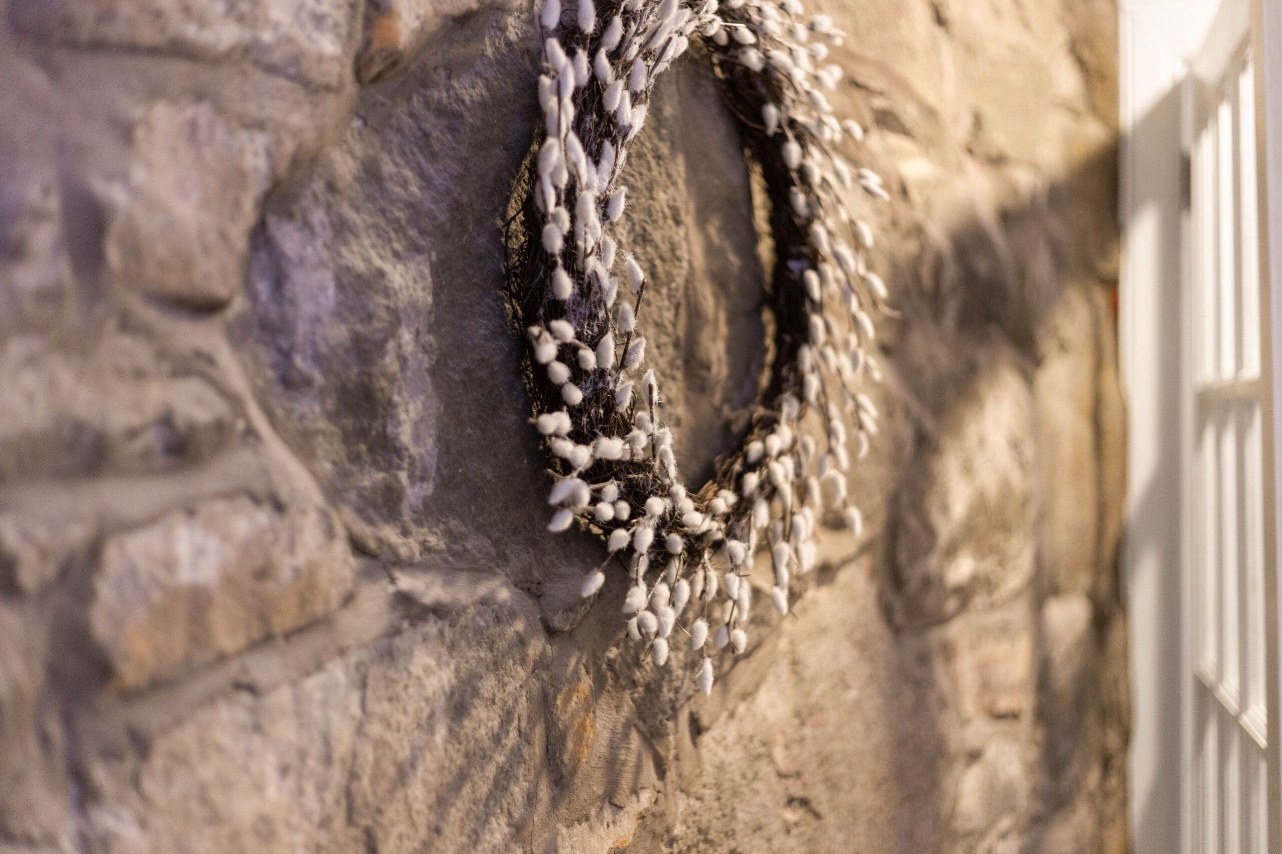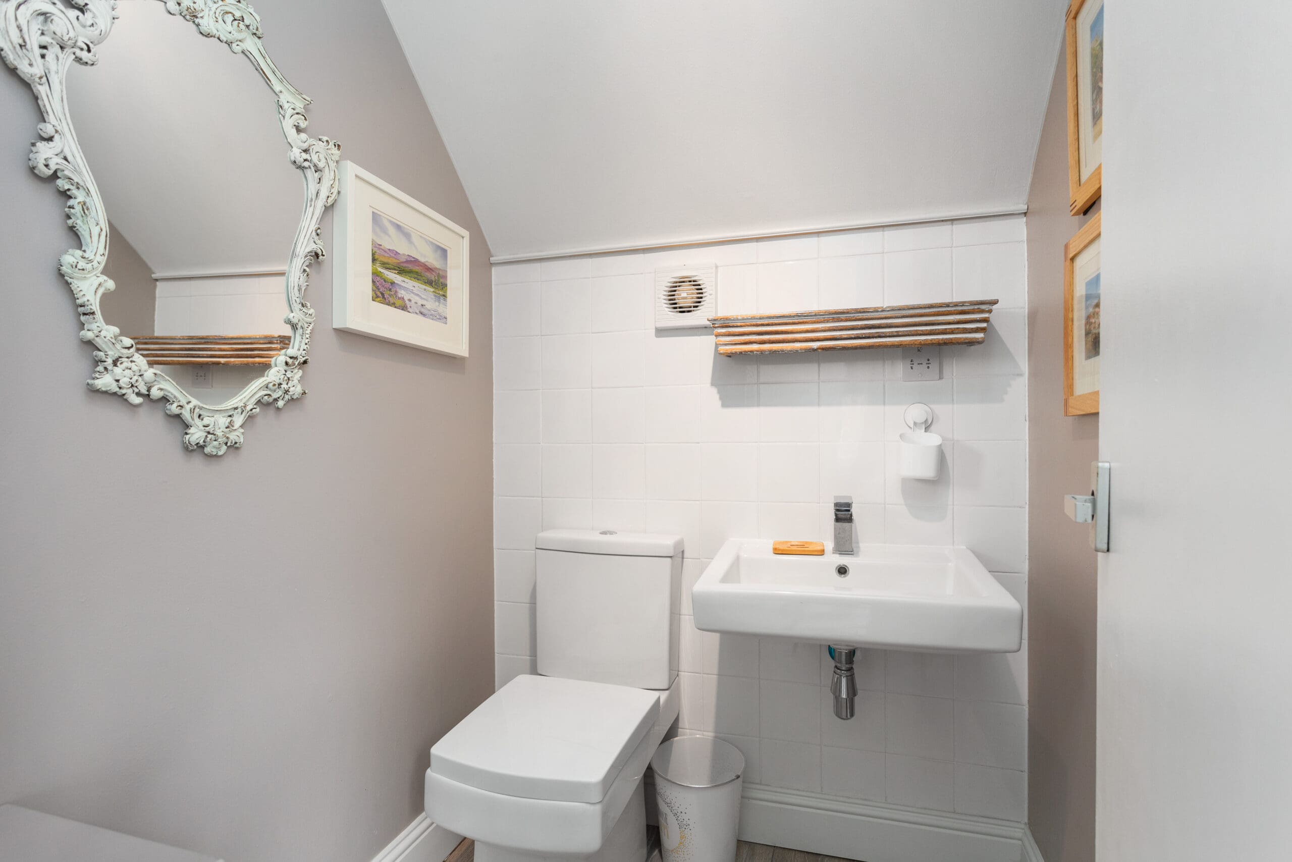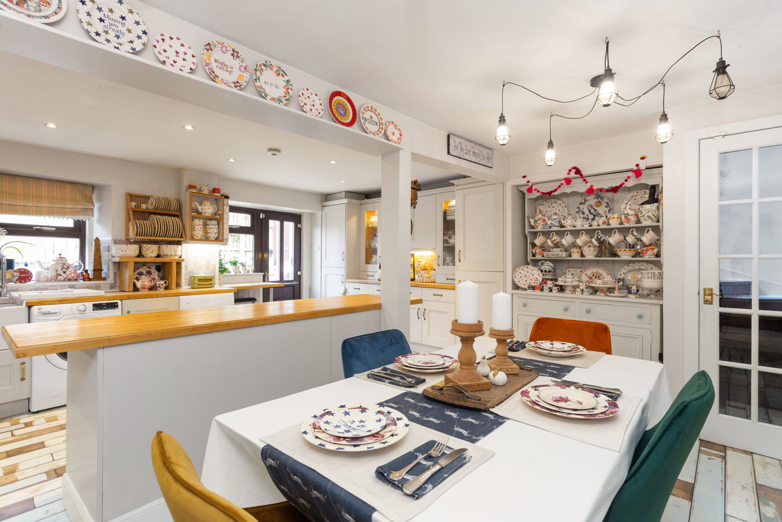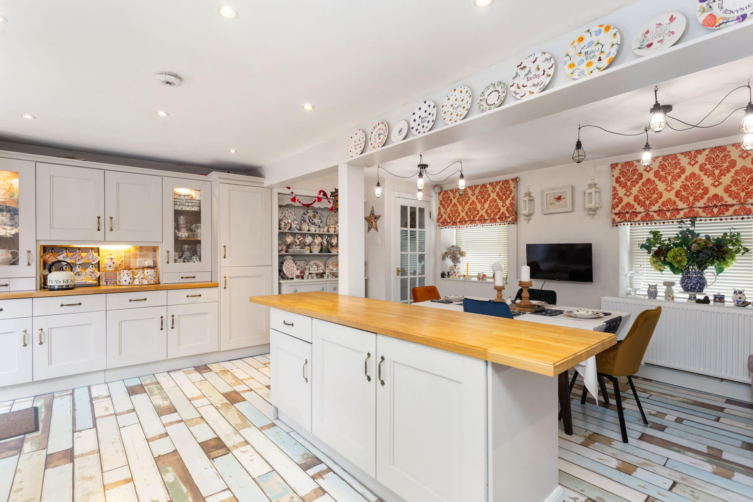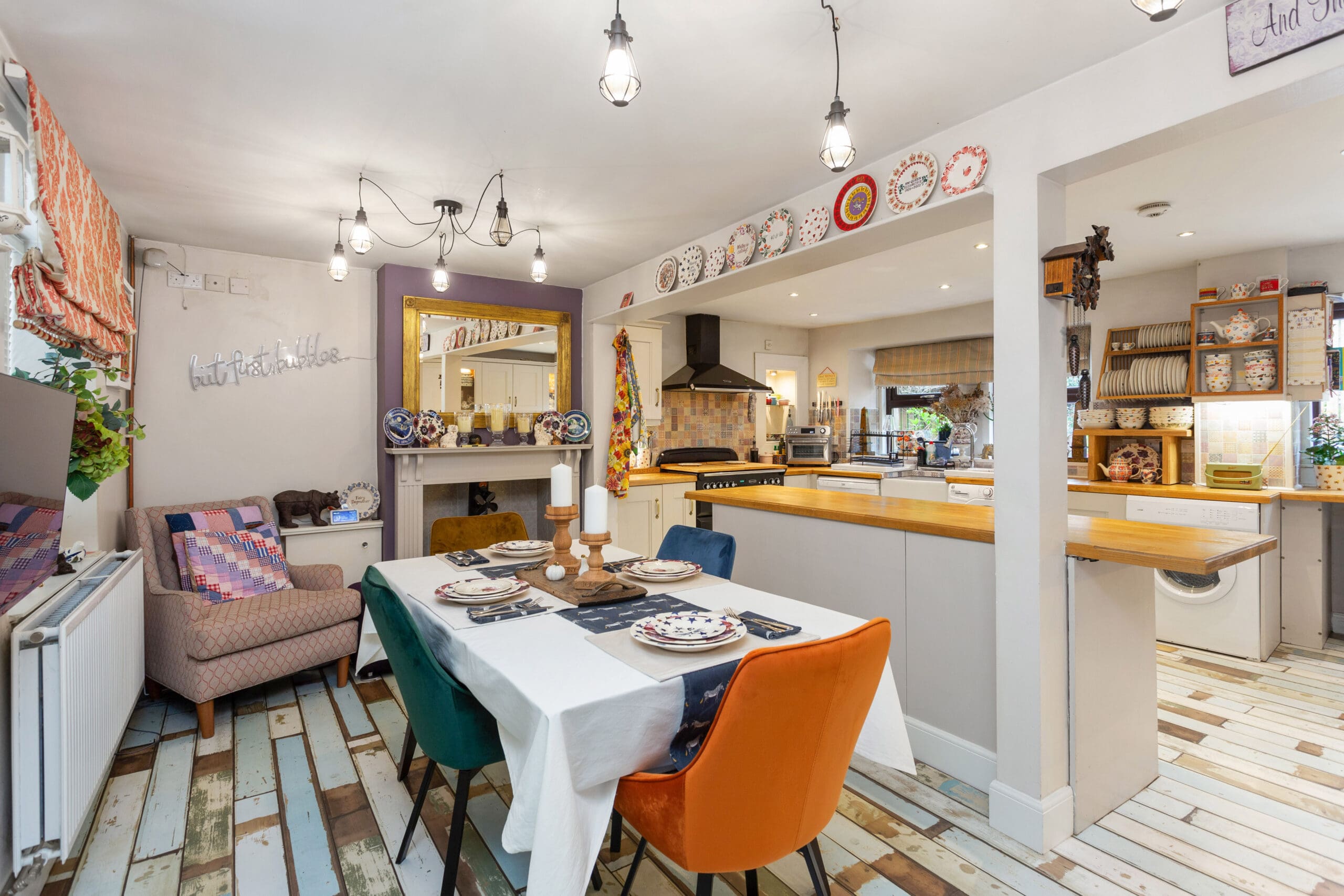 A homely green front door opens to reveal an inviting stone-brick facade, leading into an entrance hallway that serves as the gateway to a delightful ground floor space and stairs ascending to further treasures. Original stone features evoke a sense of time-honoured elegance throughout. The kitchen/dining/lounge area is where residents can enjoy a well-equipped kitchen with a 'Belfast sink', an undercounter integrated fridge and freezer, alongside a free-standing range cooker and space for a dishwasher, washing machine and dryer. The central island thoughtfully separates culinary endeavours from the adjoining relaxation space, complete with a wood burner for cosy evenings in. Door provides access to garden.