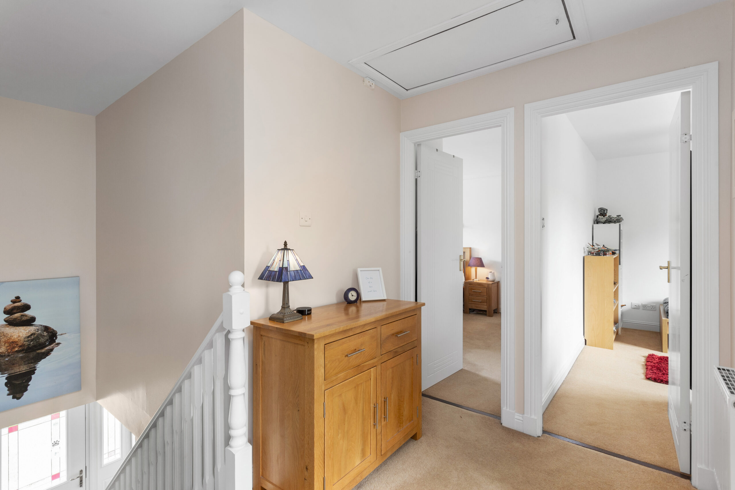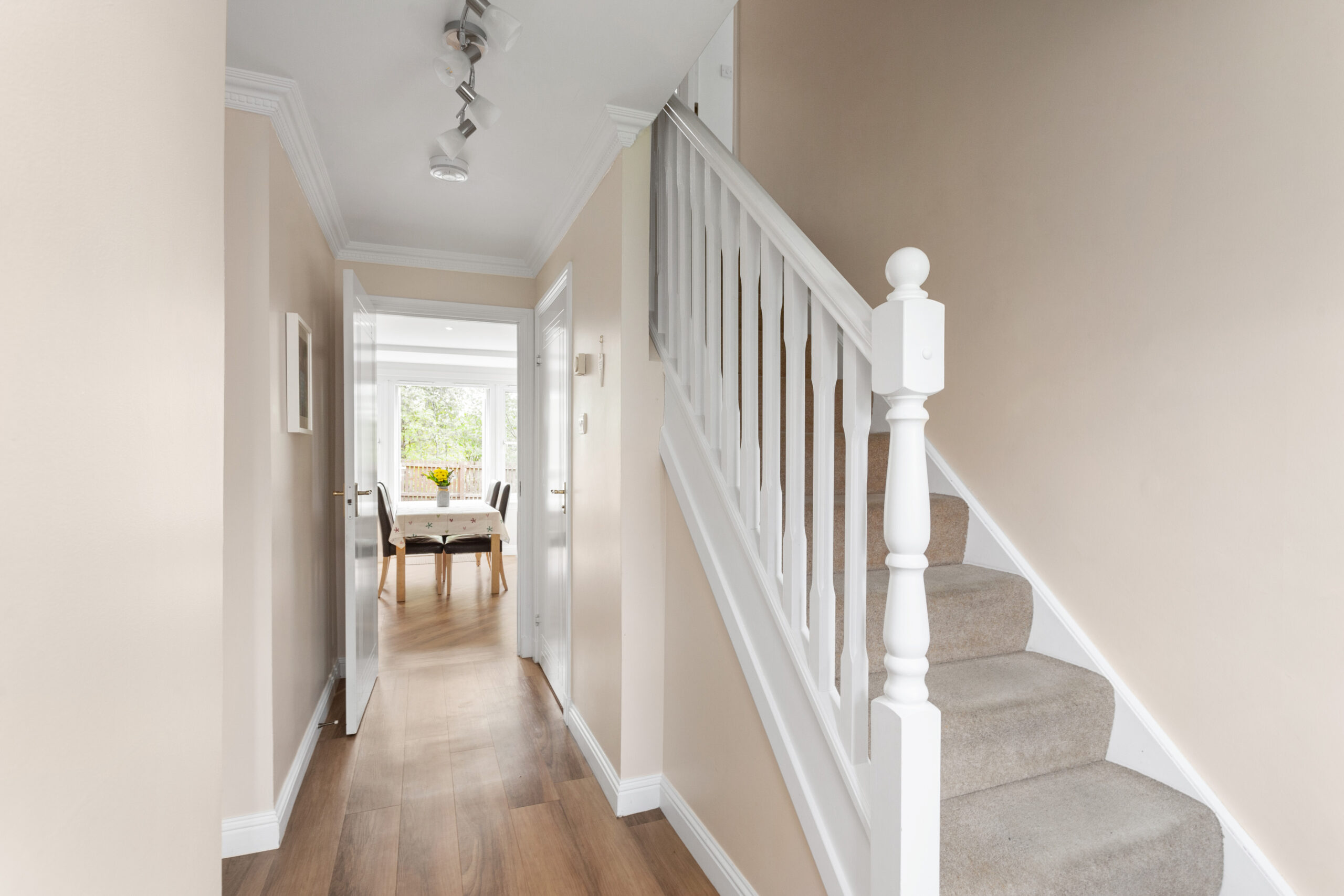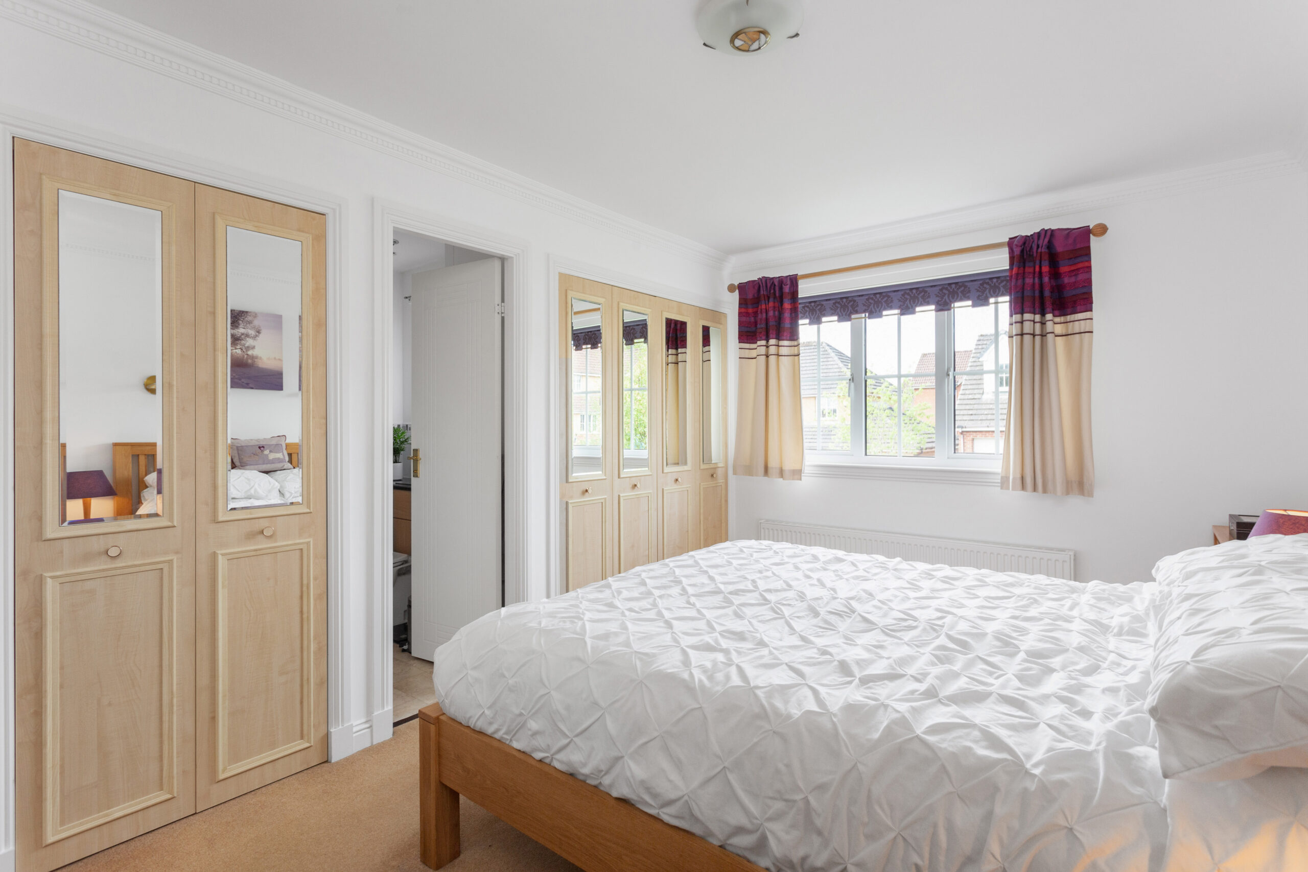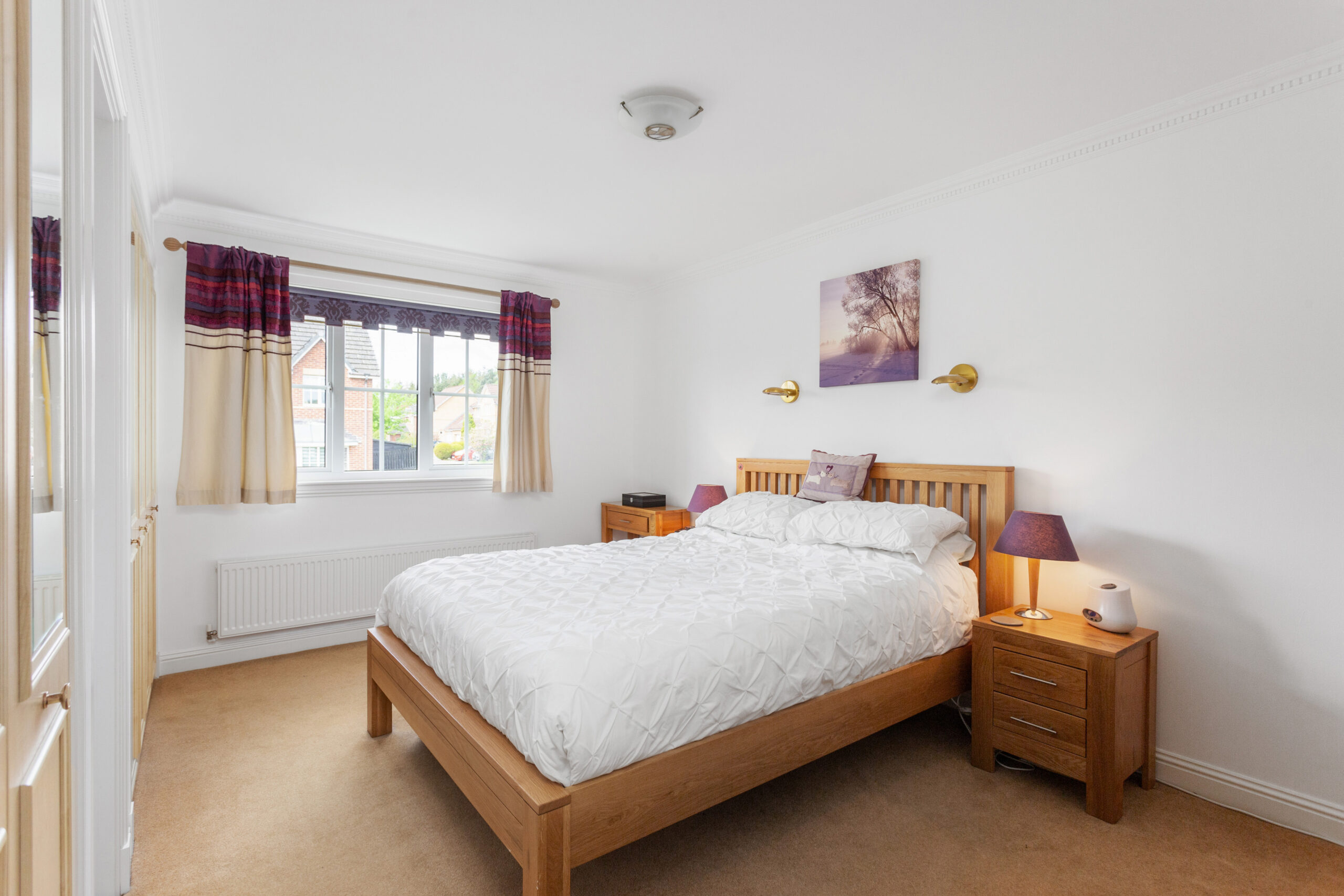Ascending the carpeted staircase reveals four sumptuous bedrooms, each presenting a fresh, move-in-ready canvas. The master bedroom, a serene retreat, currently houses a king size bed and enjoys double fitted wardrobes and an en suite shower room with crisp splashback tiles. All three other bedrooms are of sizeable proportions and equally as fresh and inviting. The family bathroom with its three-piece suite and shower caters to the rest of the household.