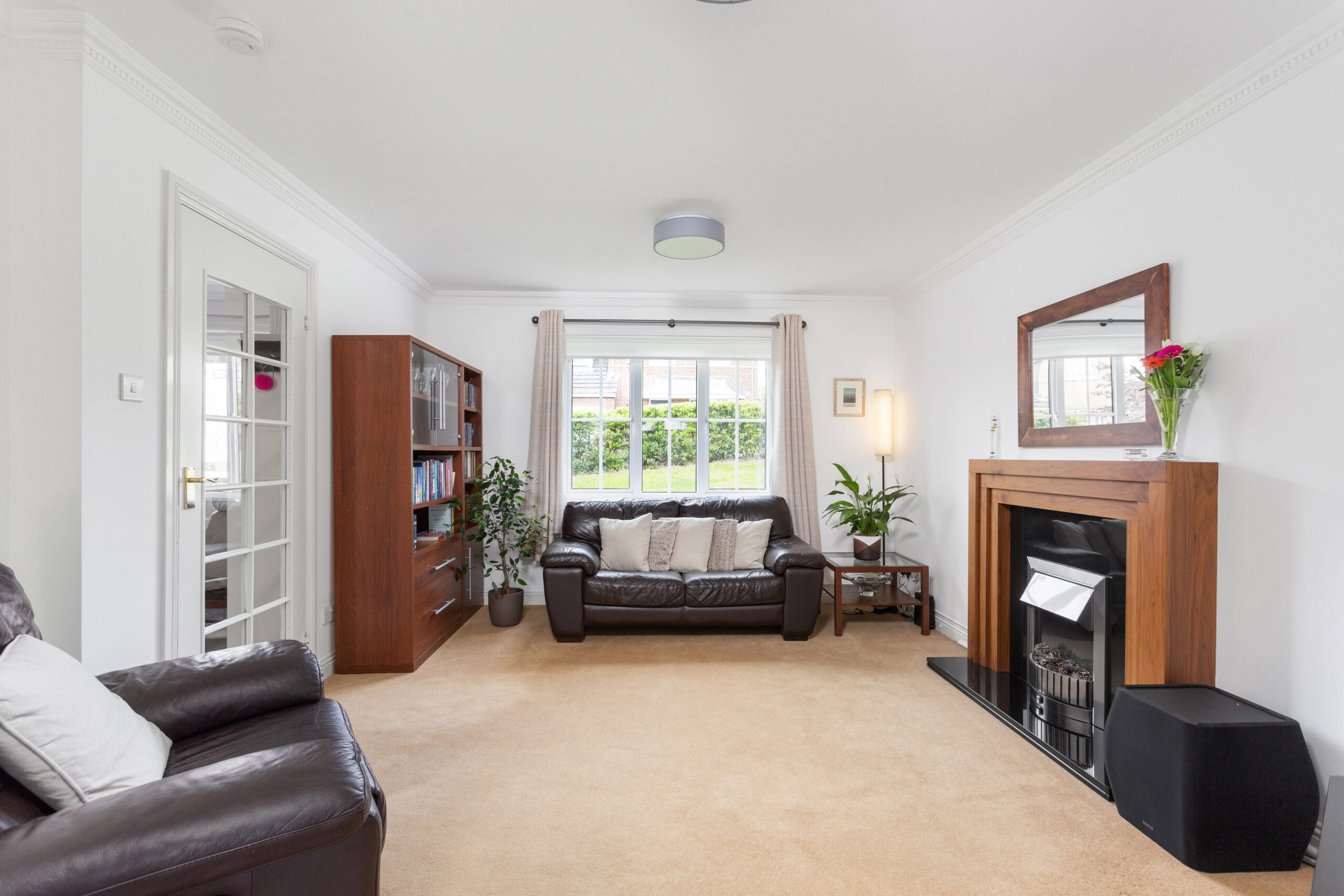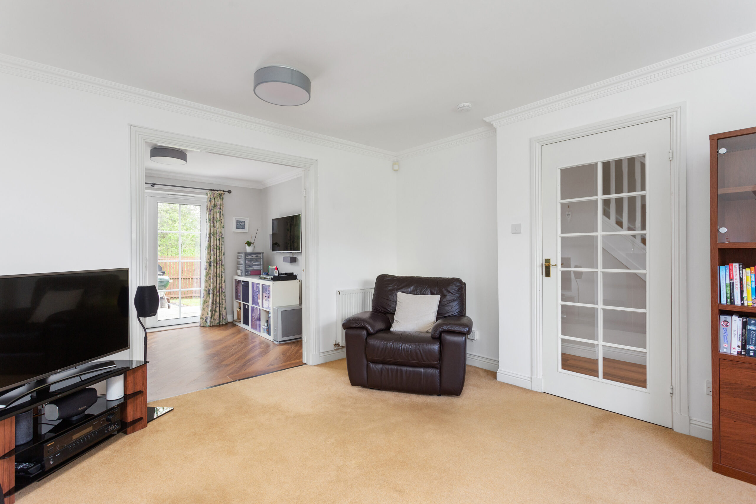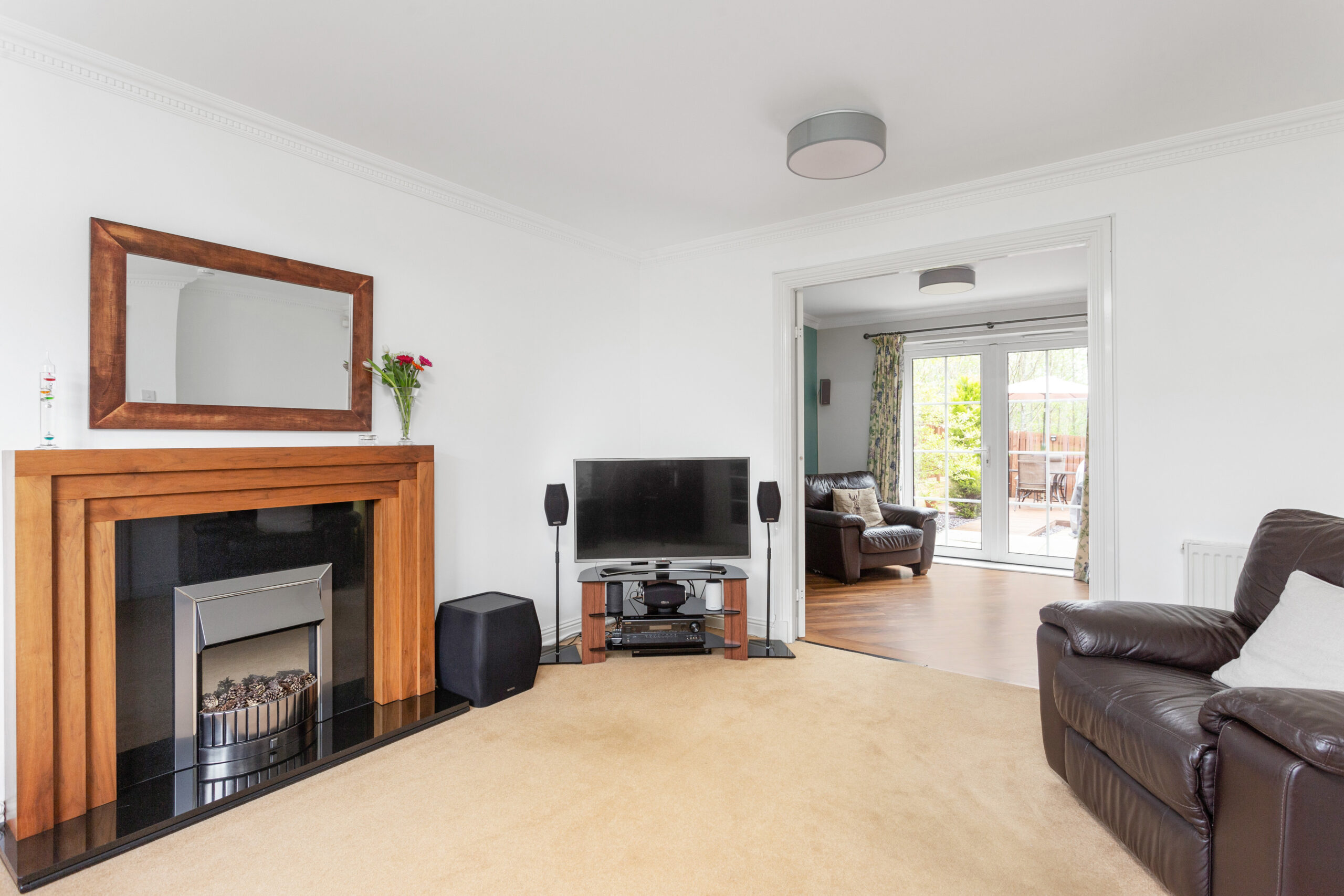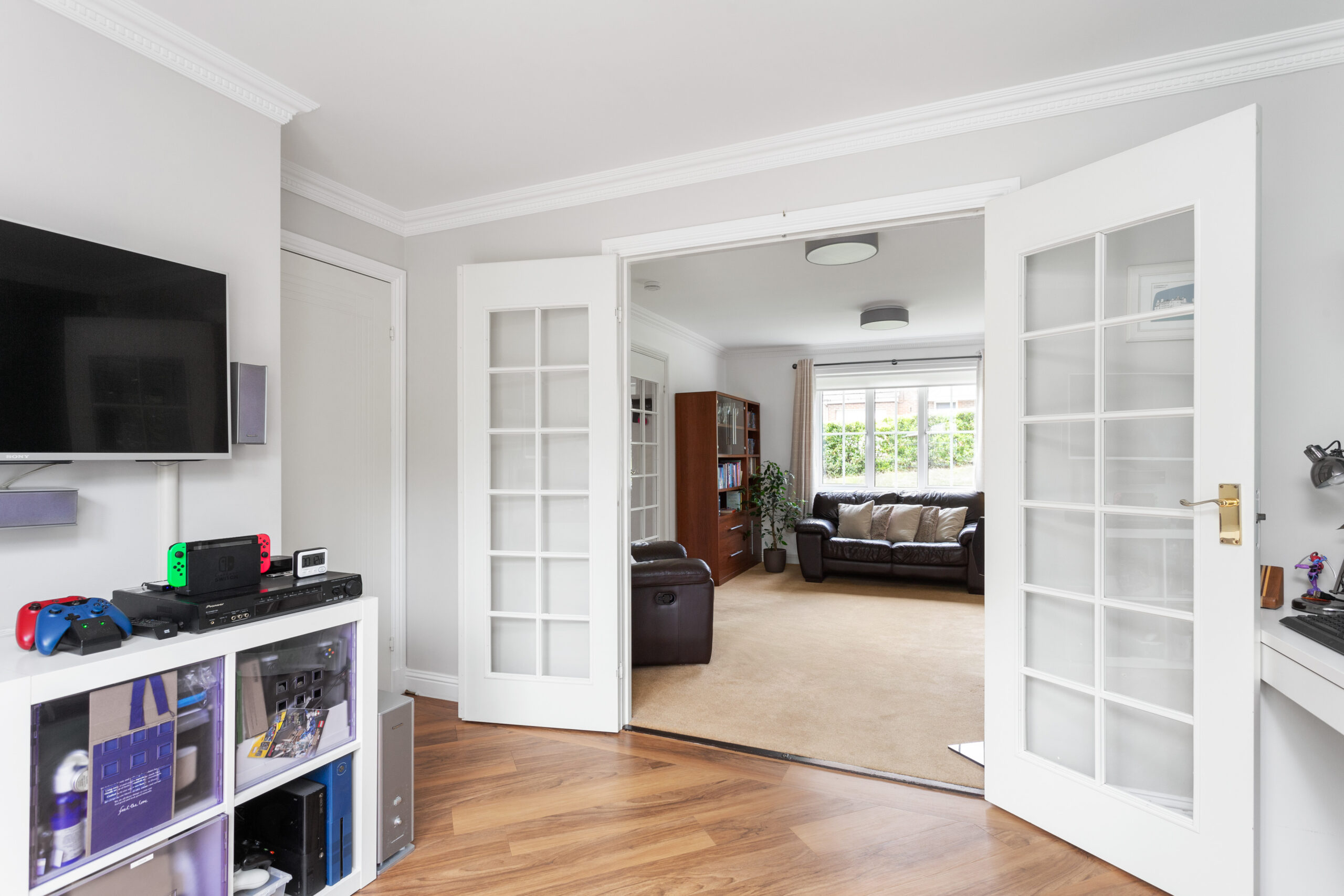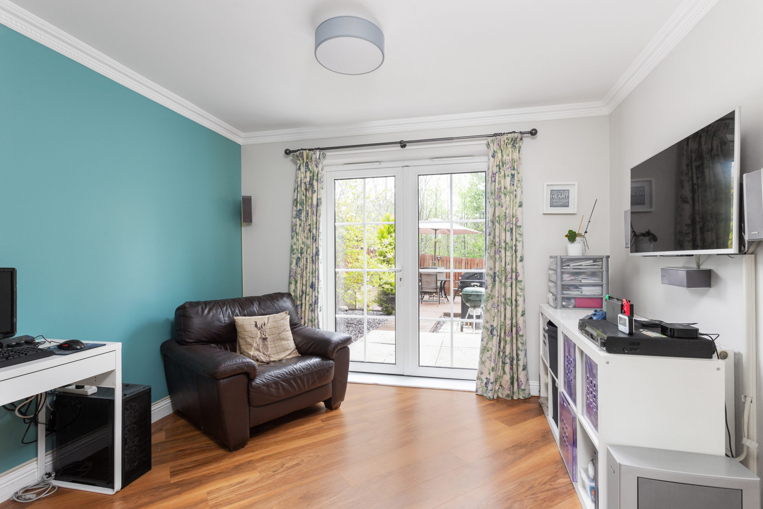 A front-facing lounge boasts an electric fireplace and a stone hearth, a relaxing room for enjoying cosy nights in with friends and family. Double doors open to a versatile family room, perfect as a second reception, office, or playroom. Doors open out to the well-presented rear garden and the adjoining kitchen flows seamlessly.